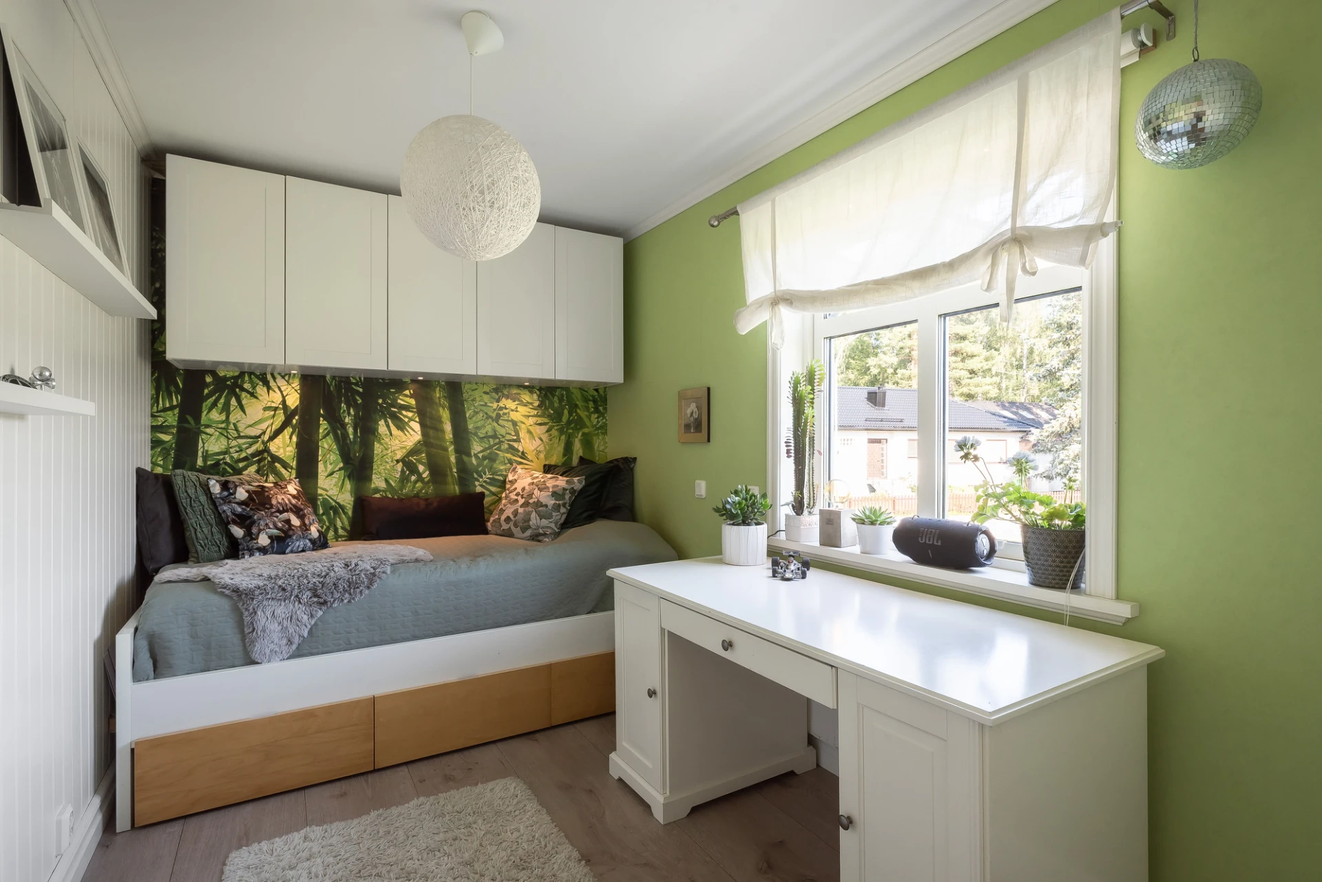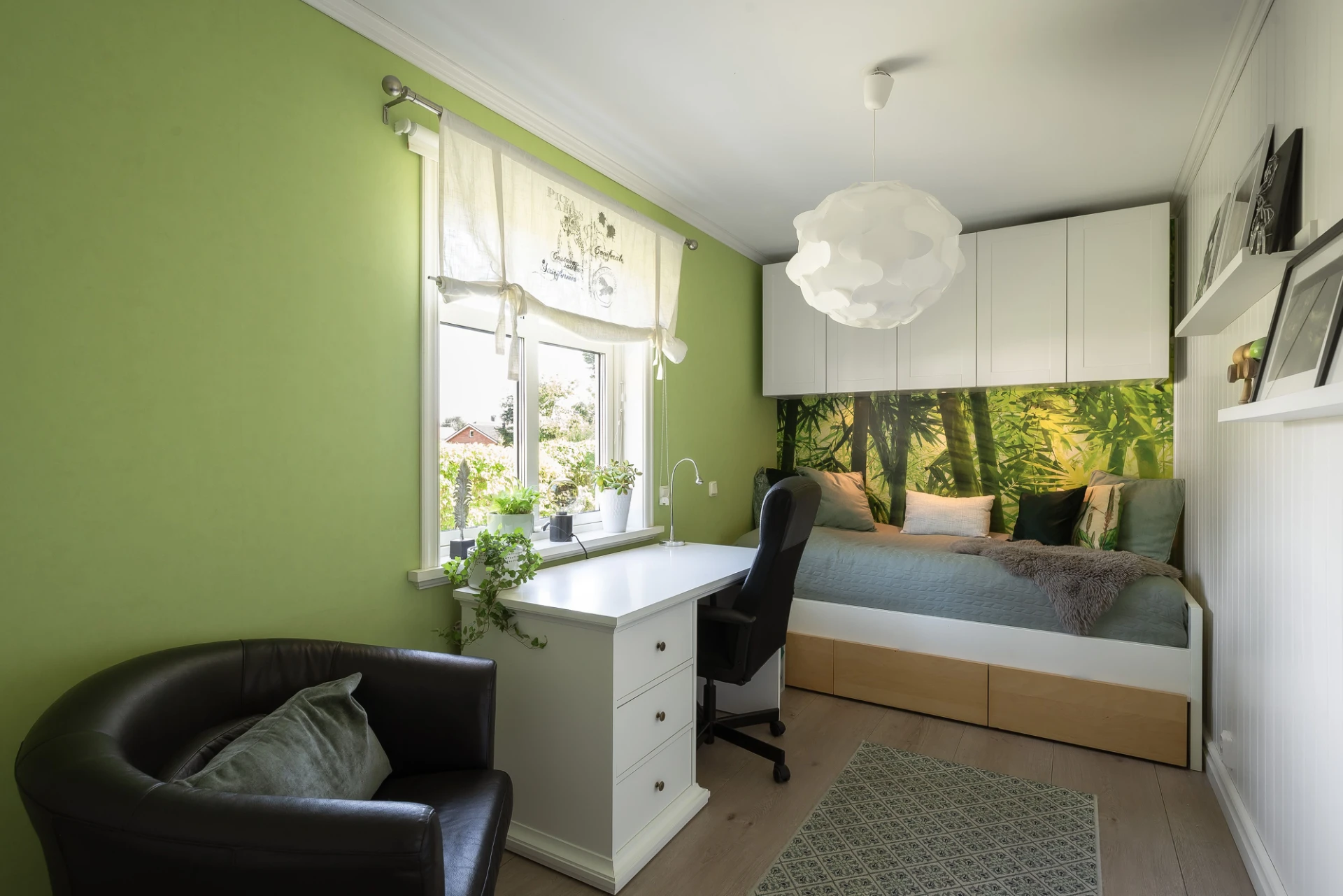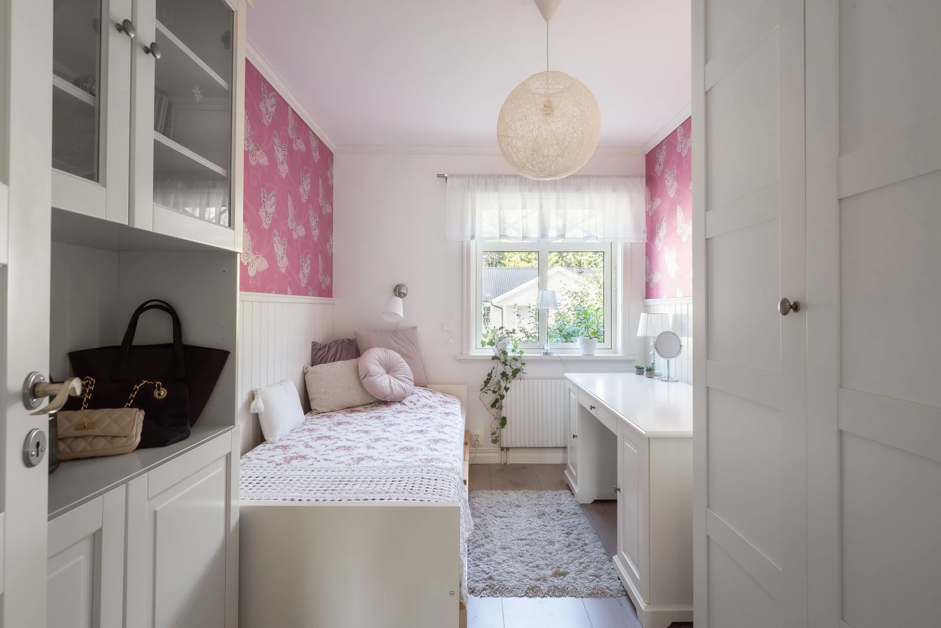 Platsbyggd dubbelgarderob och förvaringsskåp ovan säng med inbyggda spotlights Väggpanel i pärlspont. Laminatgolv och tapetserade väggar. Stämningsfulla spotlights i fönstersmygen.