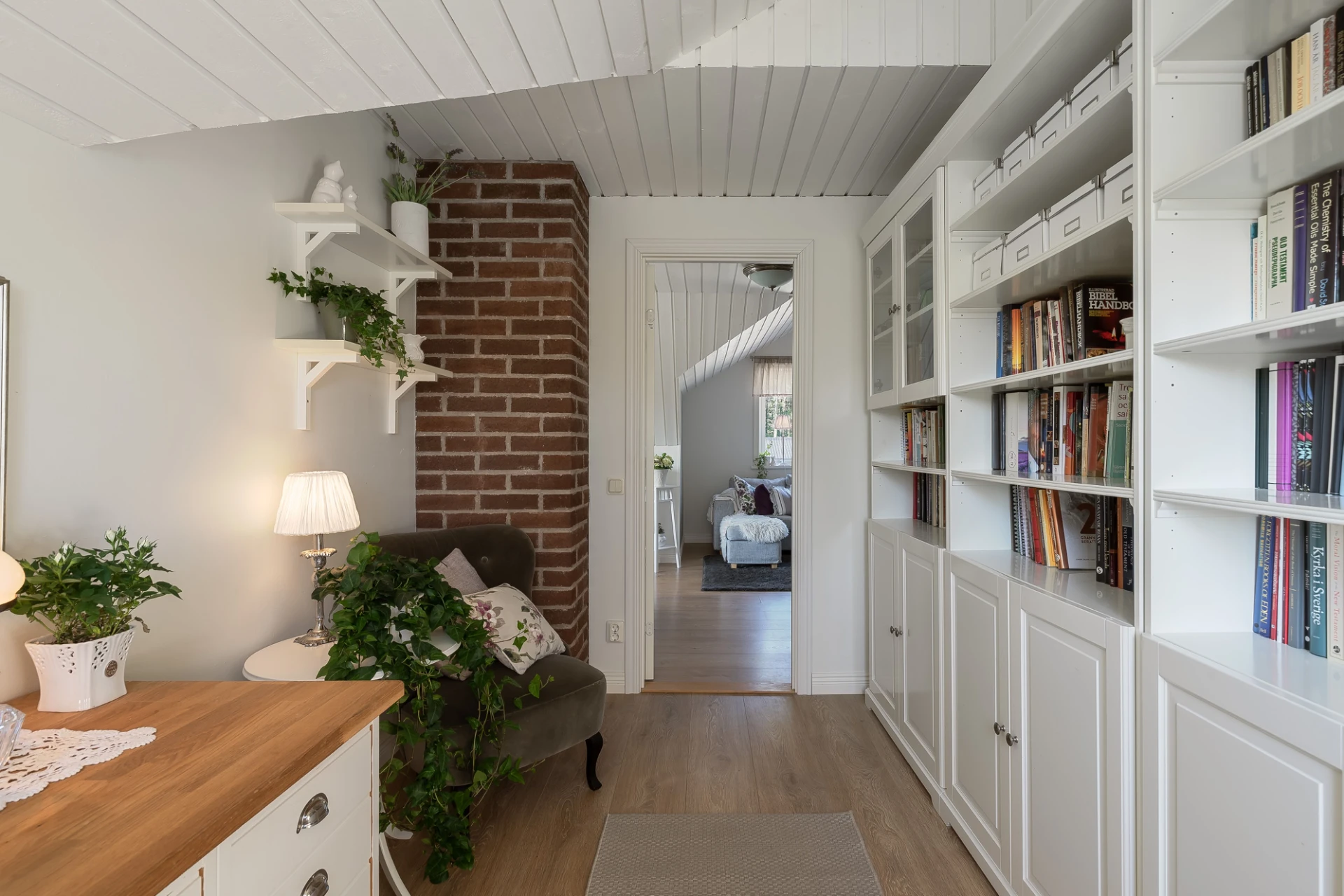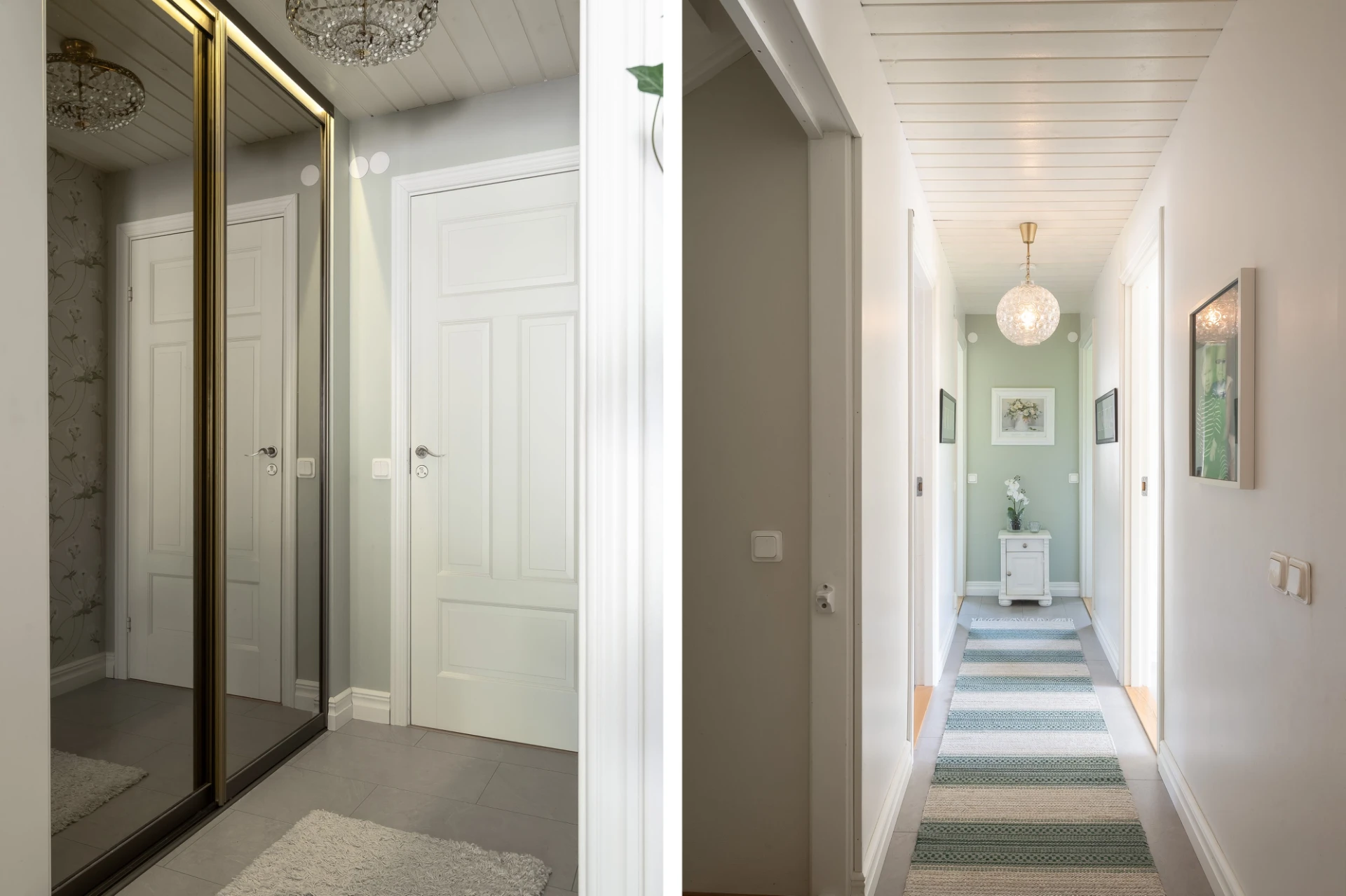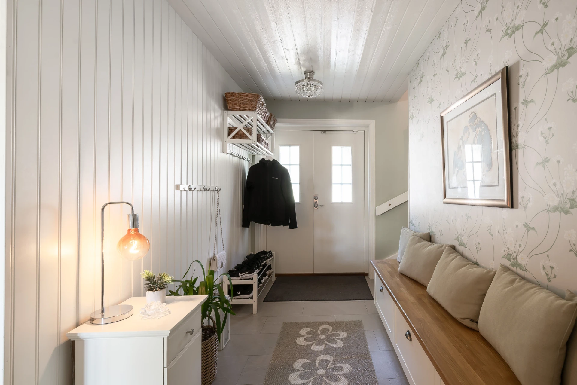Välkomnande entré via vackra pardörrar. Hallens väggar är tapetserade och nedre delen pryds av pärlspontpanel. En platsbyggd sittbänk med ekskiva erbjuder både funktion och stil, perfekt för att ta på sig skorna och som en fin hemtrevlig inredningsdetalj. Hallen har praktiskt extra slitstarkt laminatgolv och erbjuder fin förvaring i rymlig skjutdörrsgarderob.