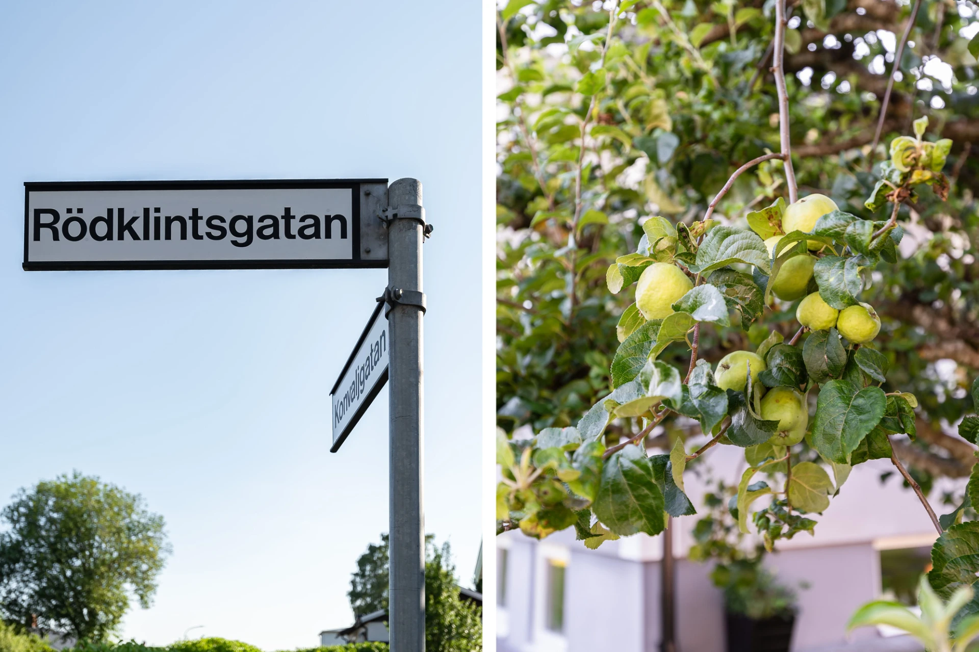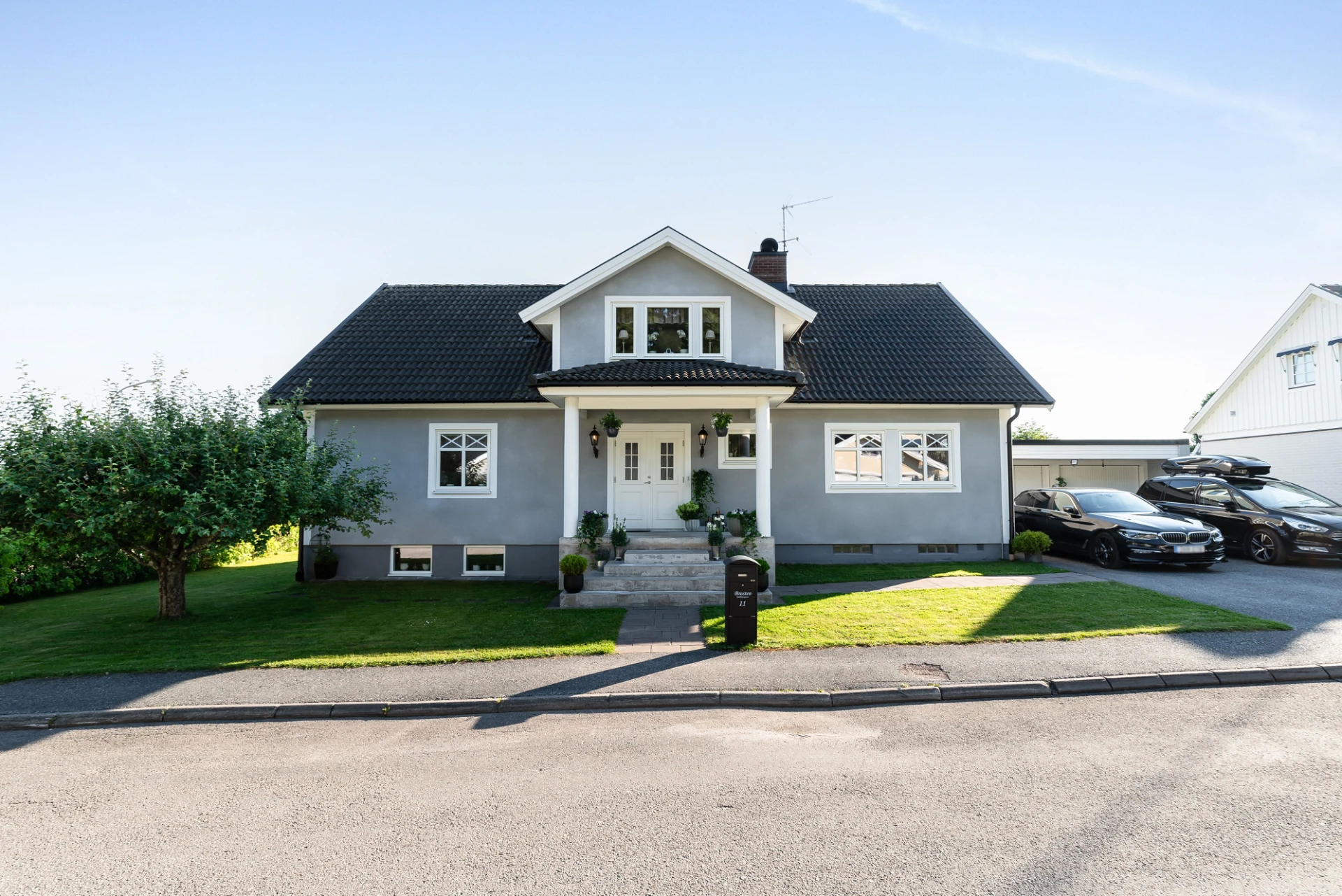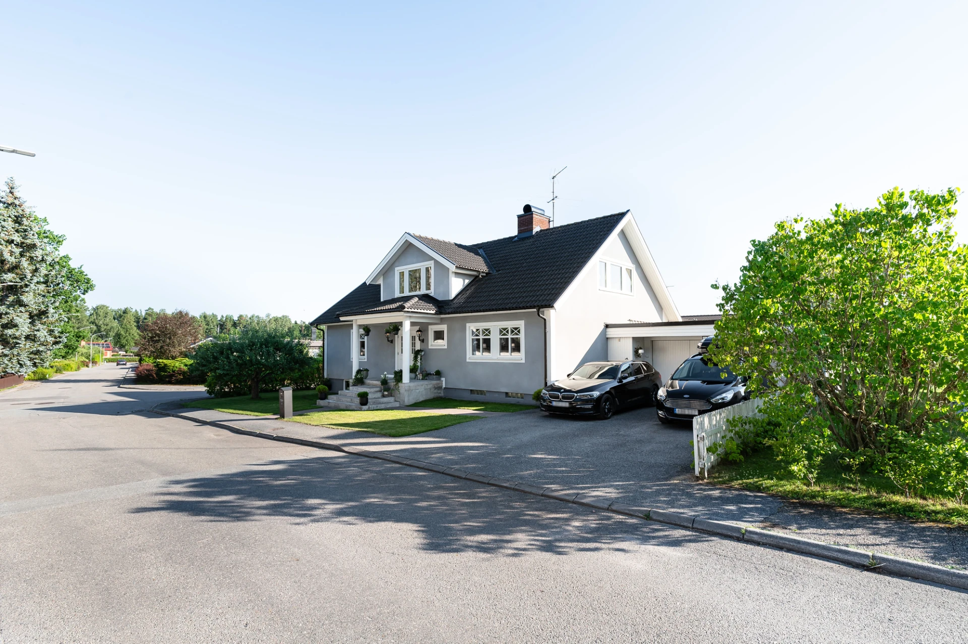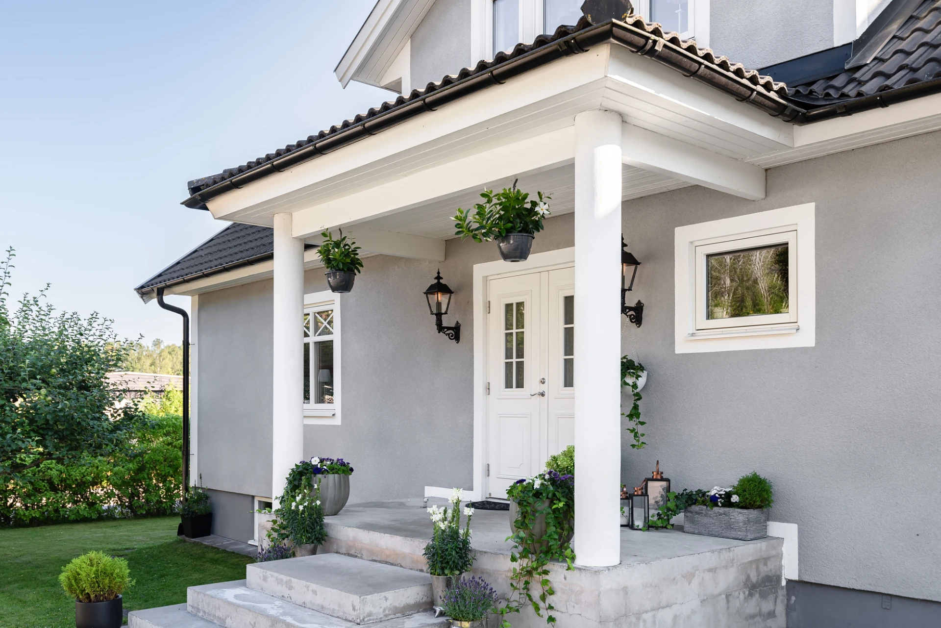 Välkomnande entré via vackra pardörrar. Hallens väggar är tapetserade och nedre delen pryds av pärlspontpanel. En platsbyggd sittbänk med ekskiva erbjuder både funktion och stil, perfekt för att ta på sig skorna och som en fin hemtrevlig inredningsdetalj. Hallen har praktiskt extra slitstarkt laminatgolv och erbjuder fin förvaring i rymlig skjutdörrsgarderob.