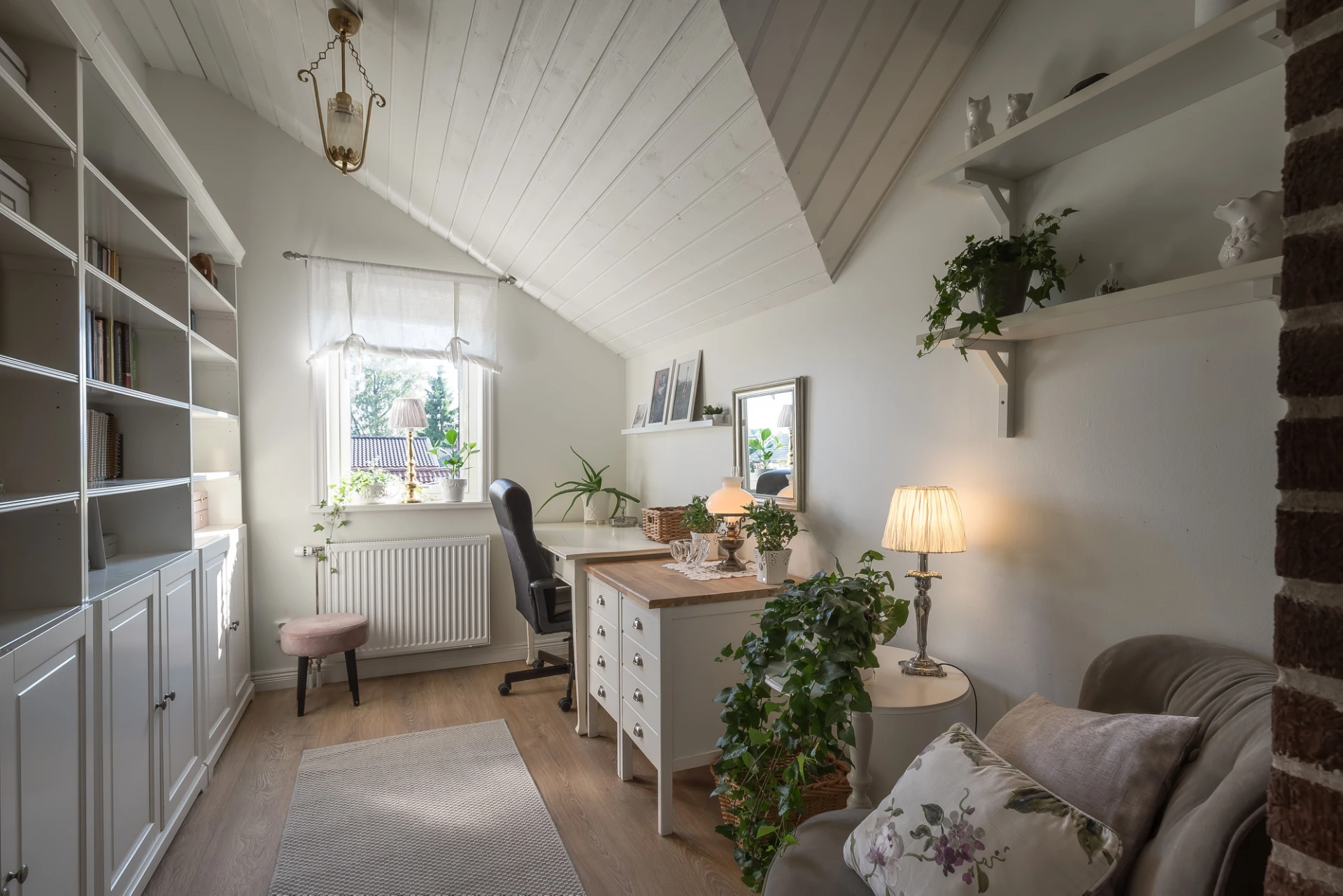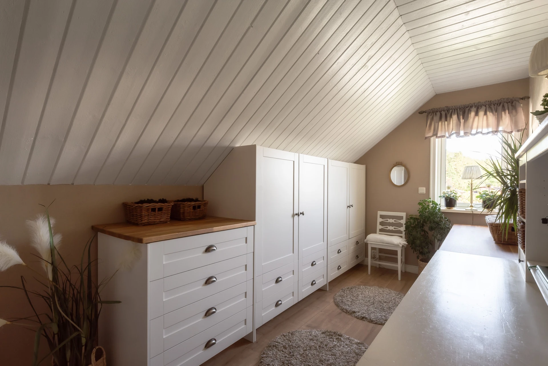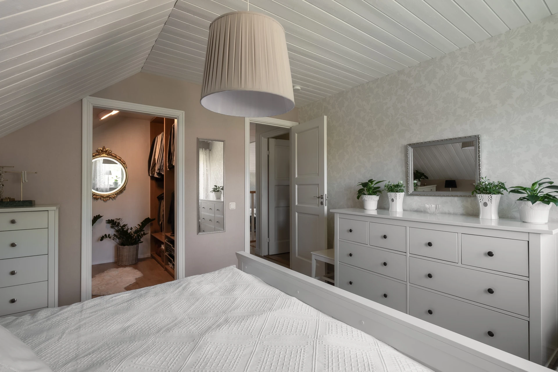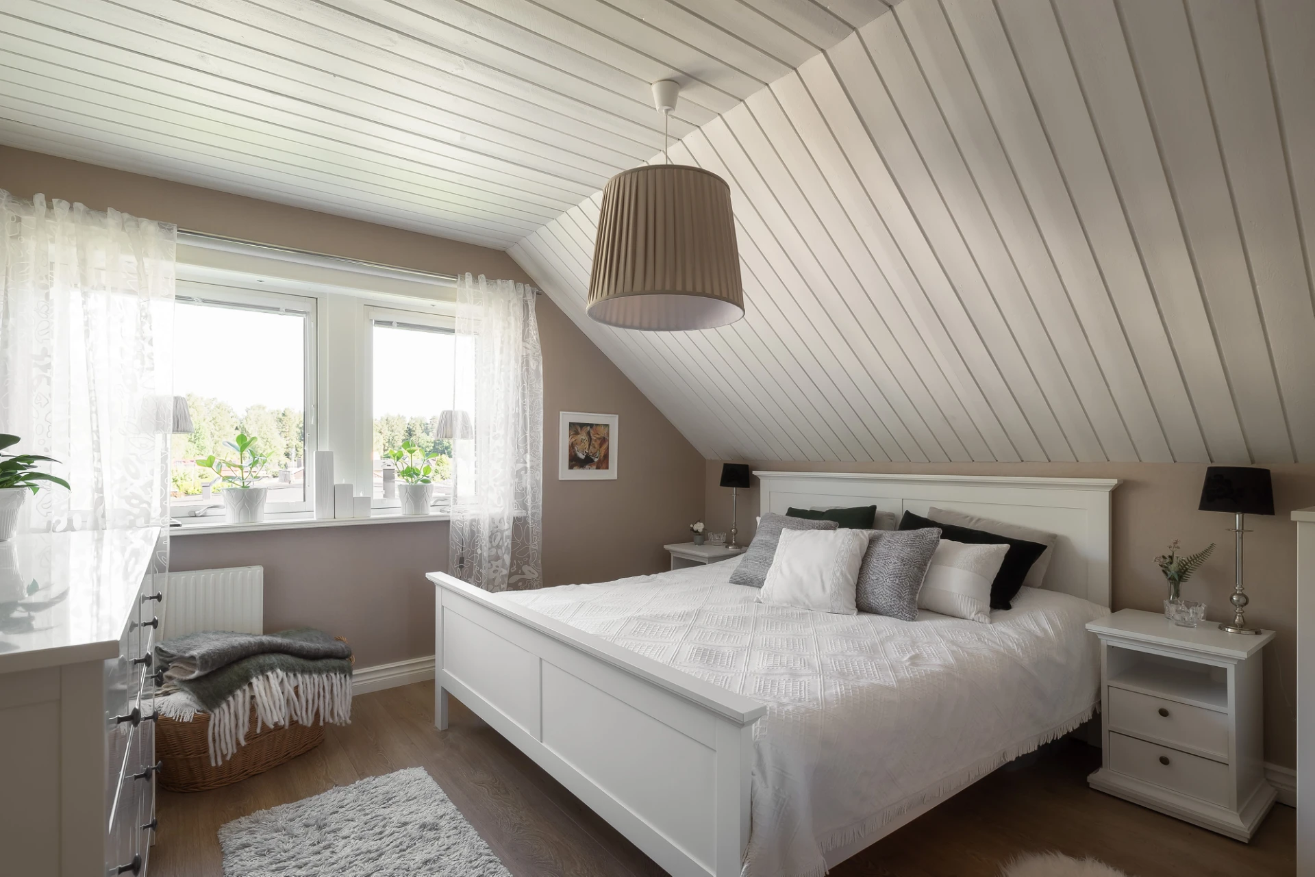 Sovrum med takhöjd upp till nock. Laminatgolv och tapetserade väggar Stämningsfulla spotlights i fönstersmygen.