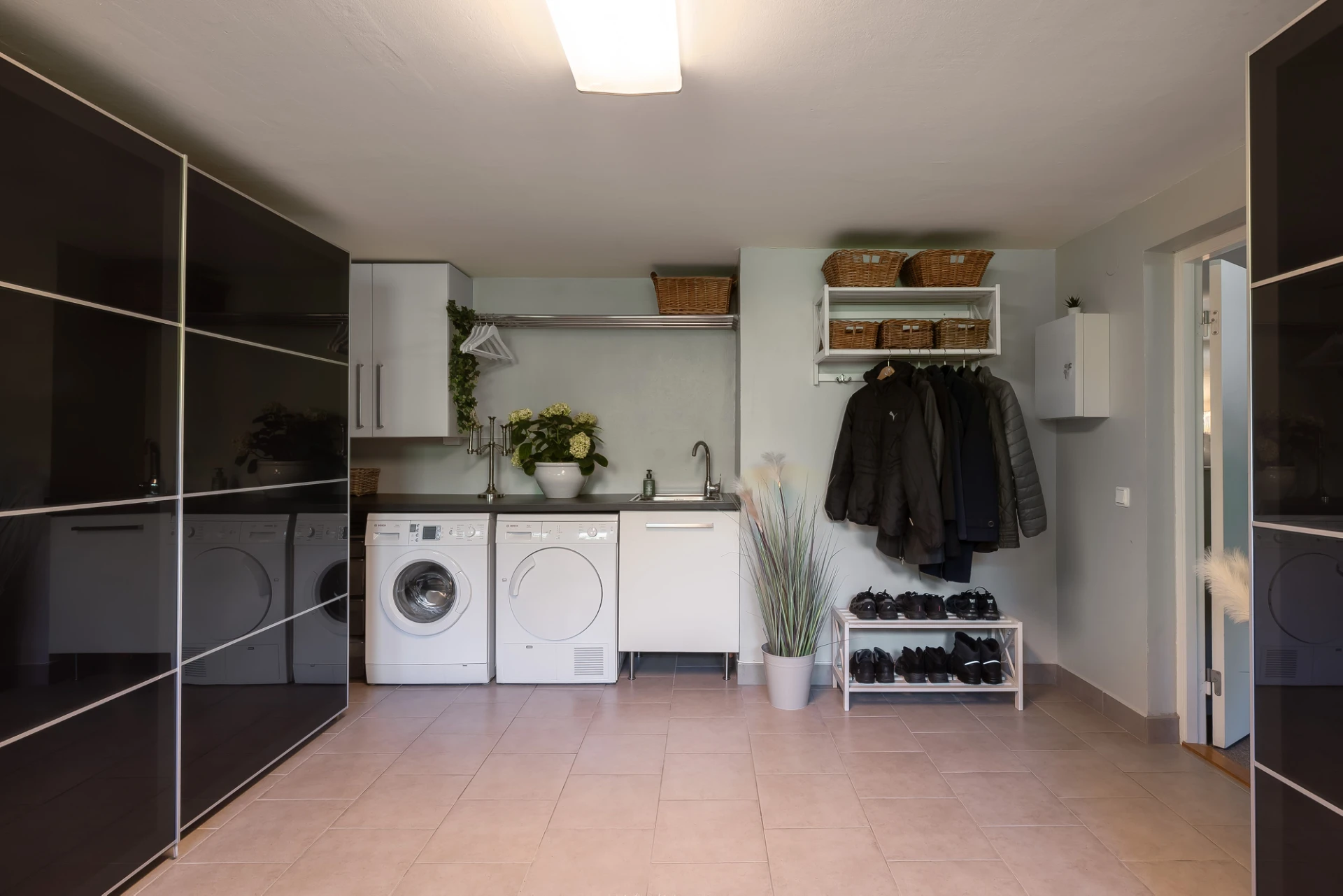 Rymlig tvättstuga med tvättmaskin, torktumlare och praktisk arbetsbänk med diskho. Klinkergolv och målade väggar. Perfekt för den stora barnfamiljens vardagsliv. Renoverat 2010.