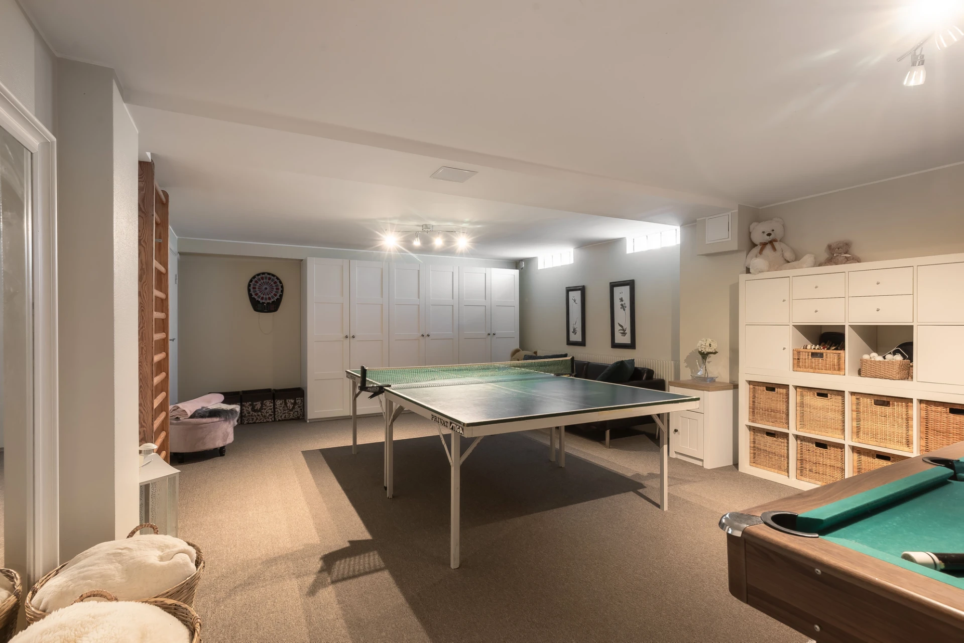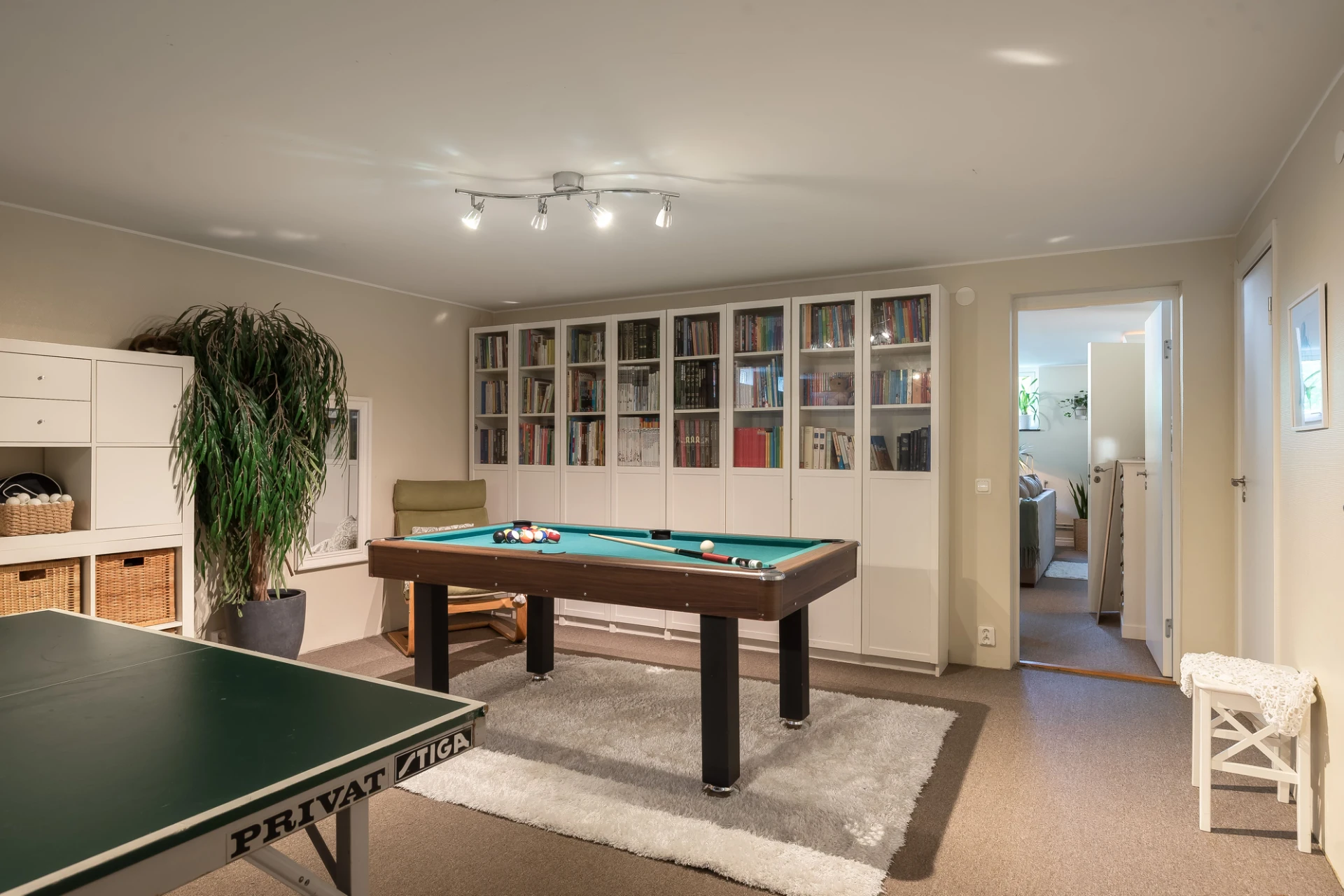 Hobbyrum/lekrum med stor disponerbar yta. I dag ryms både pingisbord och biljardbord här. Trevlig textilmatta på golvet.