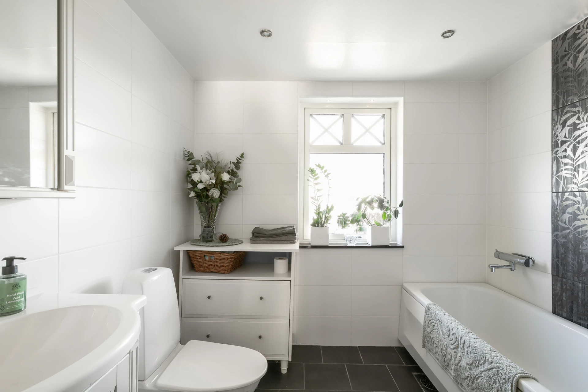 Härligt, rymligt och ljust badrum med kaklade väggar och klinkergolv. Här finns både dusch, badkar, wc, handfat med kommod och spegelskåp. Badrummet är från 2013. Vattenburen govvärme.