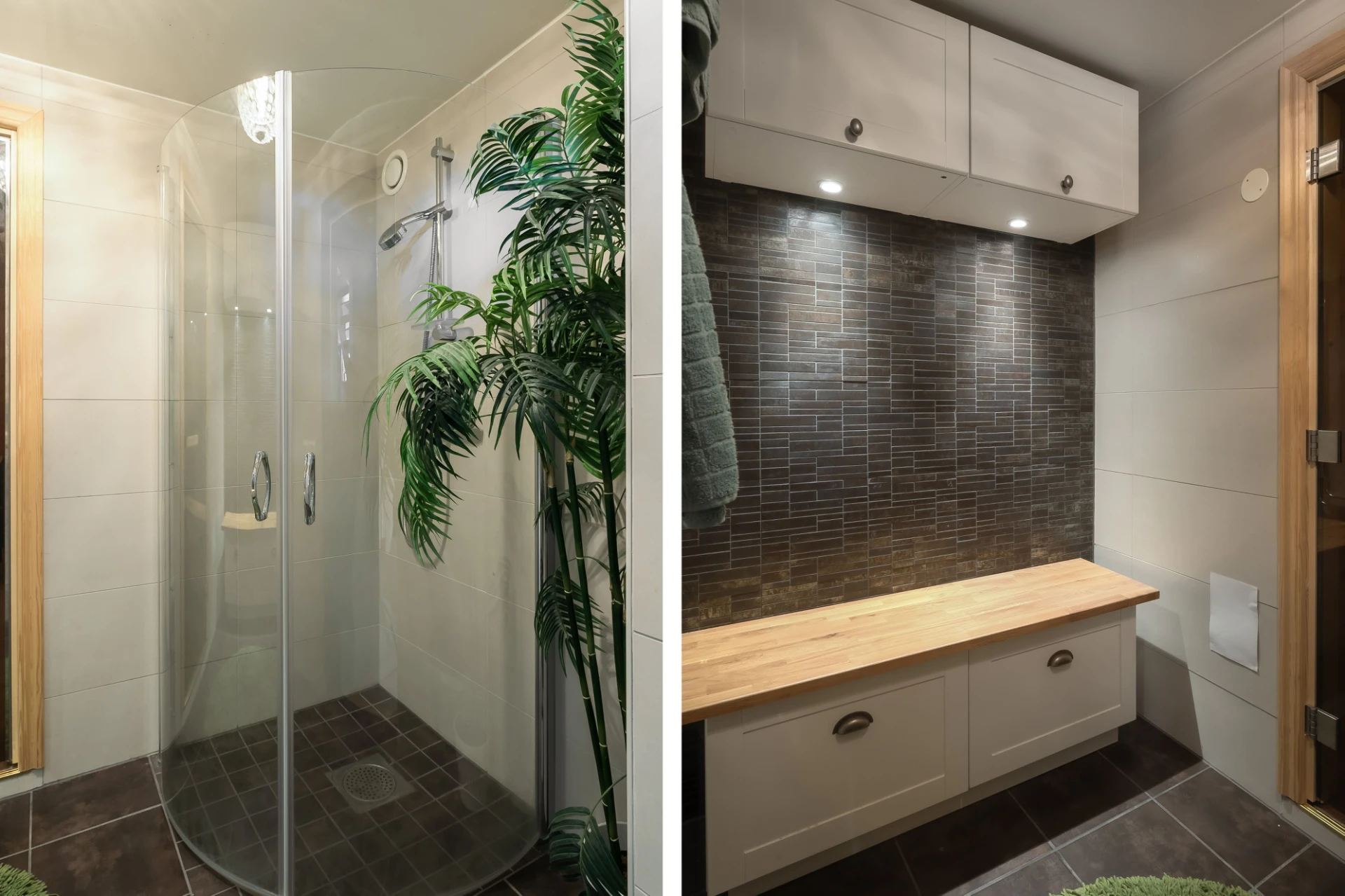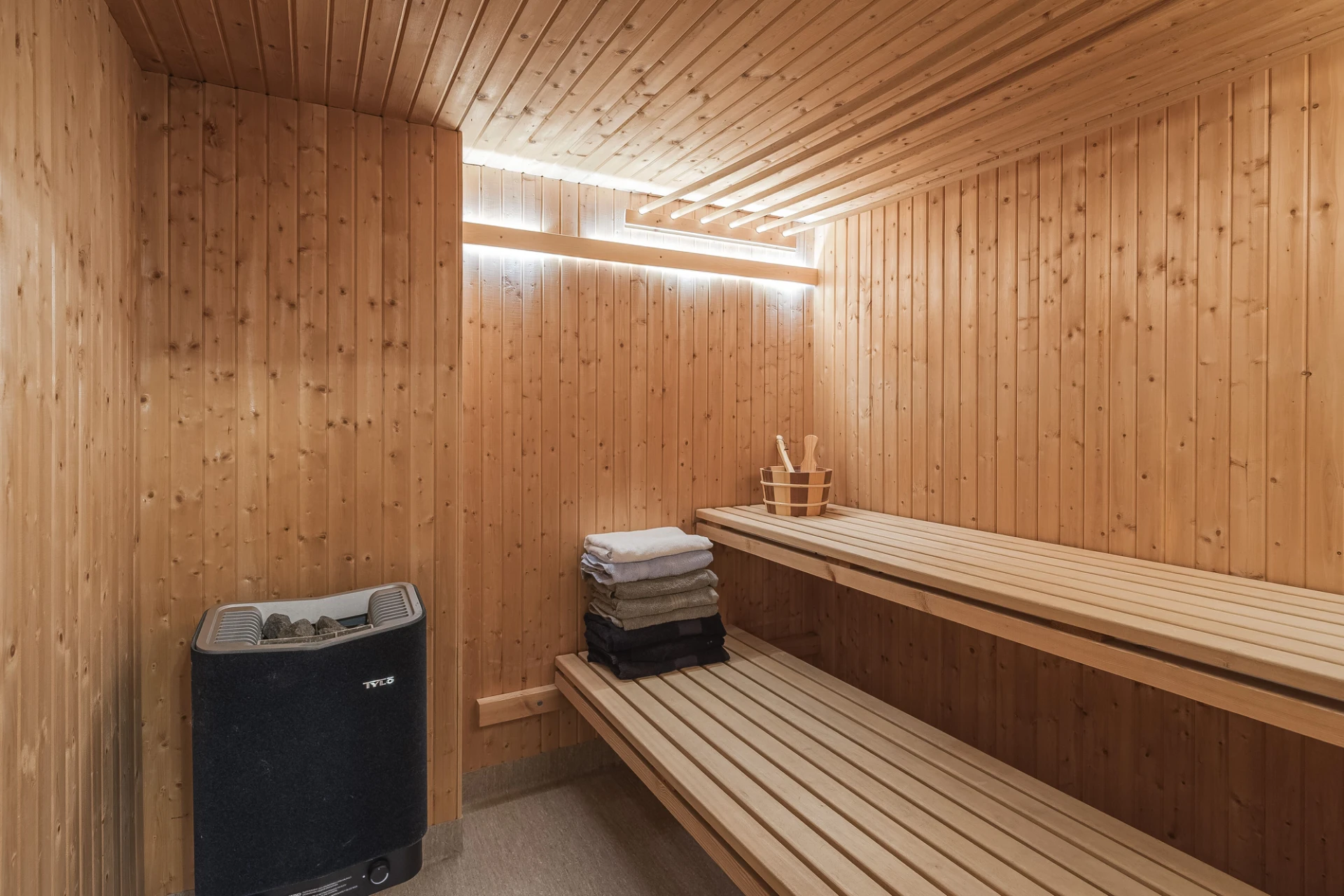 Klassisk stor bastu med fin glasdörr och breda sittbänkar i ek, i fint skick. Dimbar ledbelysning. Dusch och relaxrum i anslutning. Vackert inredd i klinker och trädetaljer, platsbyggda skåp för förvaring i ek. Byggd: 2016.