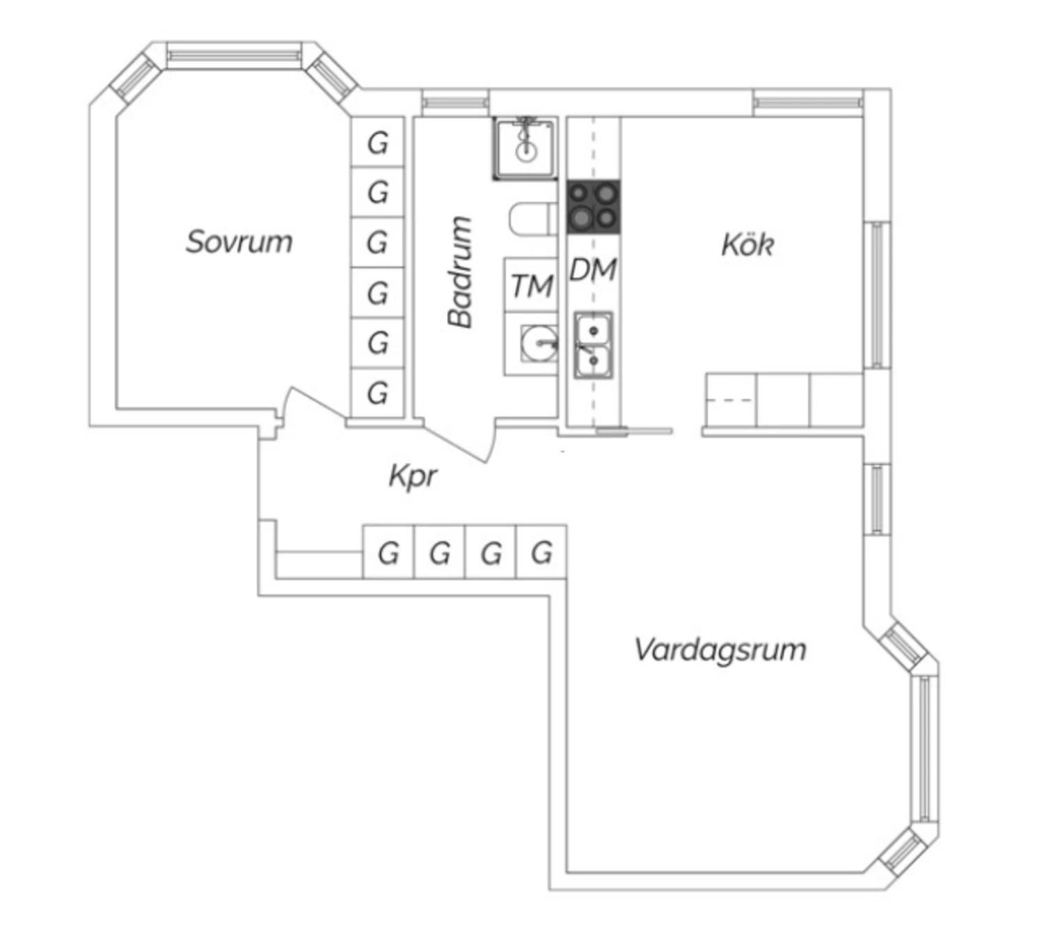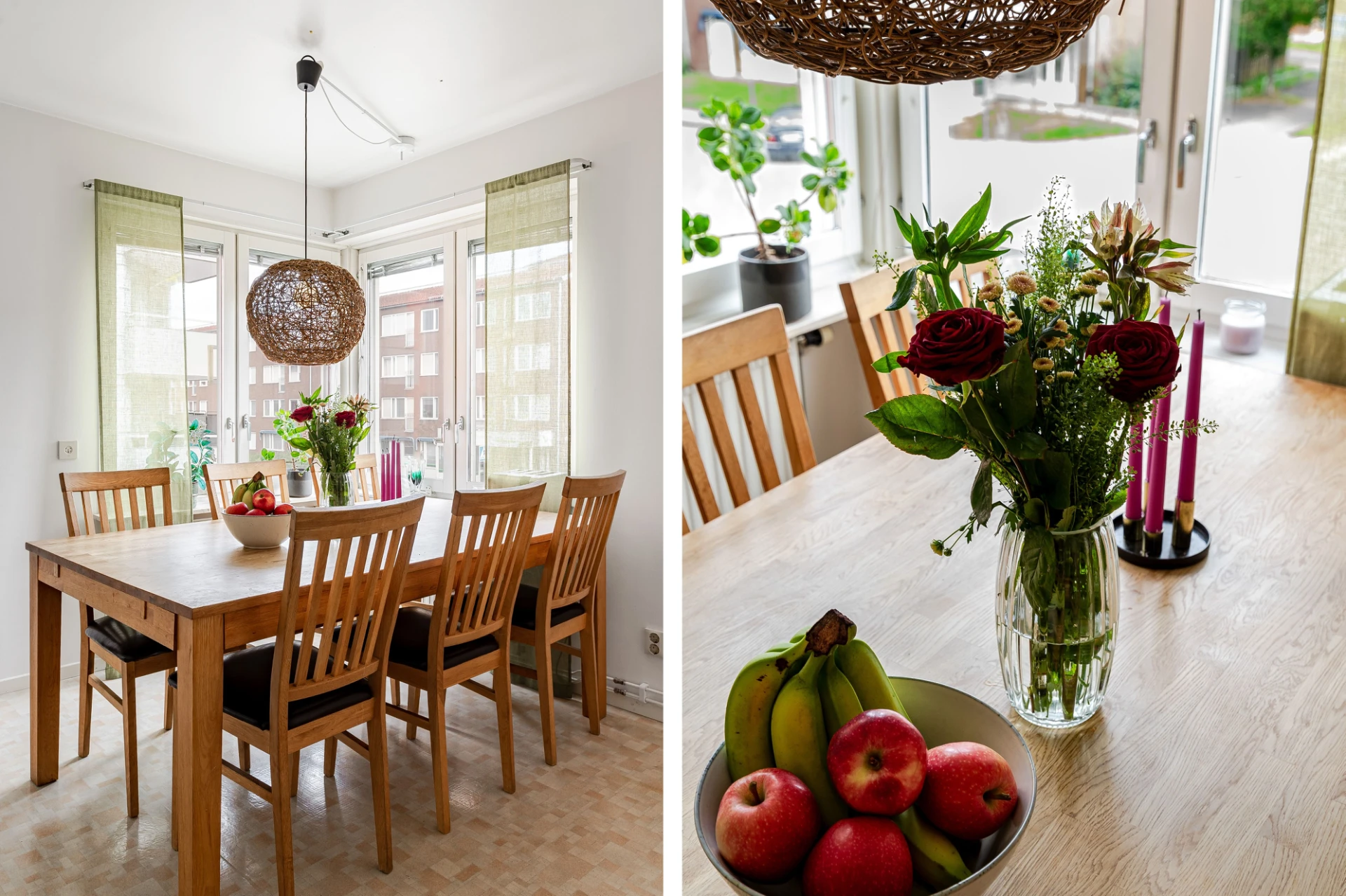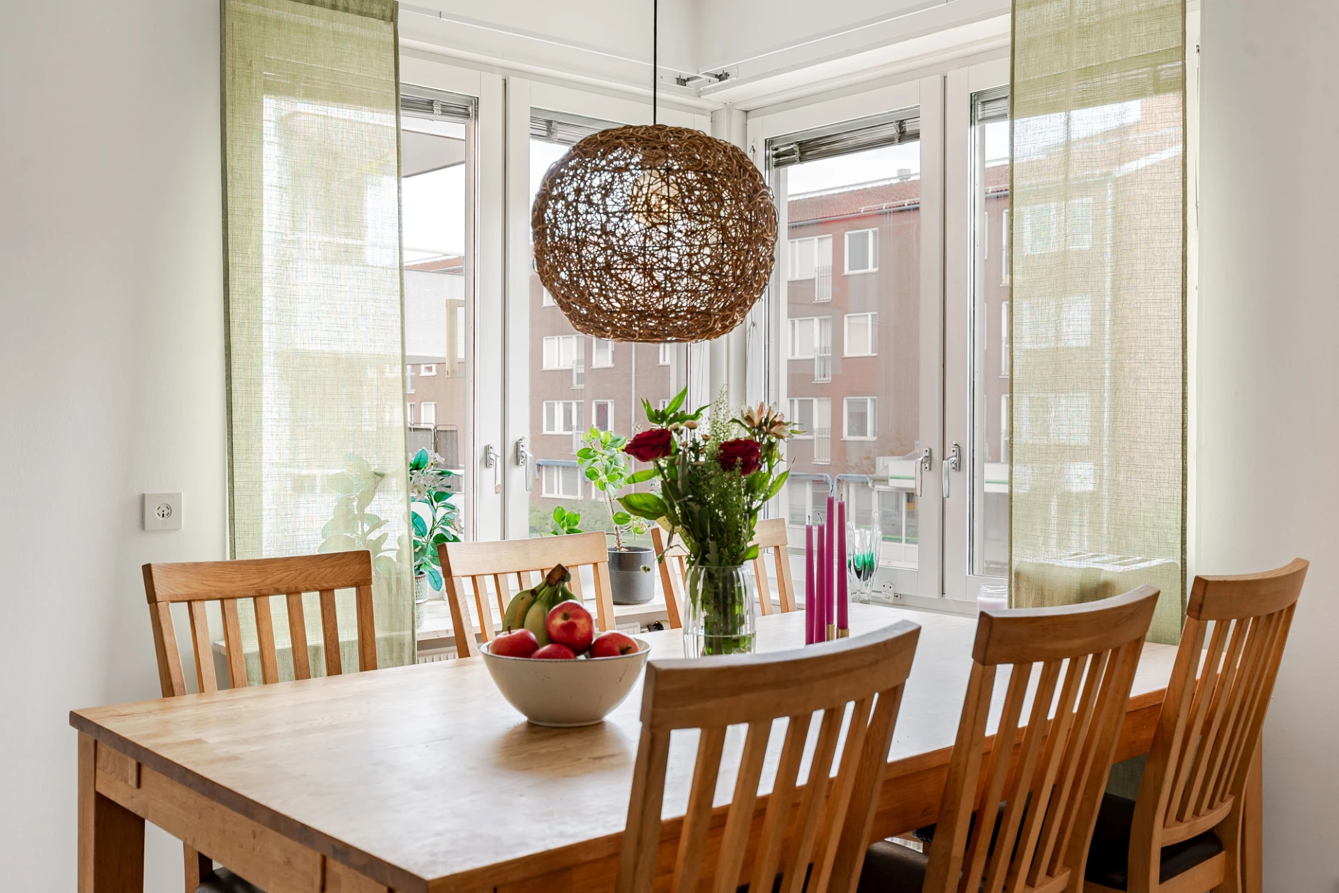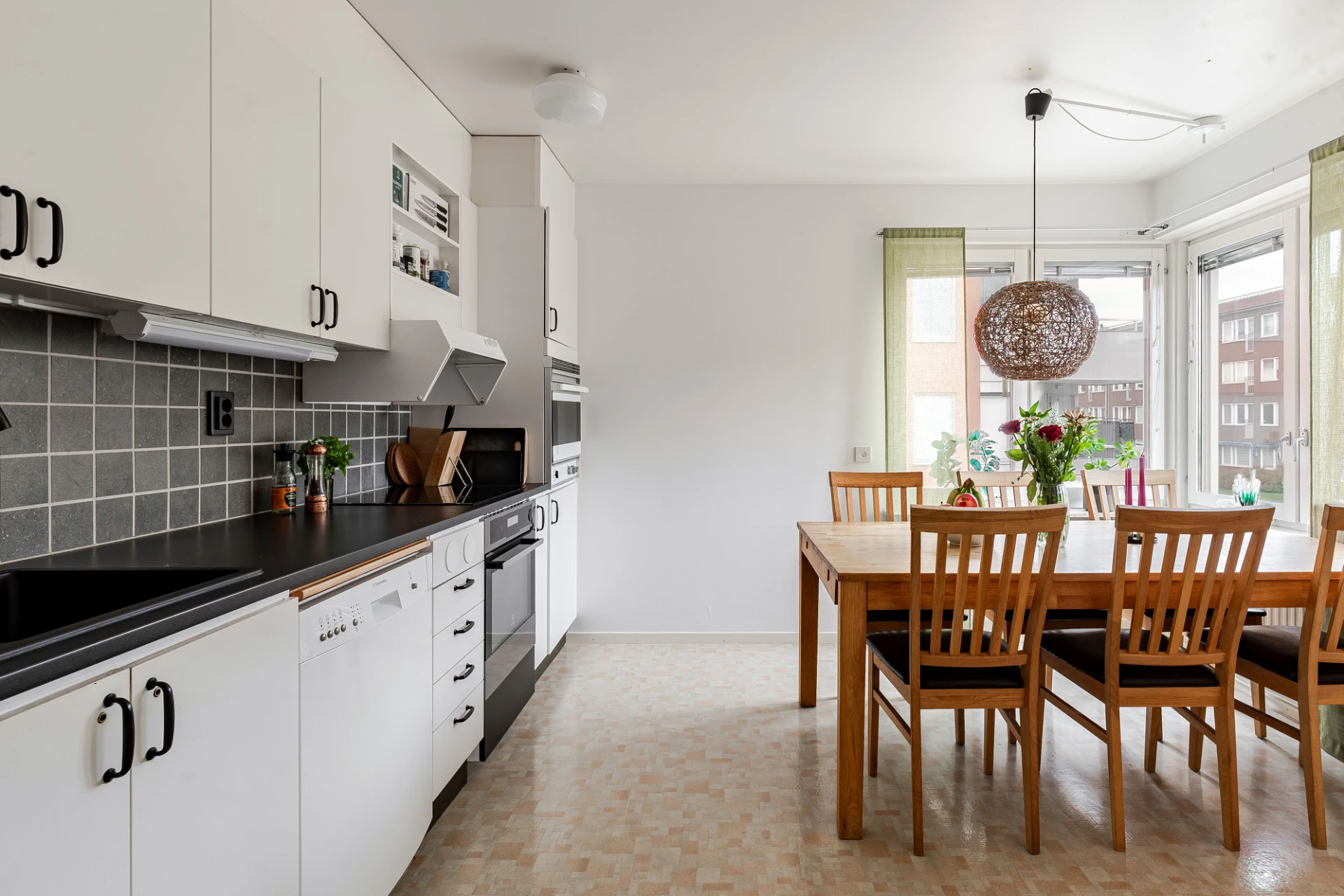 Lägenheten erbjuder ett fullt utrustat kök där du enkelt kan bjuda in till både vardagsmiddagar och festliga kvällar. I vardagsrummet förhöjs känslan av rymd tack vare ett charmigt burspråk som släpper in rikligt med ljus och skapar en härlig atmosfär.