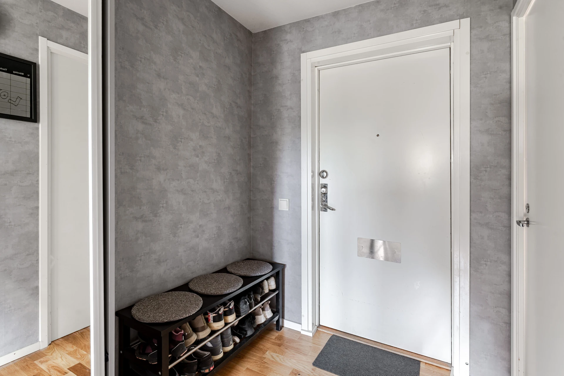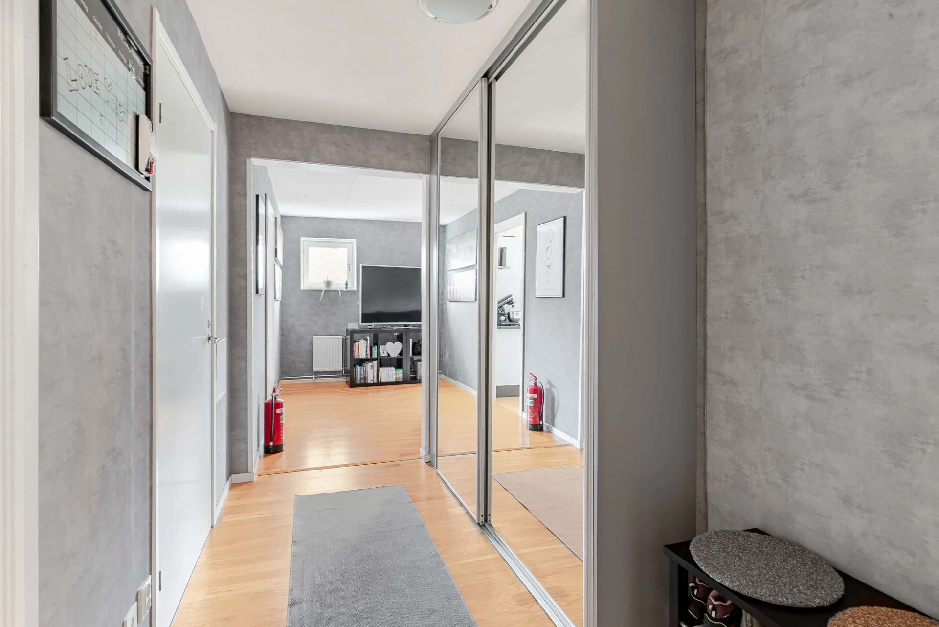 Rymlig hall med plats för avhängning och förvaring i garderob med skjutdörrar. Tapetserade väggar och parkettgolv.