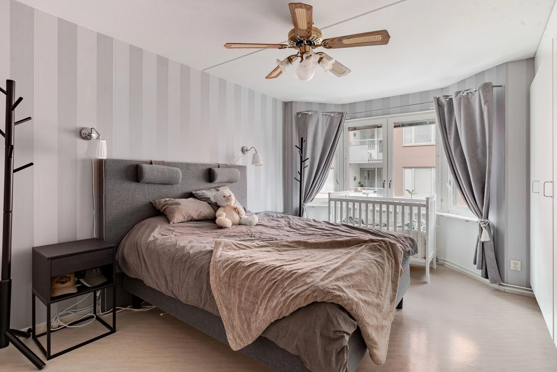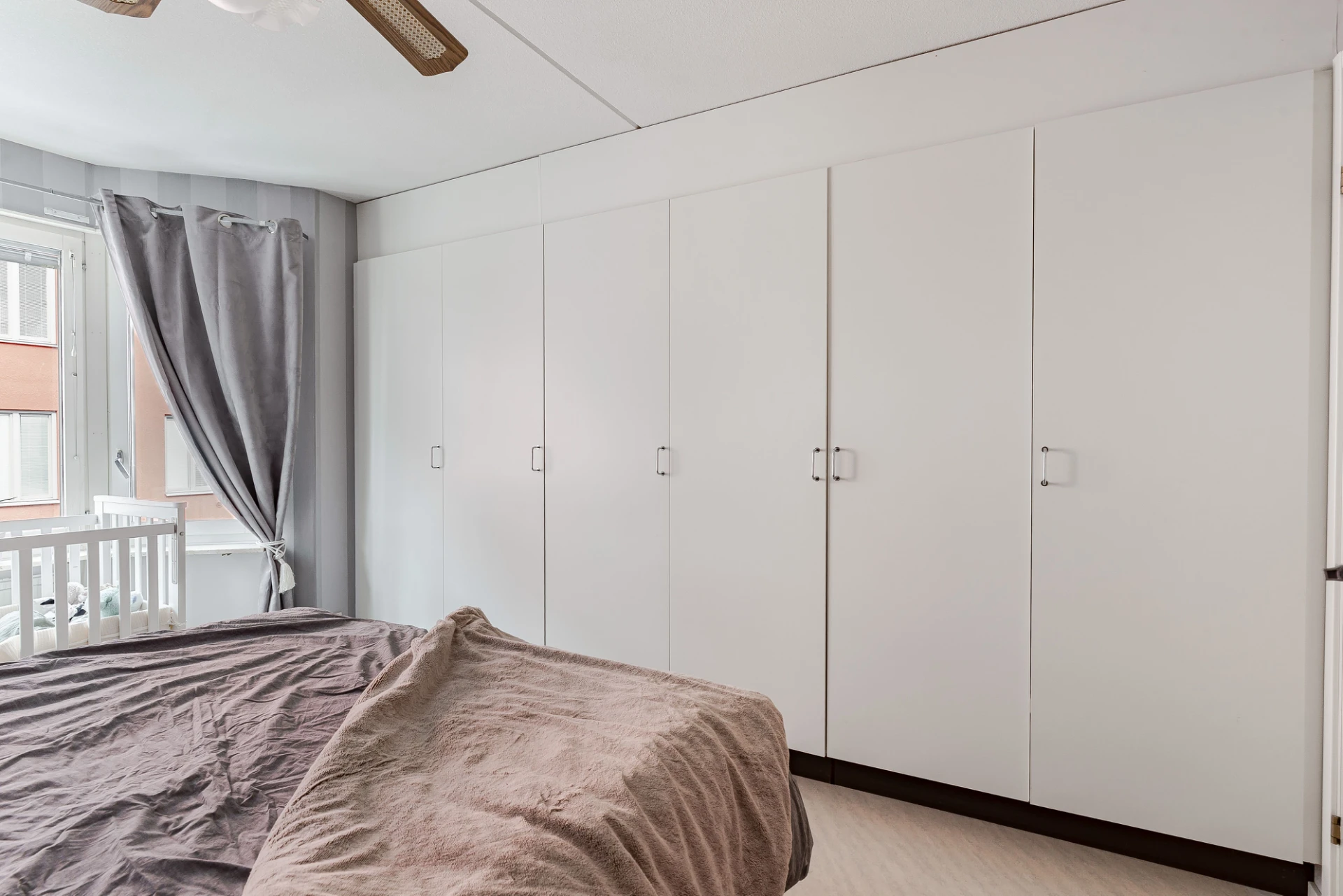 Generöst sovrum med gott om plats för både dubbelsäng och skrivbord. Här finns utmärkta förvaringsmöjligheter i garderober, medan de tapetserade väggarna och det lättskötta golvet i plastmatta skapar en hemtrevlig känsla.
