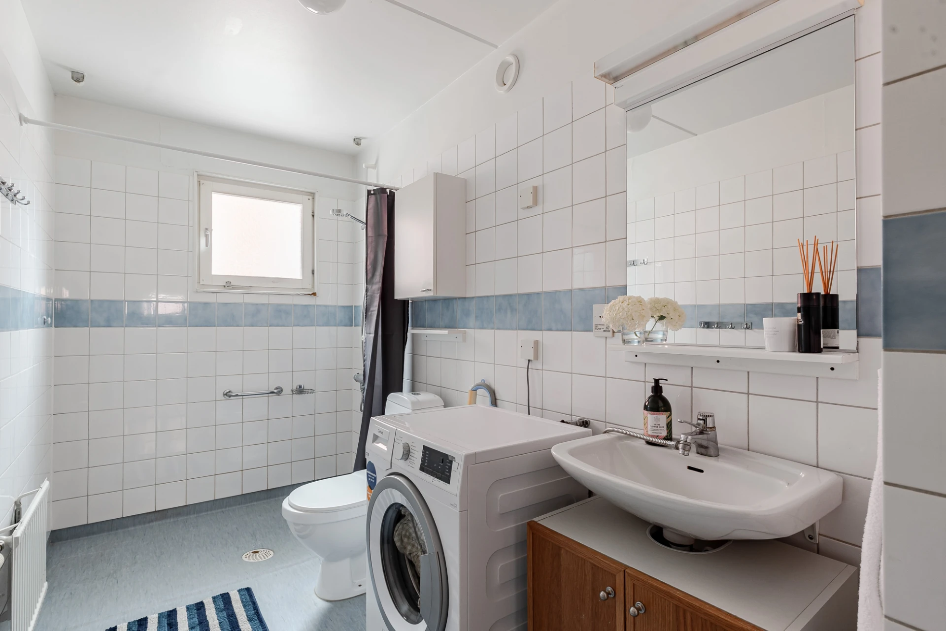 Badrummet är stilrent och praktiskt utrustat med tvättmaskin – ett uppskattat inslag i vardagen. Lägenheten har dessutom ett rymligt källarförråd, vilket ger gott om förvaringsmöjligheter.