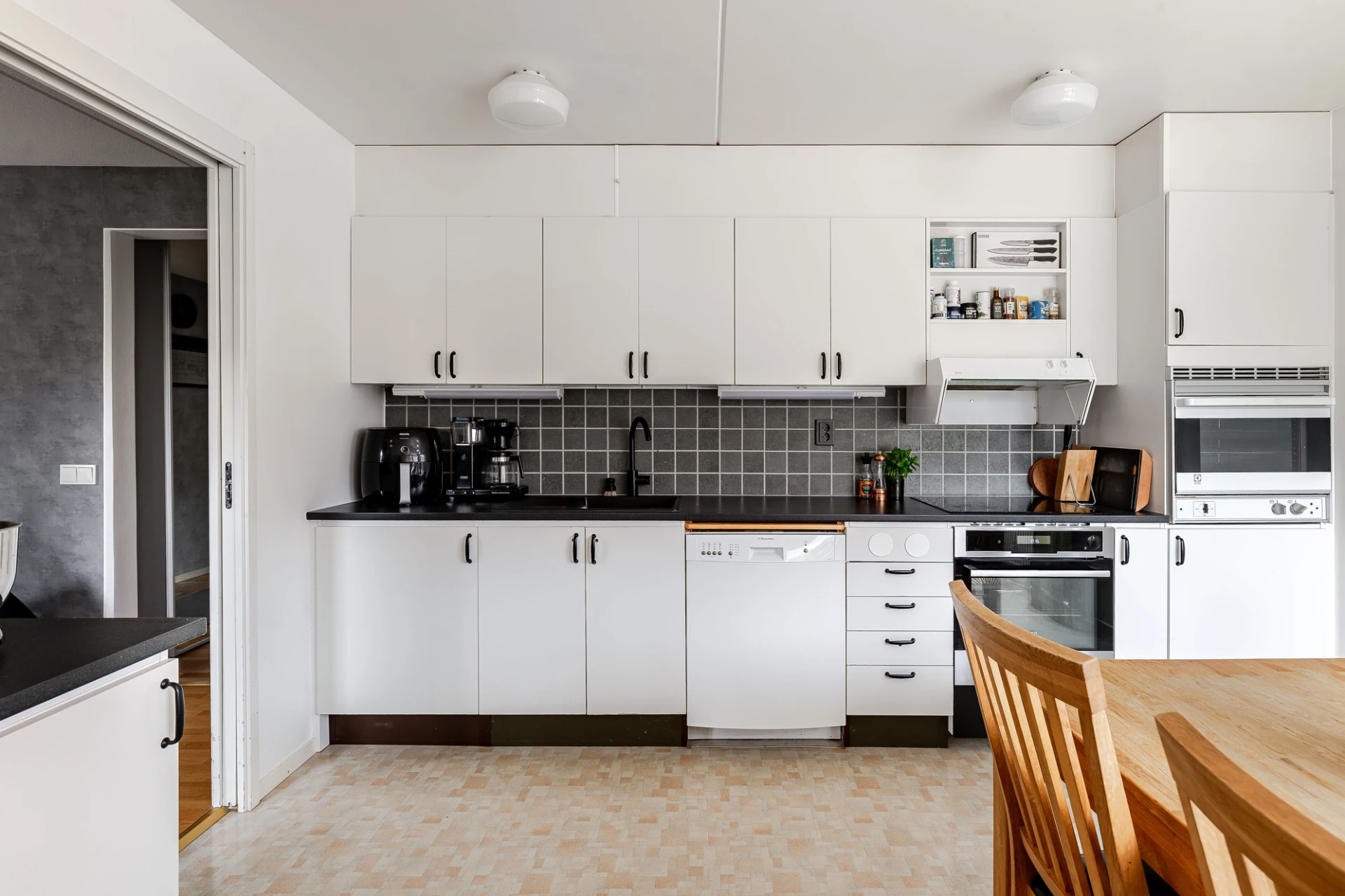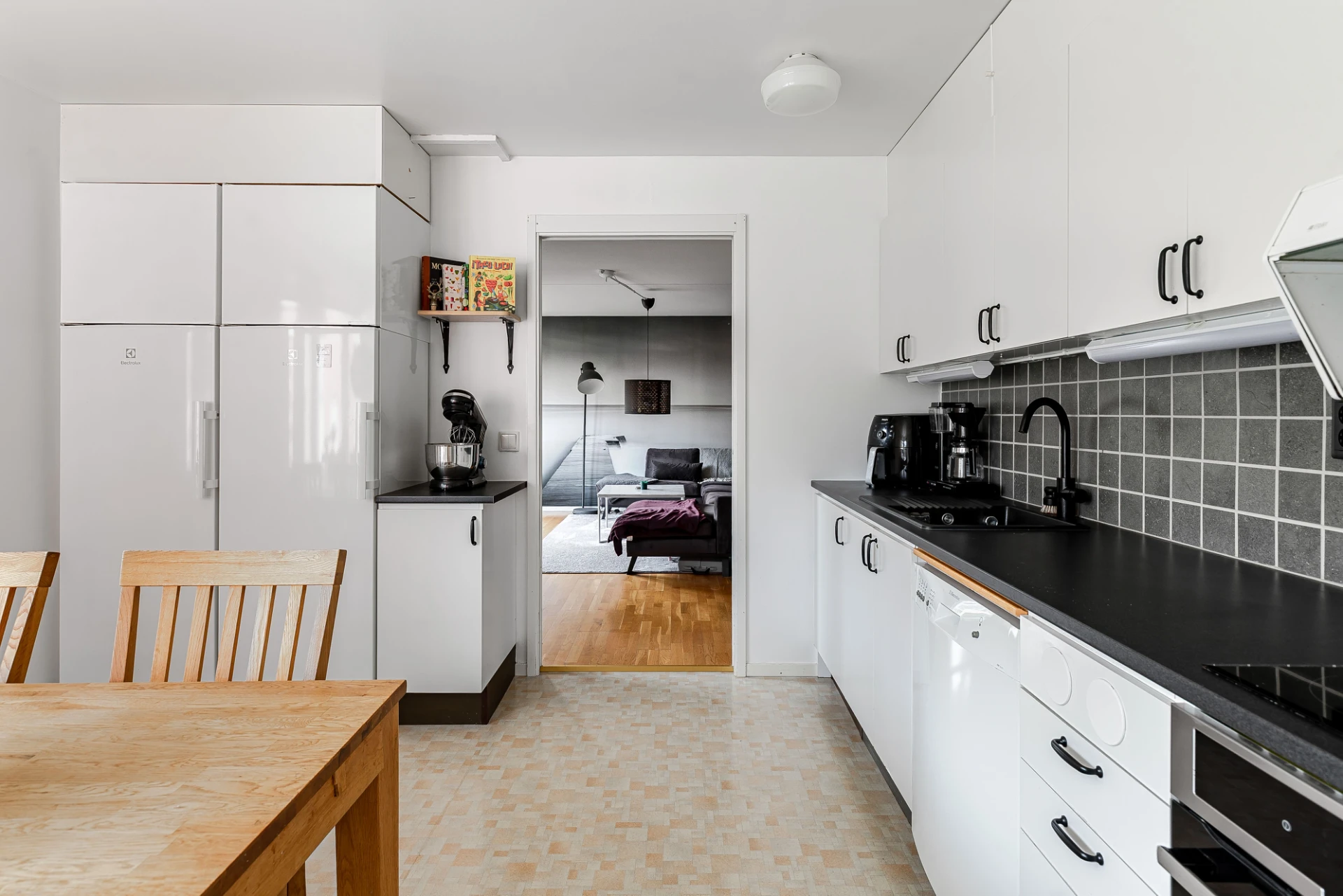 Ljust och inbjudande kök med matplats där fönster i vinkel ger ett fantastiskt ljusinsläpp och en härlig rymd. Köksinredning i vitt kombineras med bänkskiva i laminat och kakel som stänkskydd – en tidlös och stilren helhet. Här finns också modern maskinell utrustning i form av induktionshäll, inbyggd ugn, diskmaskin samt kyl och frys. Målad tapet och plastmatta på golv.