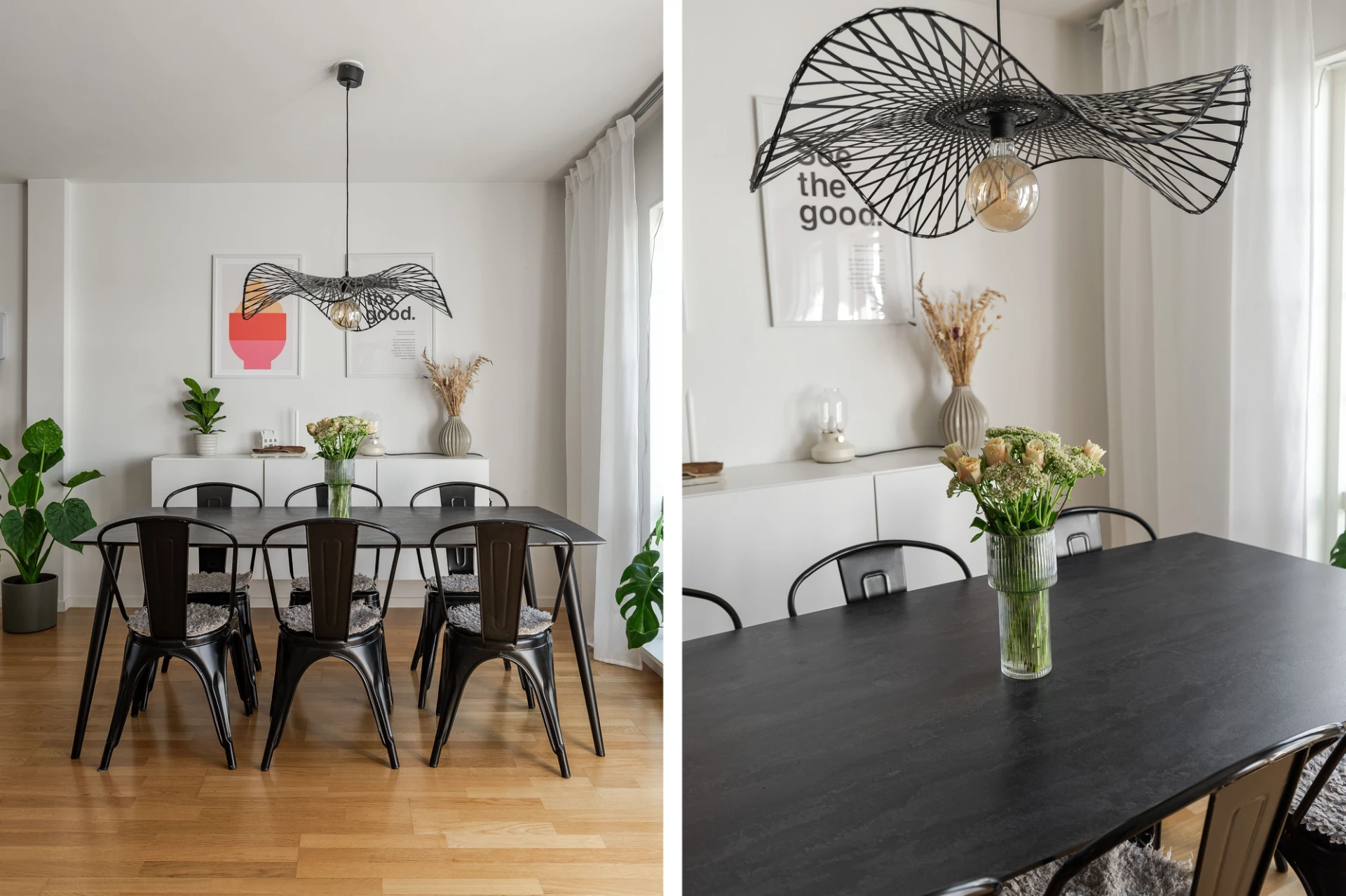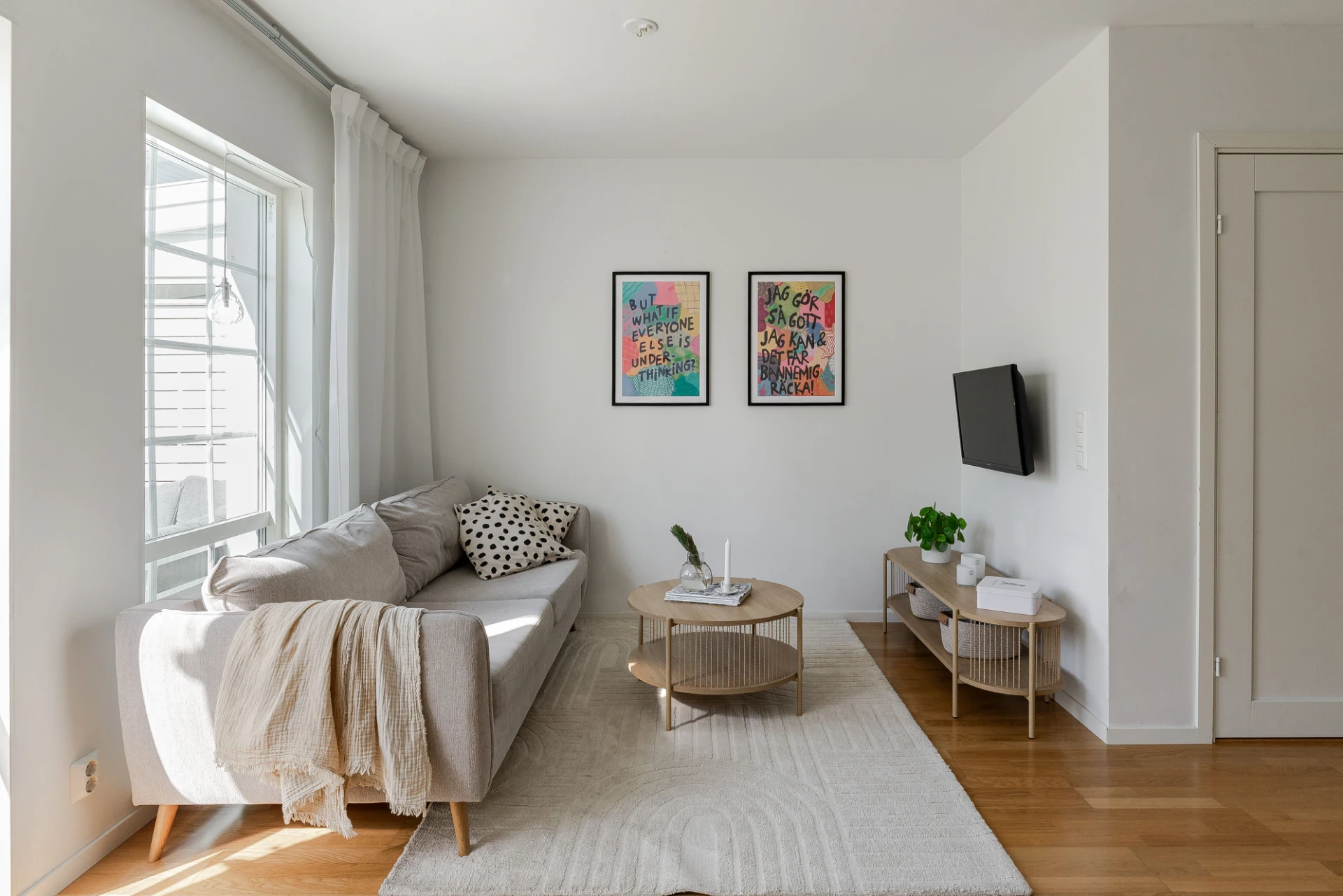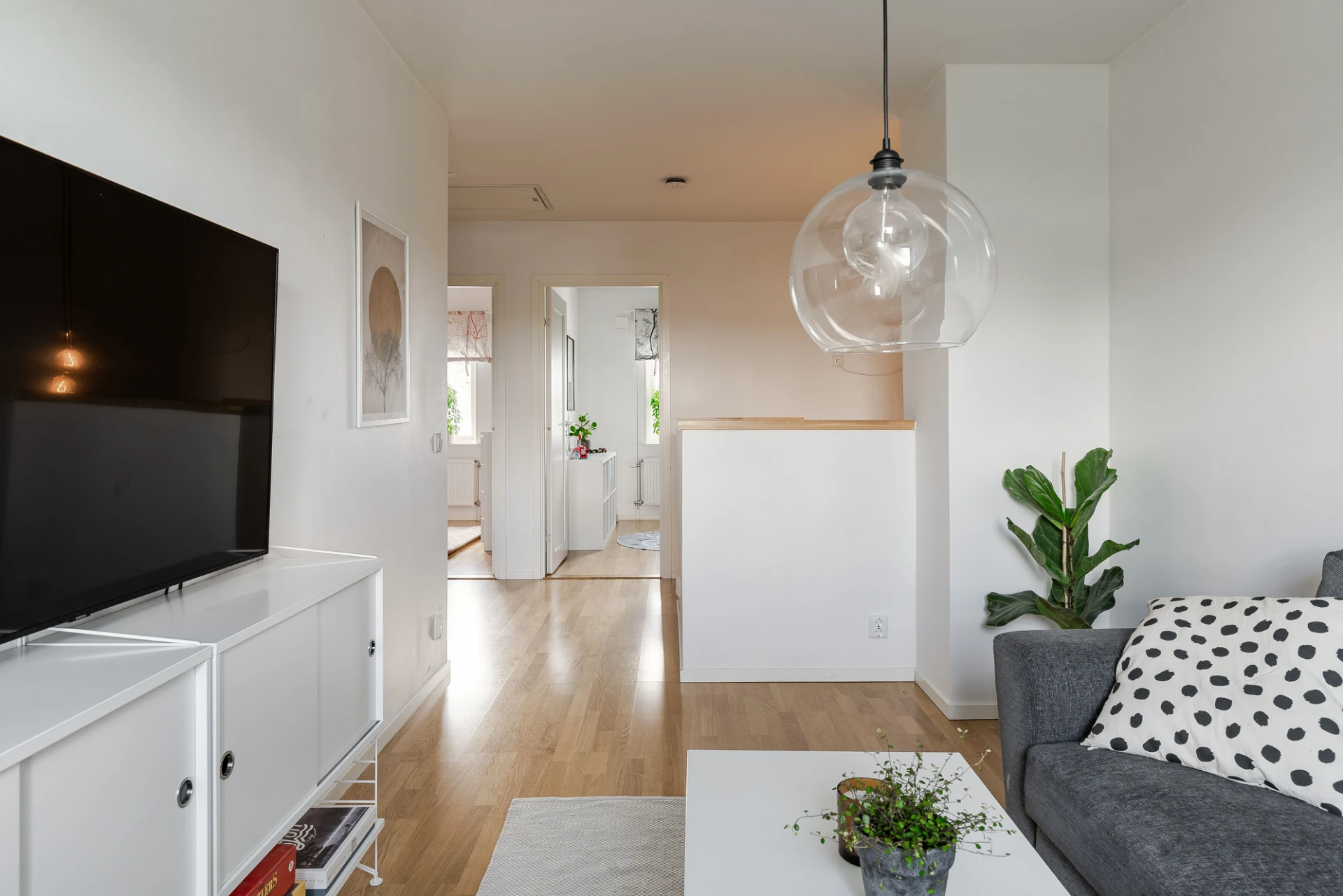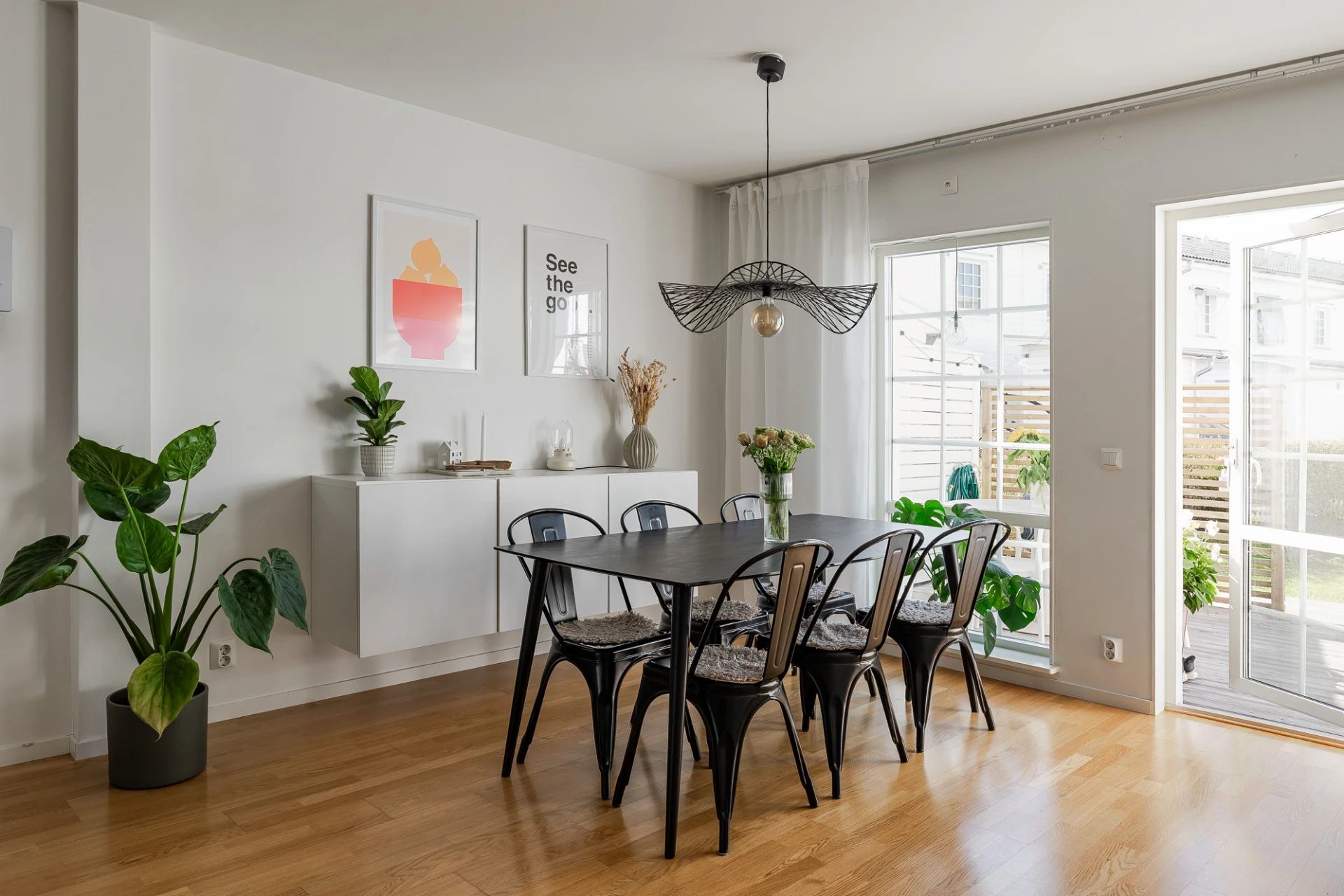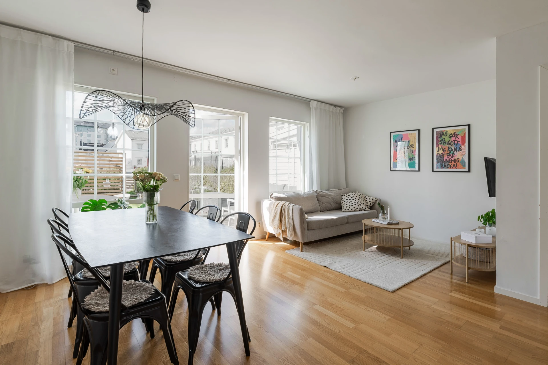 Vardagsrum med parkettgolv och målade väggar. Här finns plats för matbord och tv-hörna.