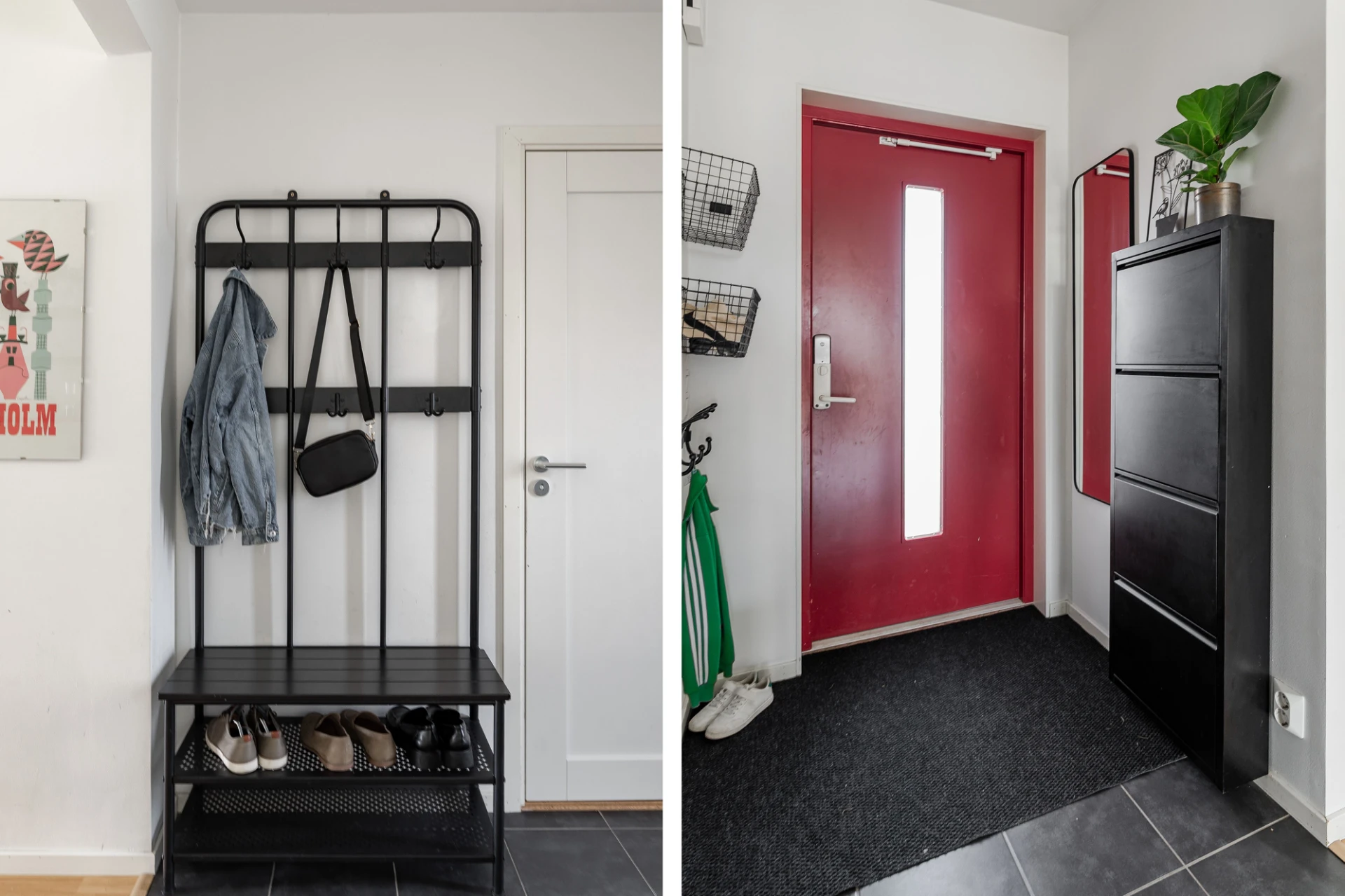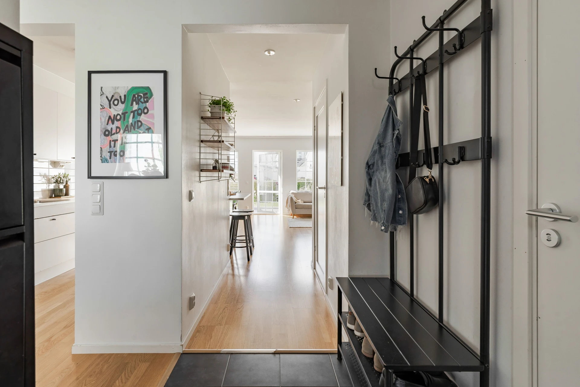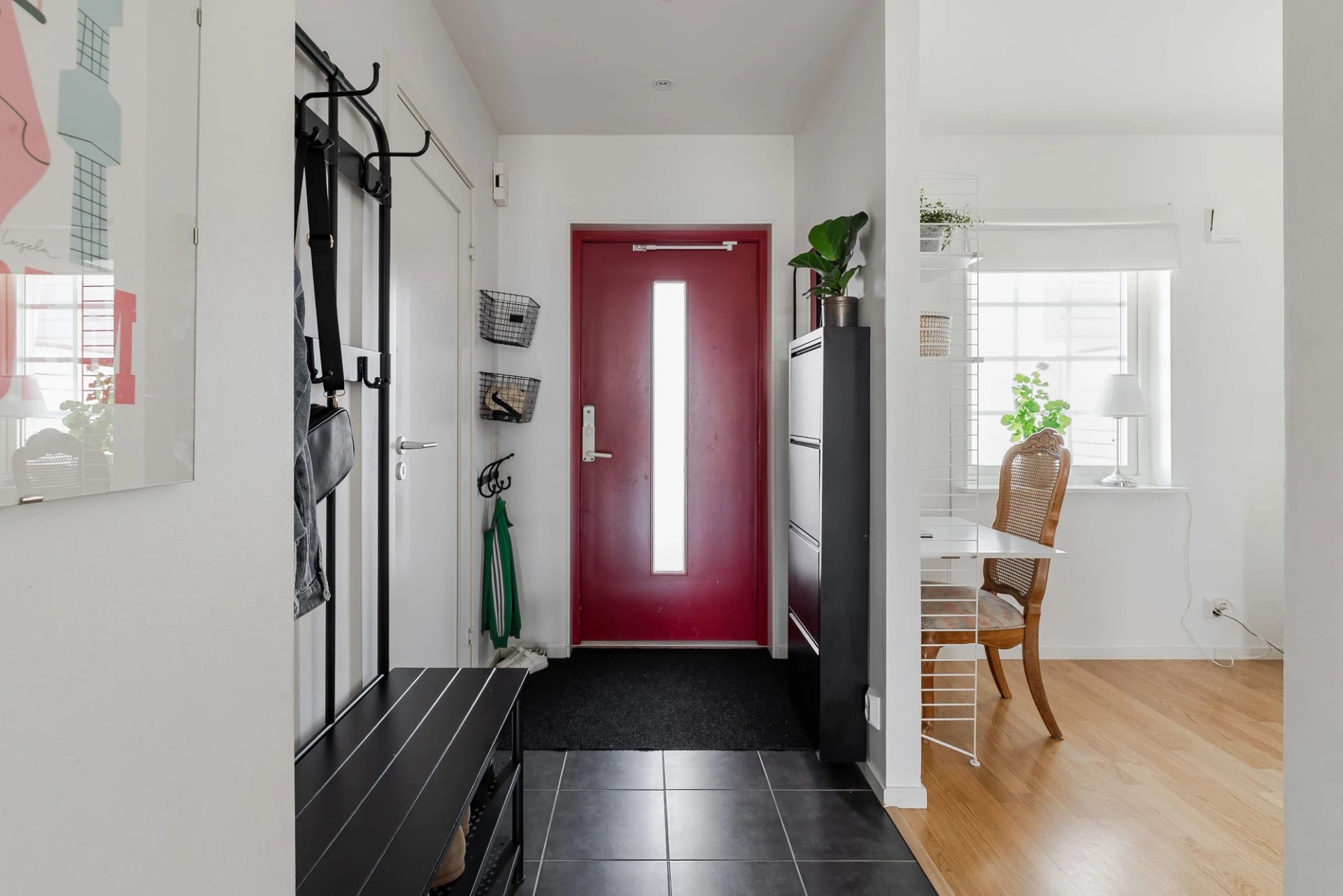 Hall med klinkergolv och målade väggar. Här finns plats för avhägning.