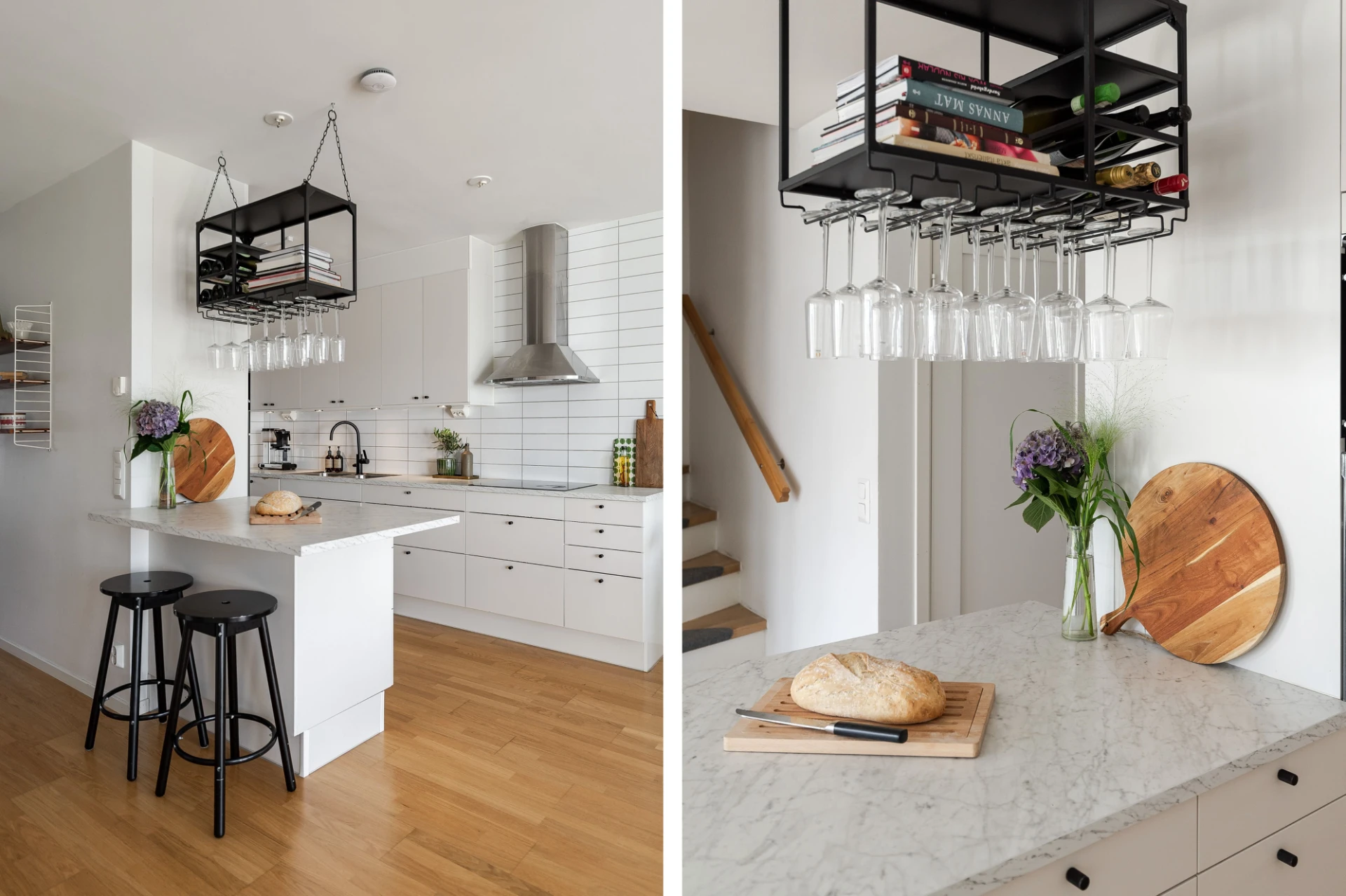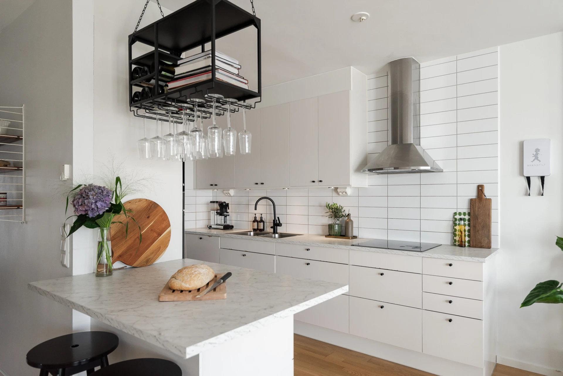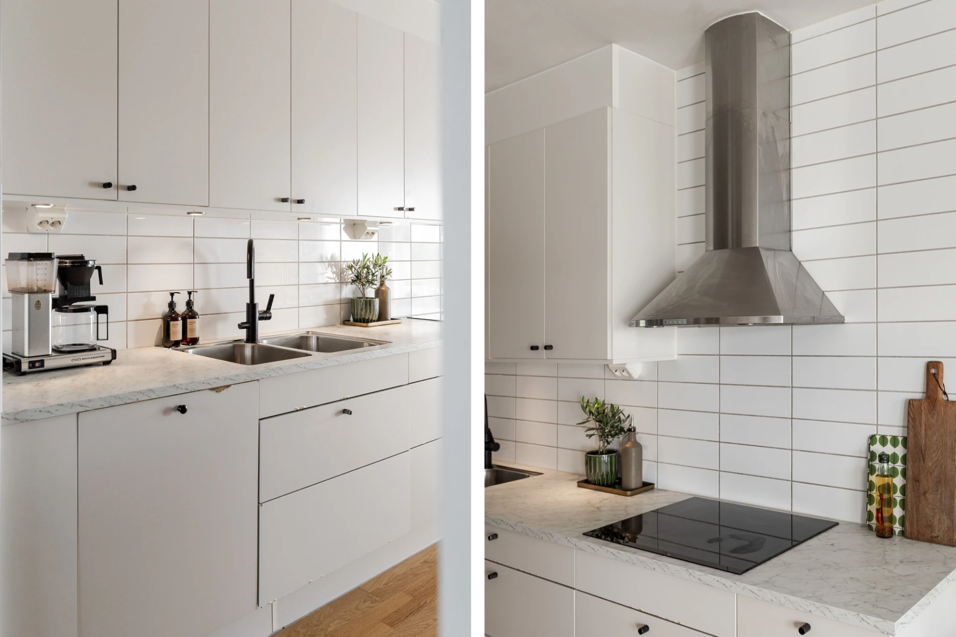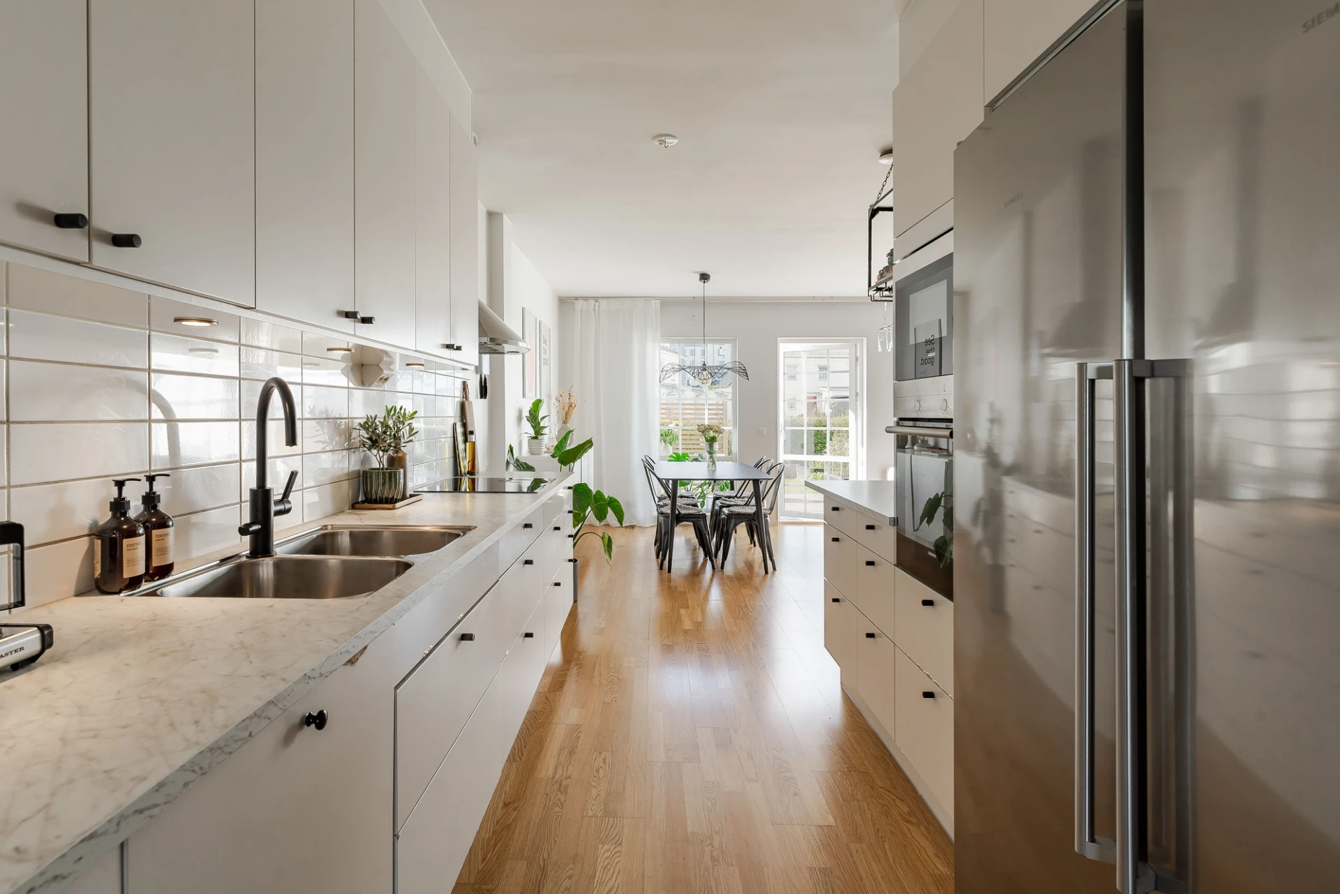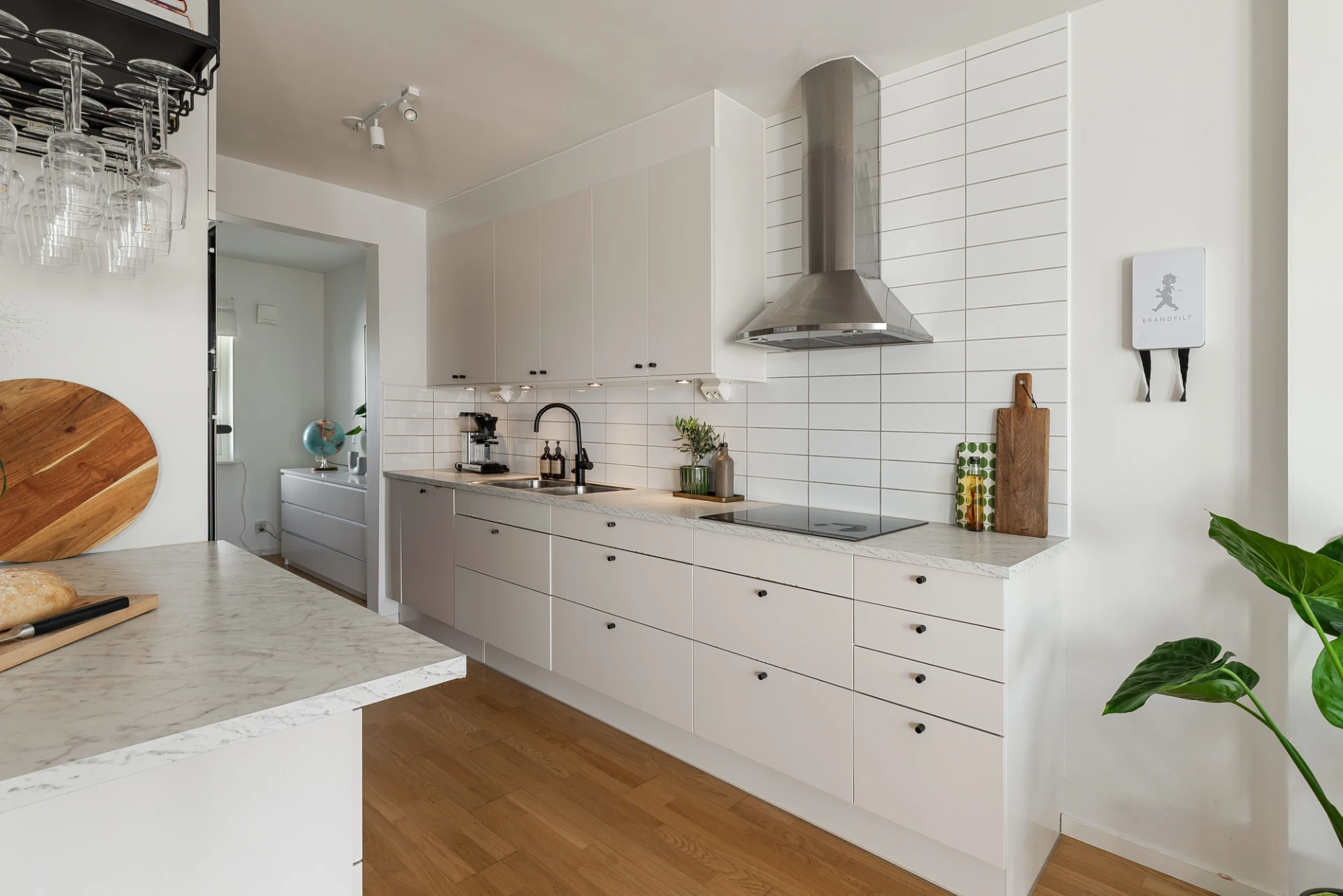 Modernt kök med parkettgolv och målade väggar. Vita köksluckor. Induktionshäll, ugn, mikro, integrerad diskmaskin samt hel kyl och frys.