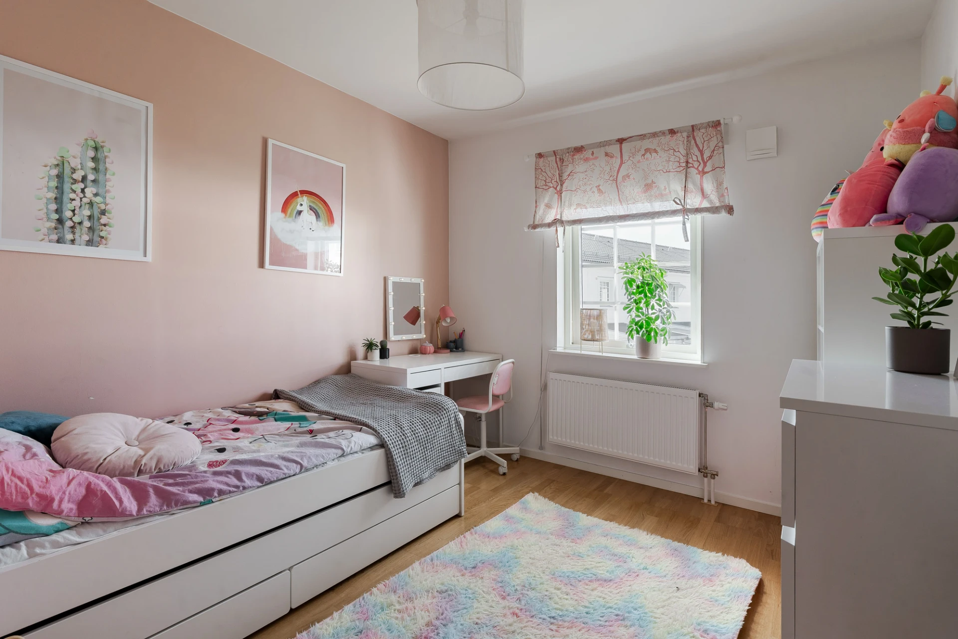 Sovrum med parkettgolv och målade väggar. Plats för säng och skrivbord.
