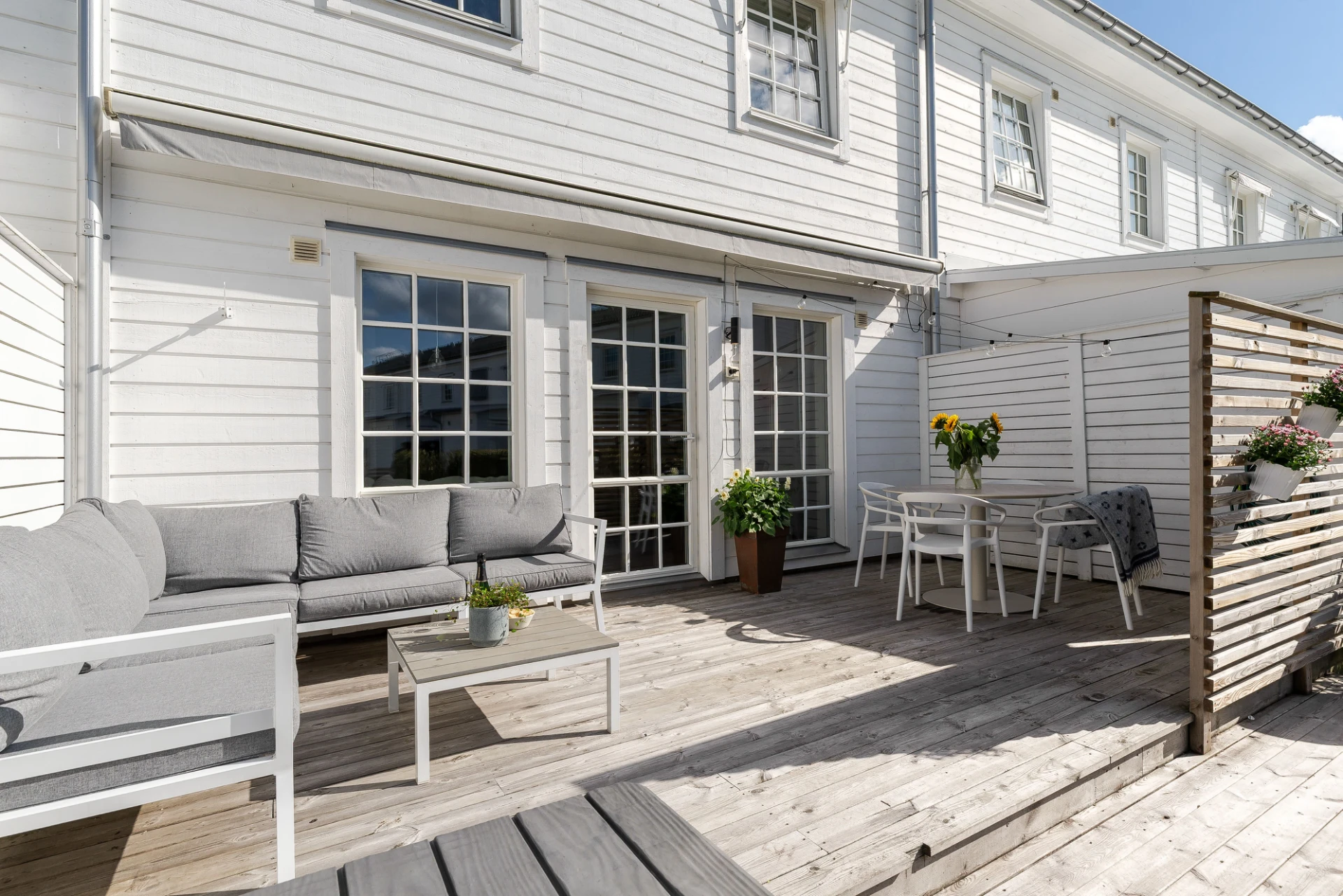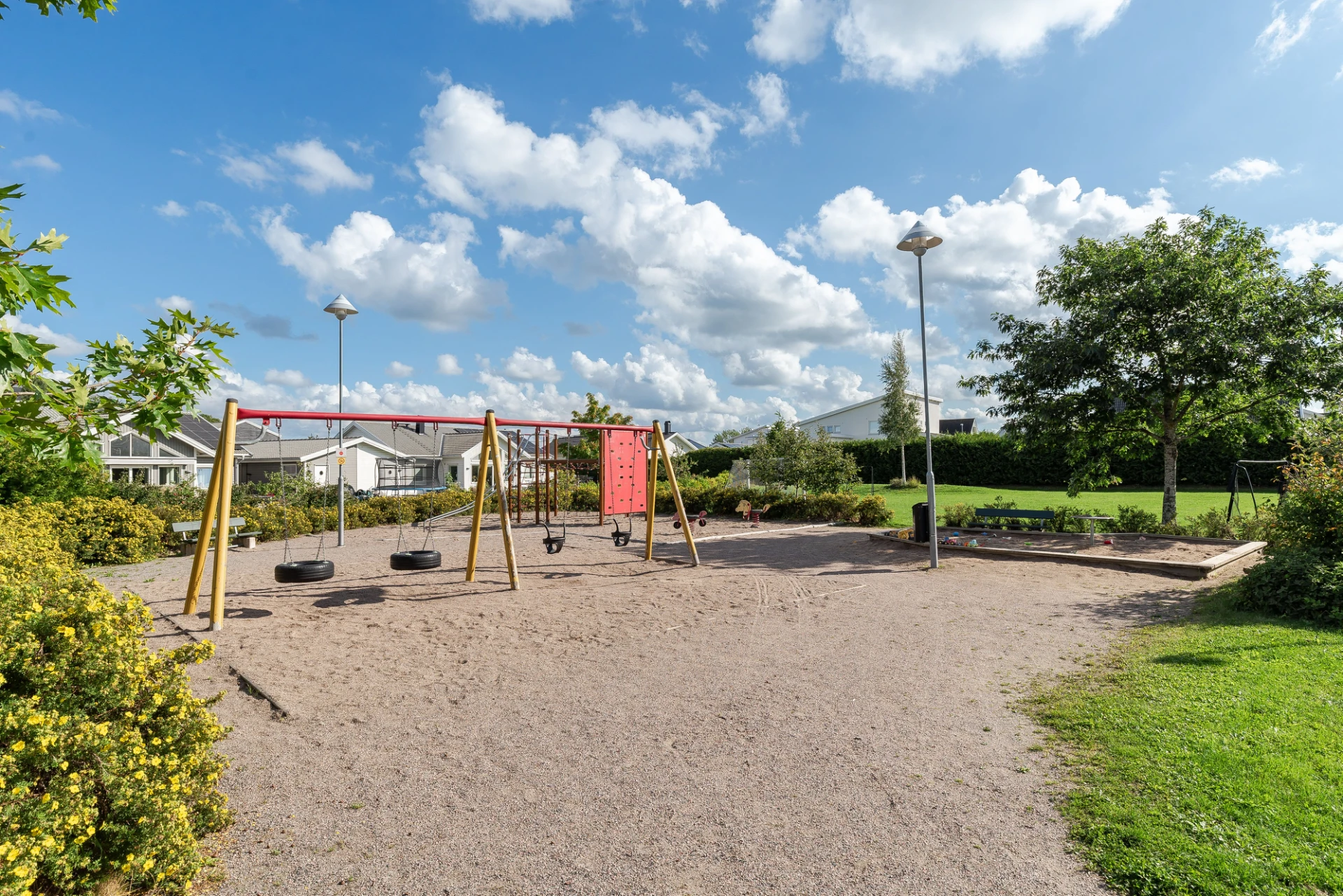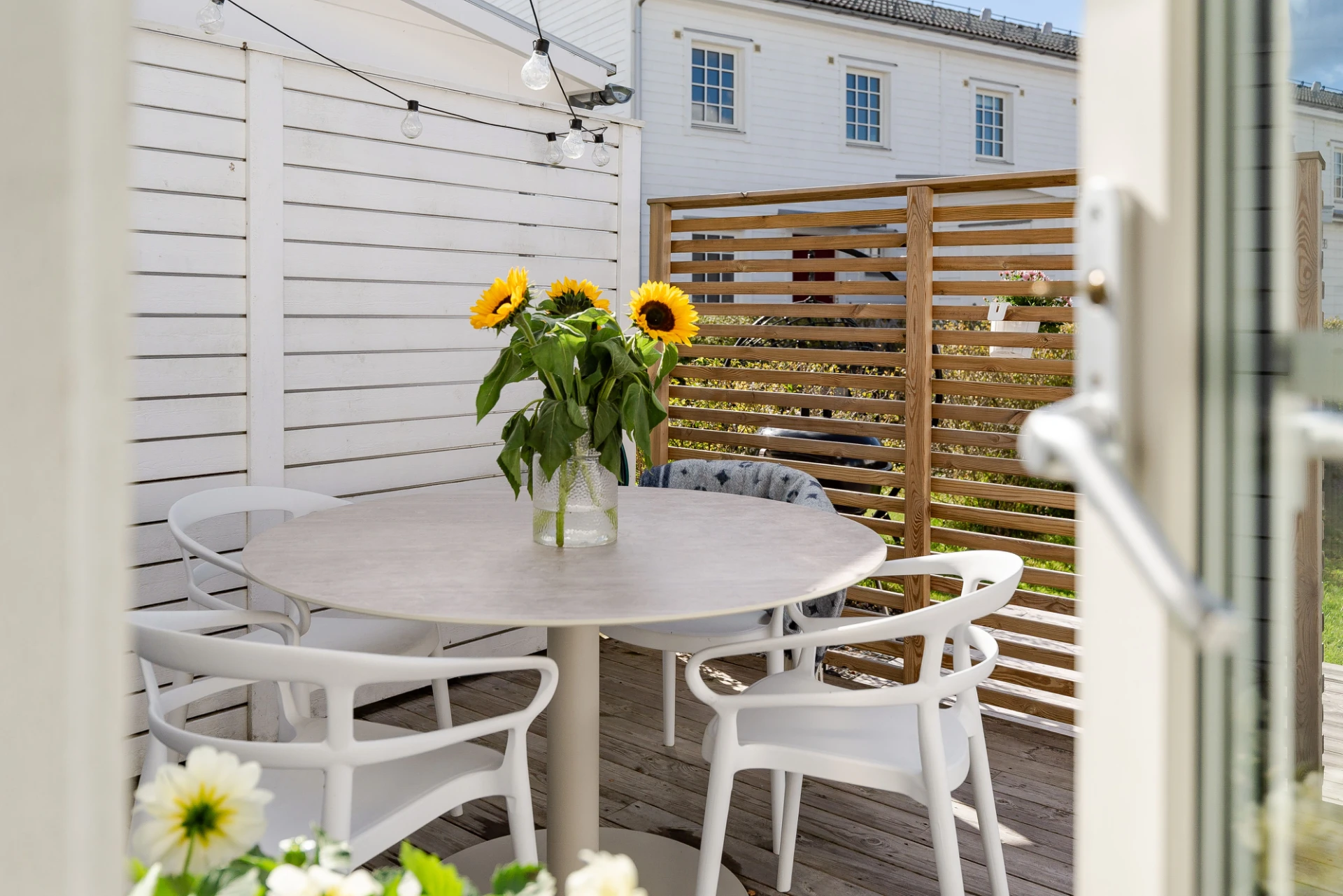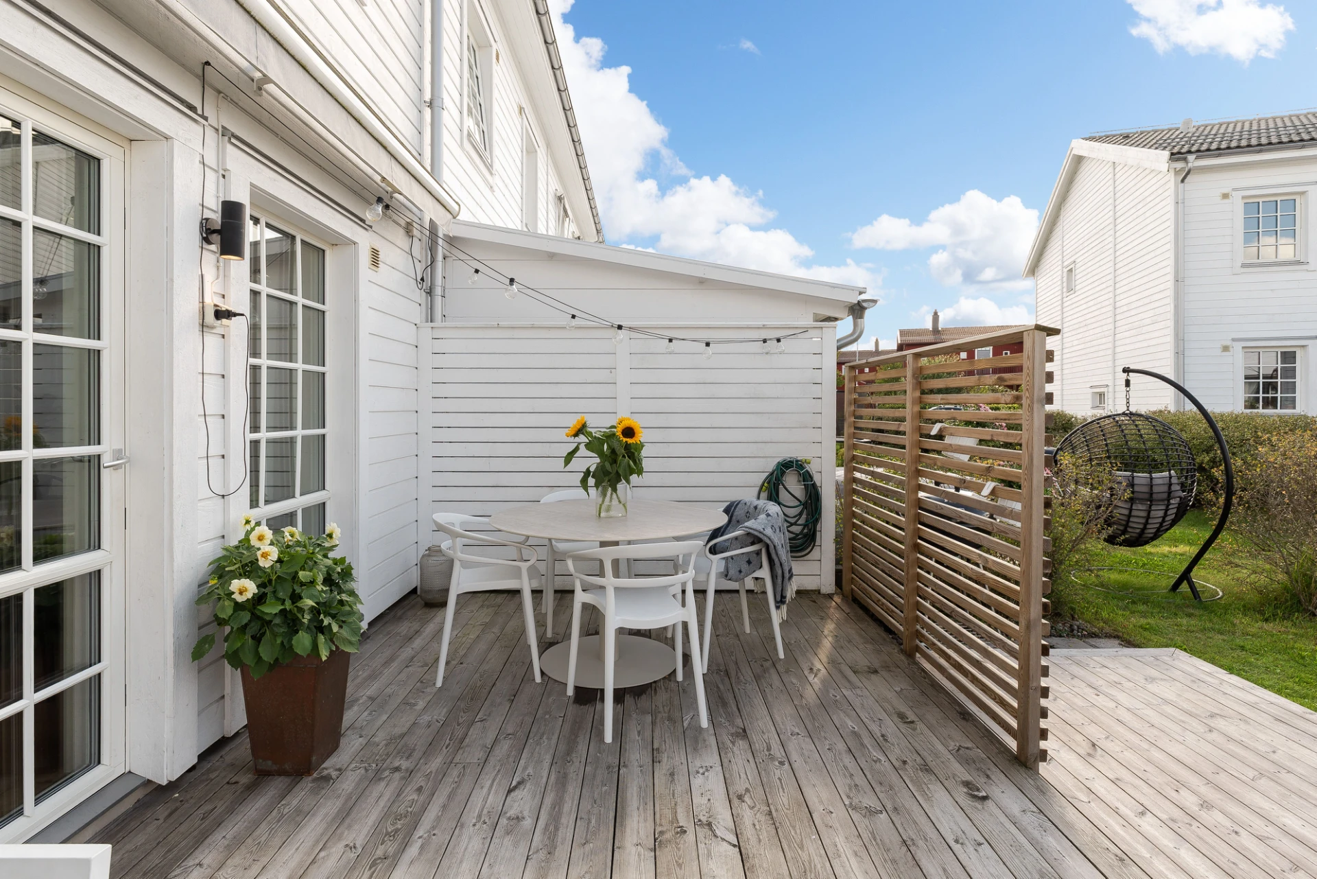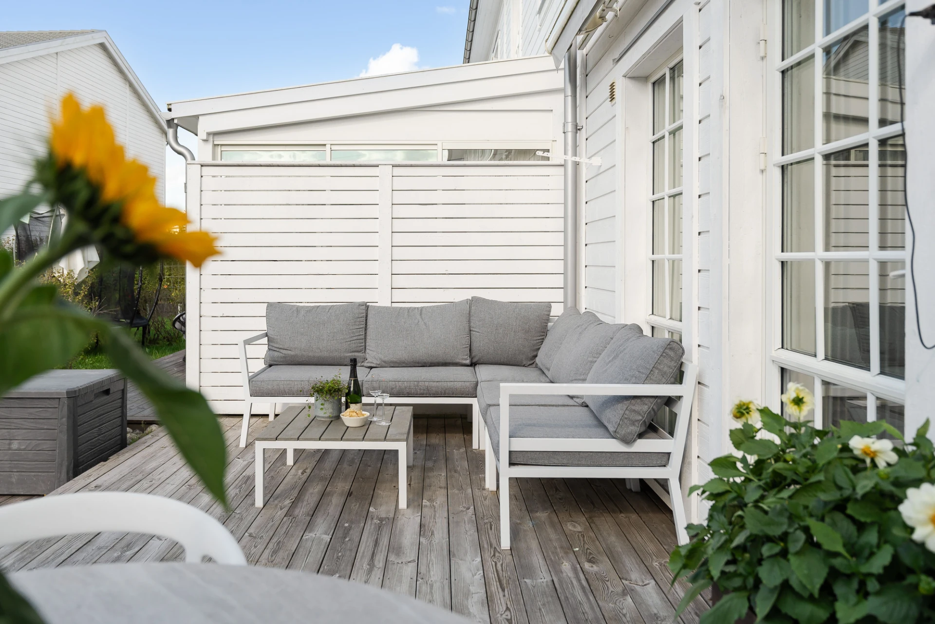 Altan i anslutning till gräsyta direkt västerläge med värmande eftermiddags- och kvällssol.