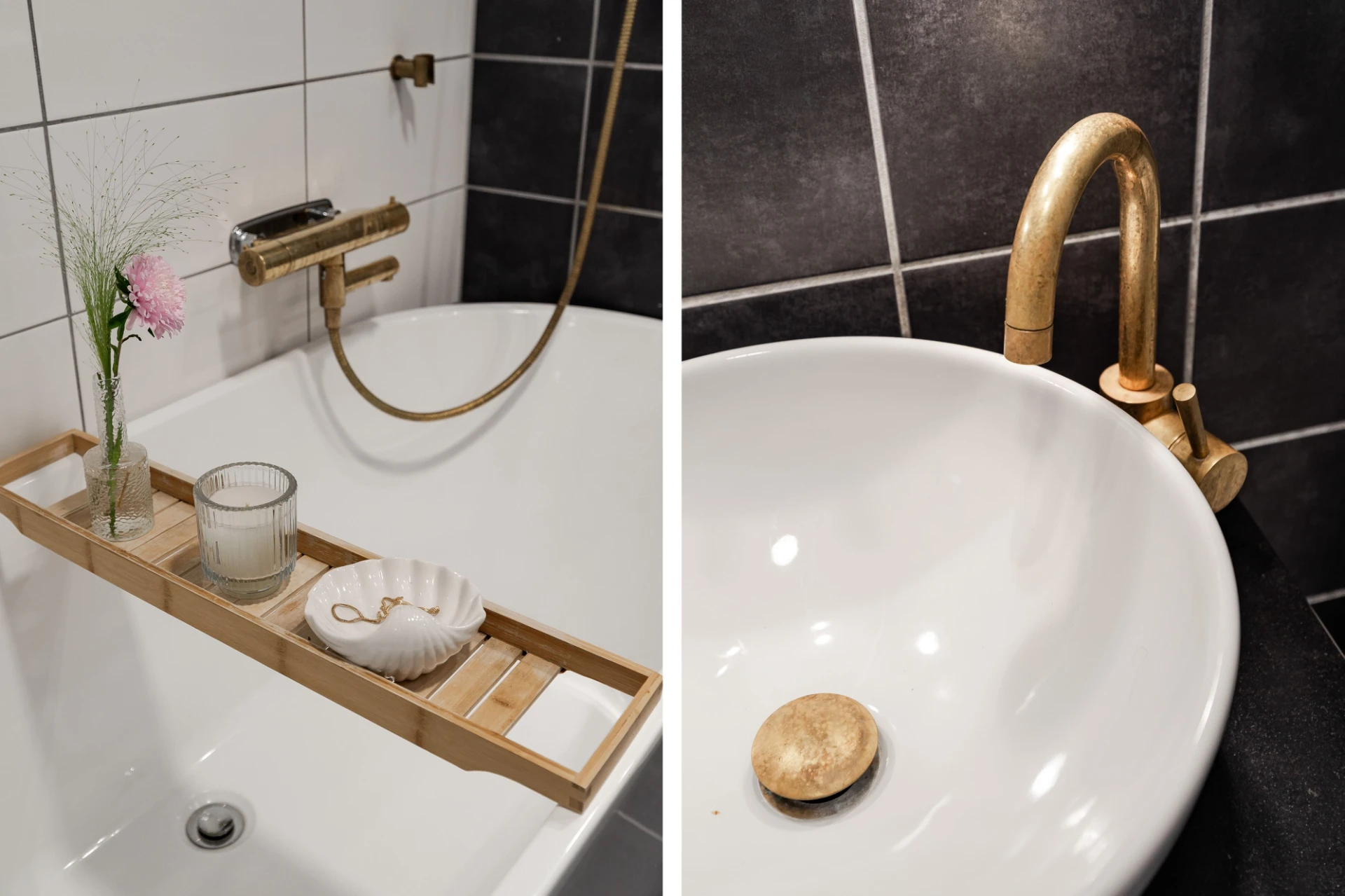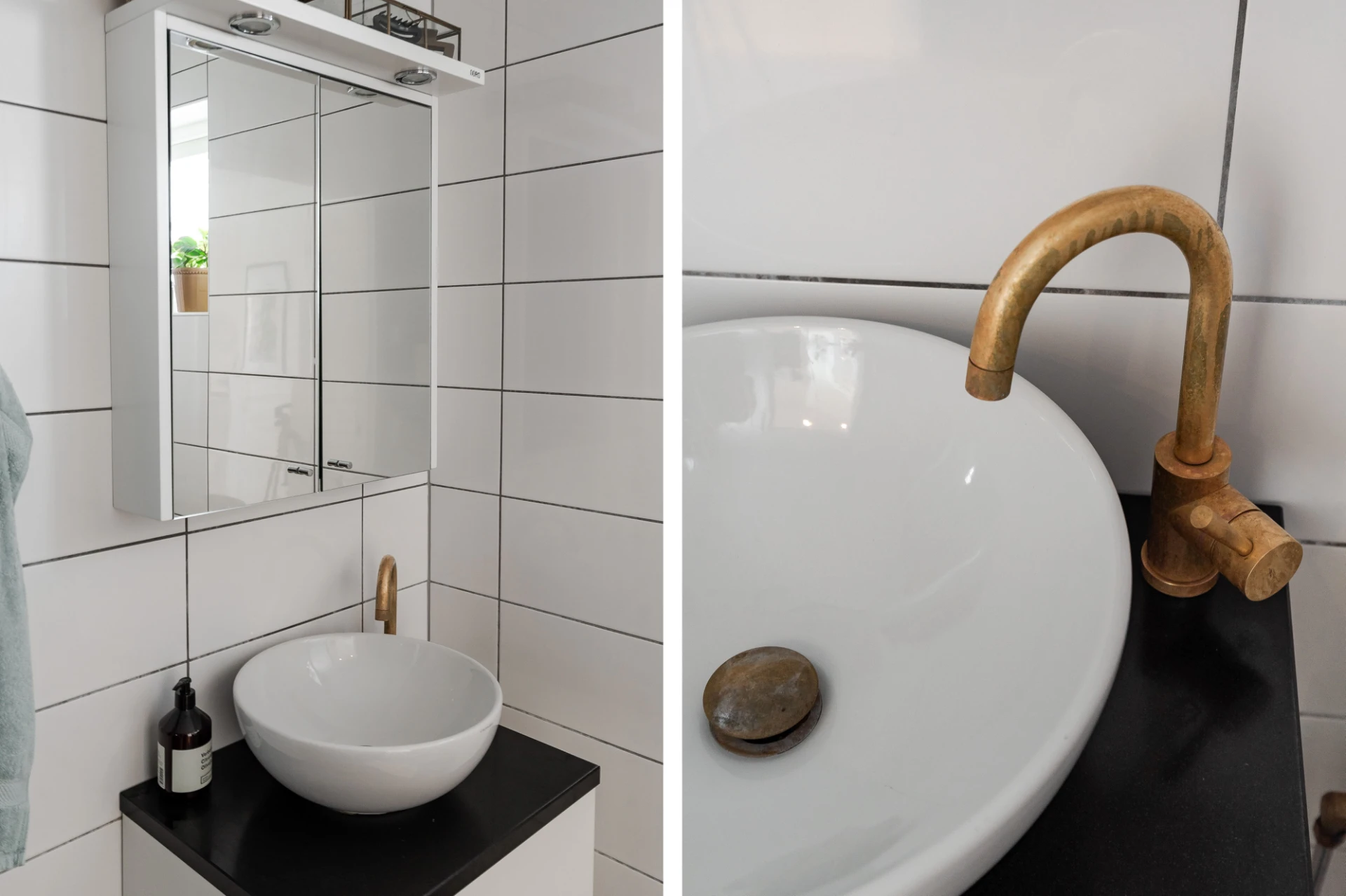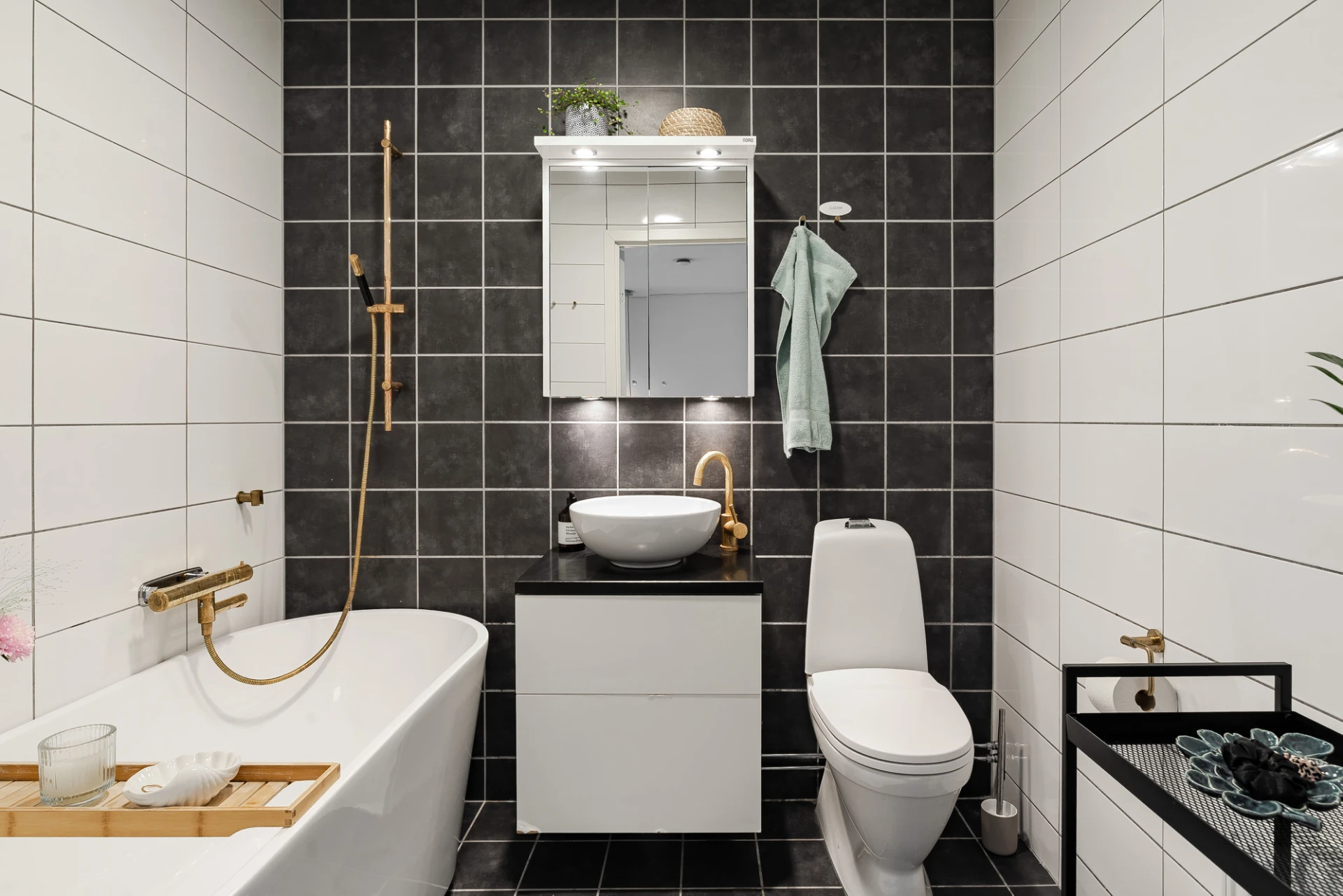 Badrum med kakel och klinker. Här finns toalett, handfat med kommod och badkar. Exklusiva materialval ger en hotellkänsla - bland annat mässingsdetaljer och rundade handfat.