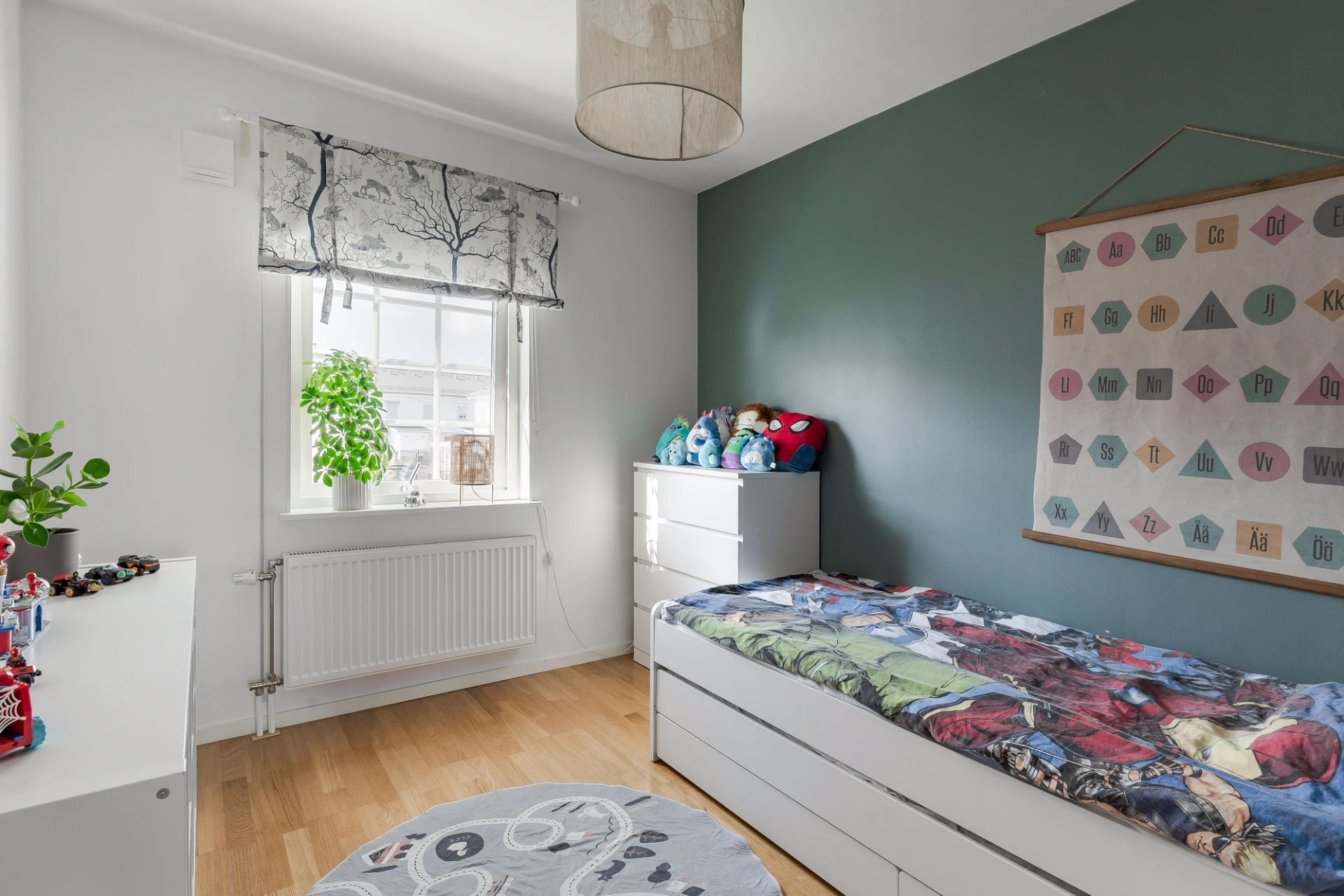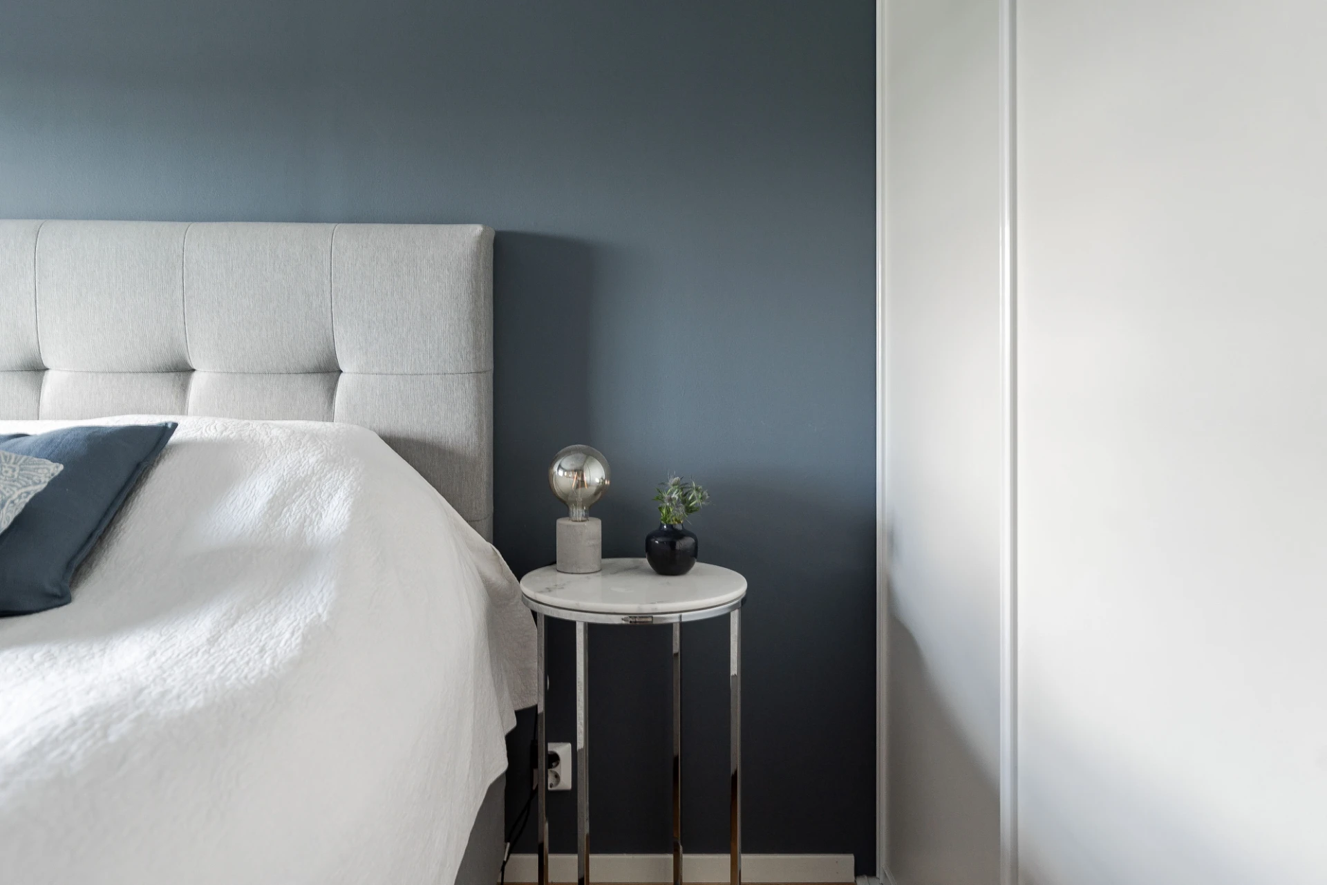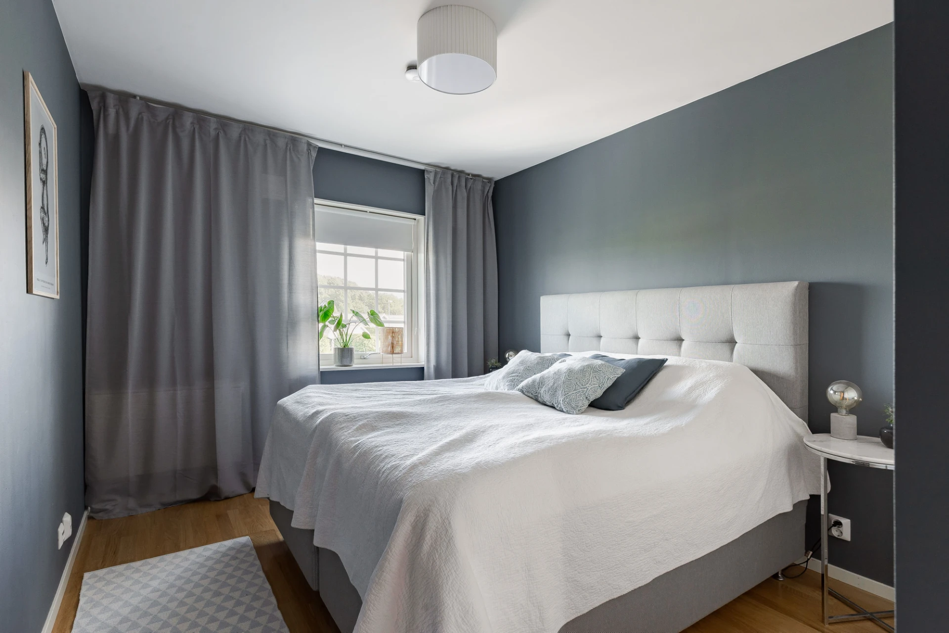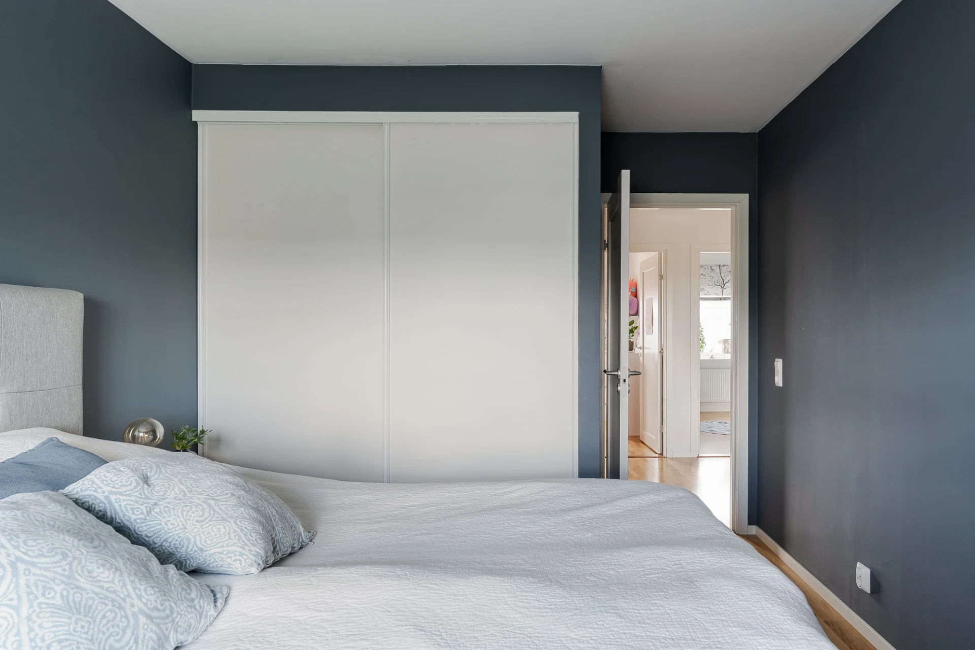 Bostadens största sovrum har parkettgolv och mörkmålade väggar som skapar en harmonisk och ombonad känsla. Här finns en praktisk skjutdörrsgarderob med generös förvaring samt gott om plats för en dubbelsäng.