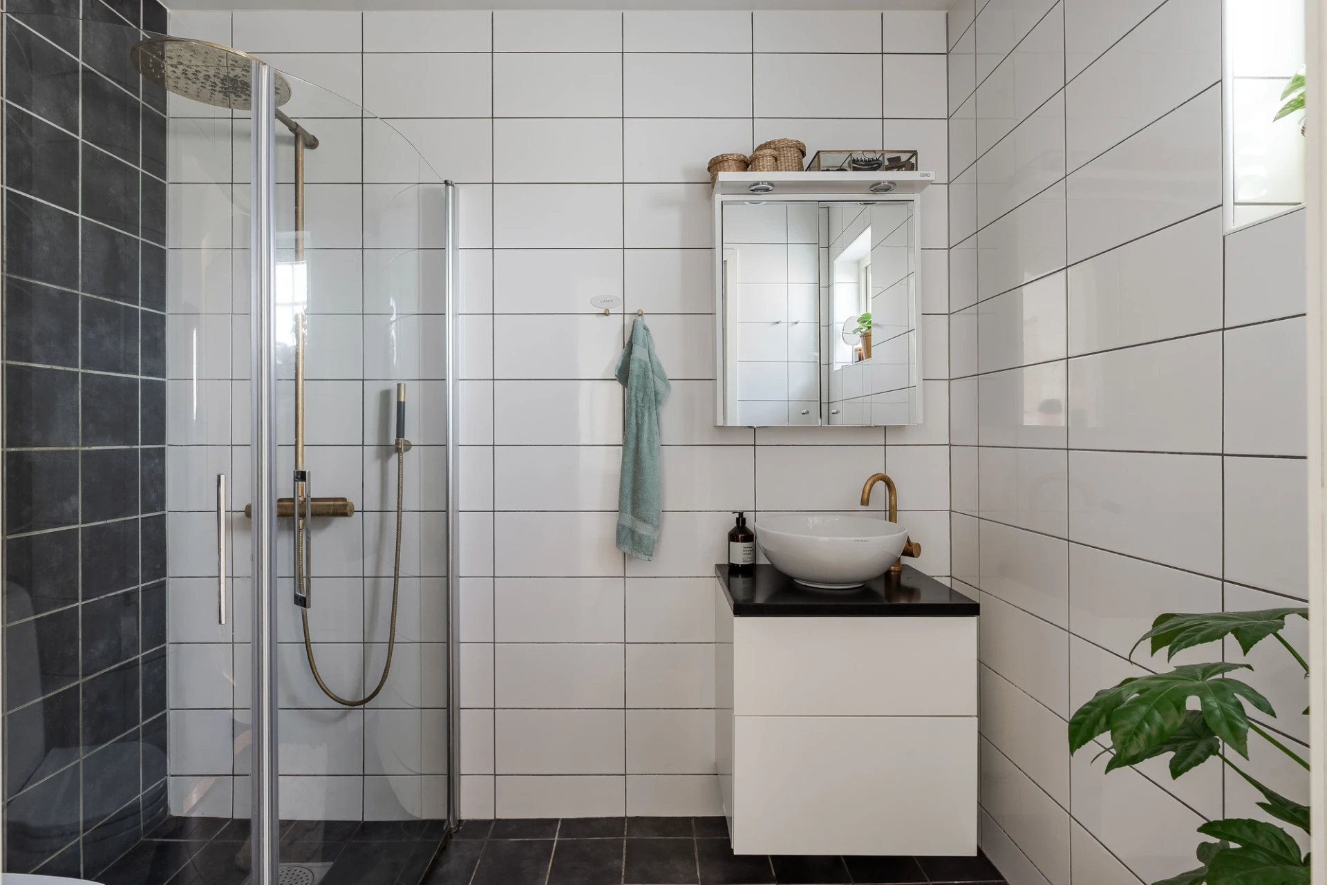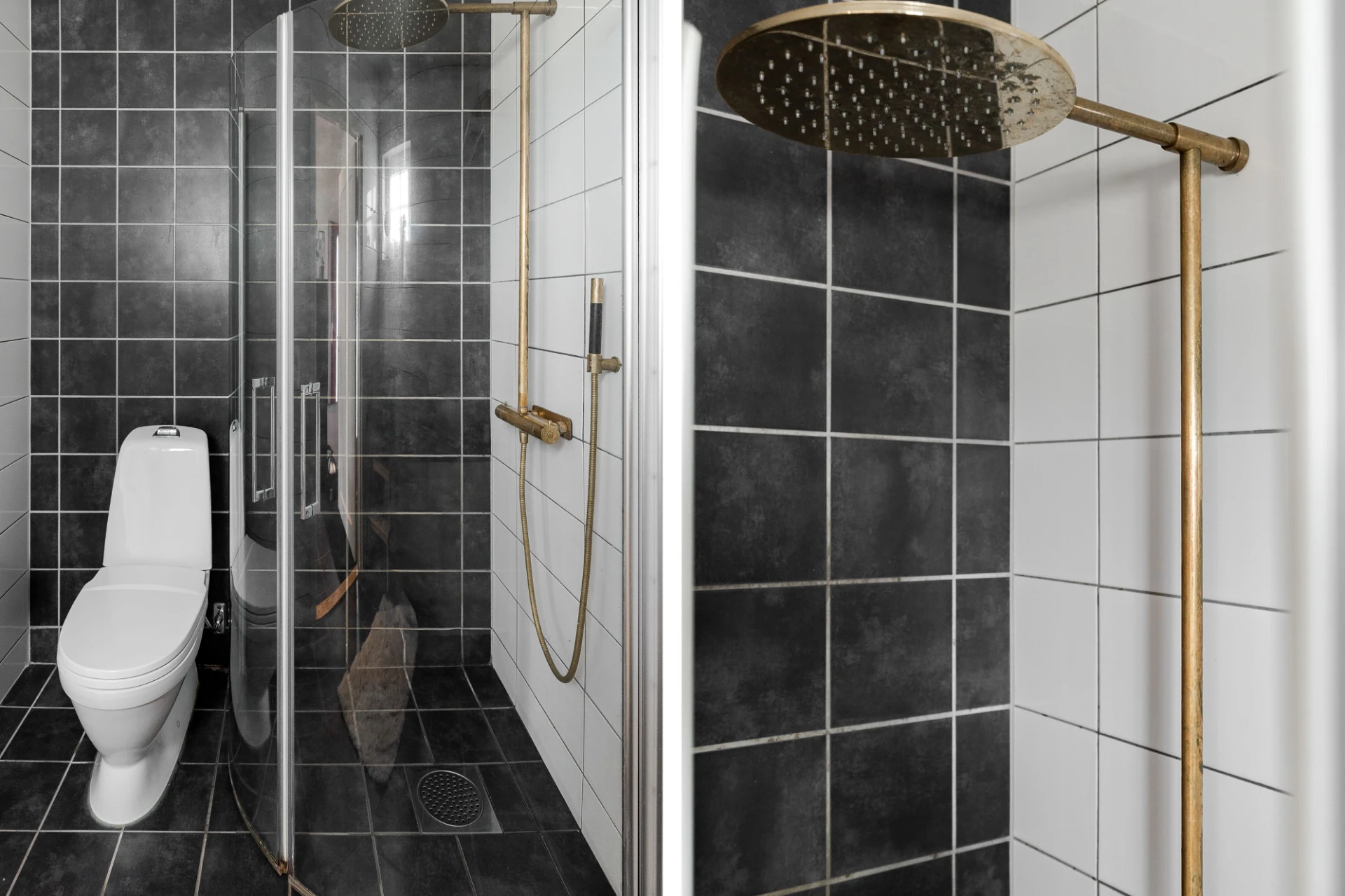 Badrum med kakel och klinker samt golvvärme. Här finns toalett, handfat med kommod och dusch med glasdörrar. Exklusiva materialval ger en hotellkänsla – bland annat mässingsdetaljer, rundade handfat och ett stort duschmunstycke.