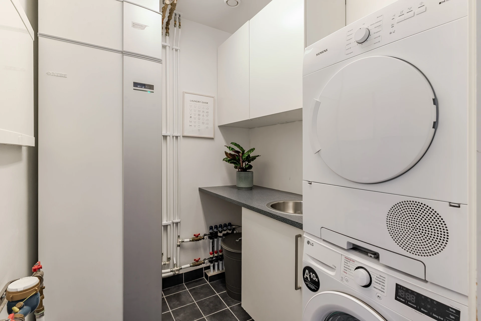Tvättstuga med målade väggar och klinkergolv. Tvättmaskin, torktumlare och tvättho.