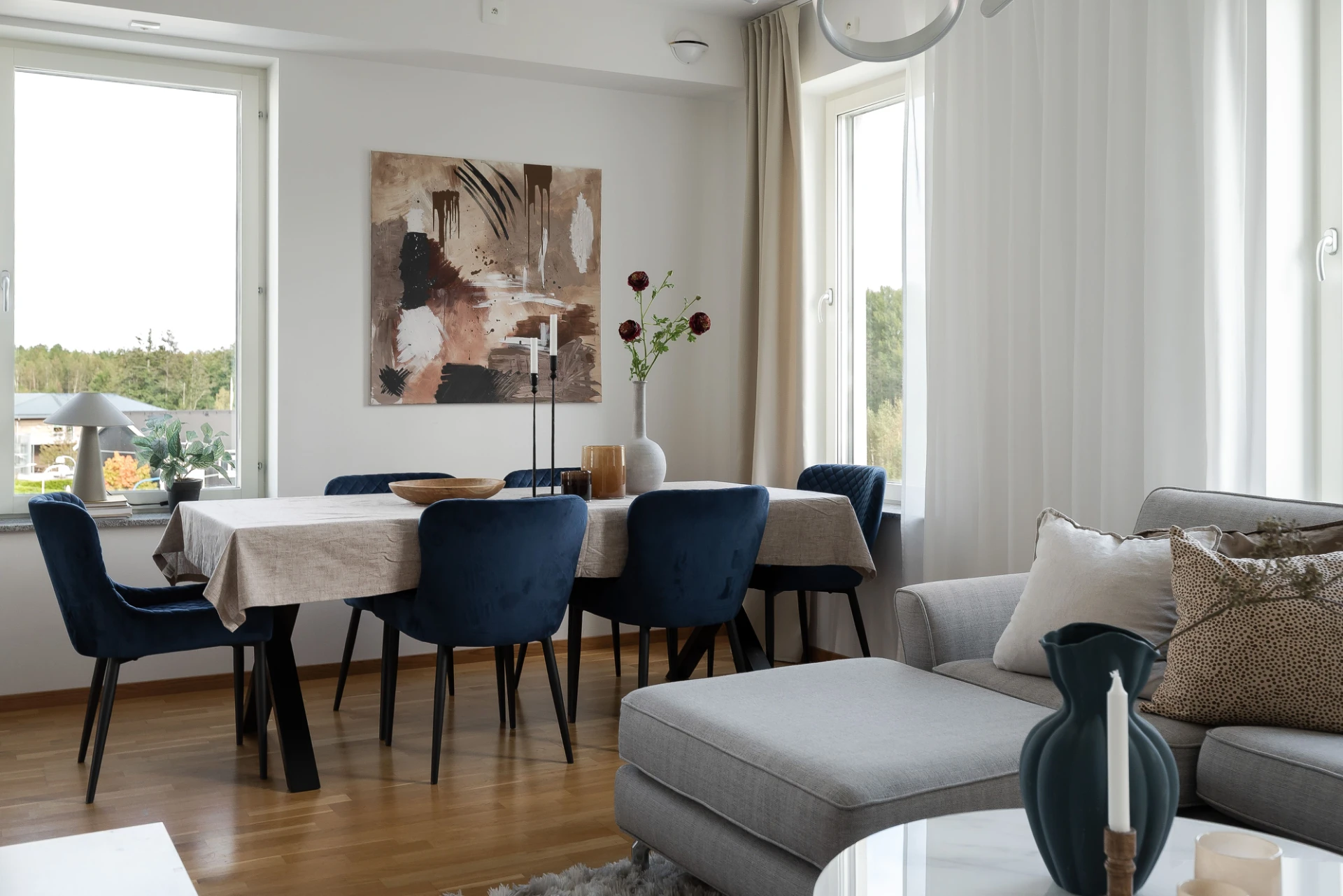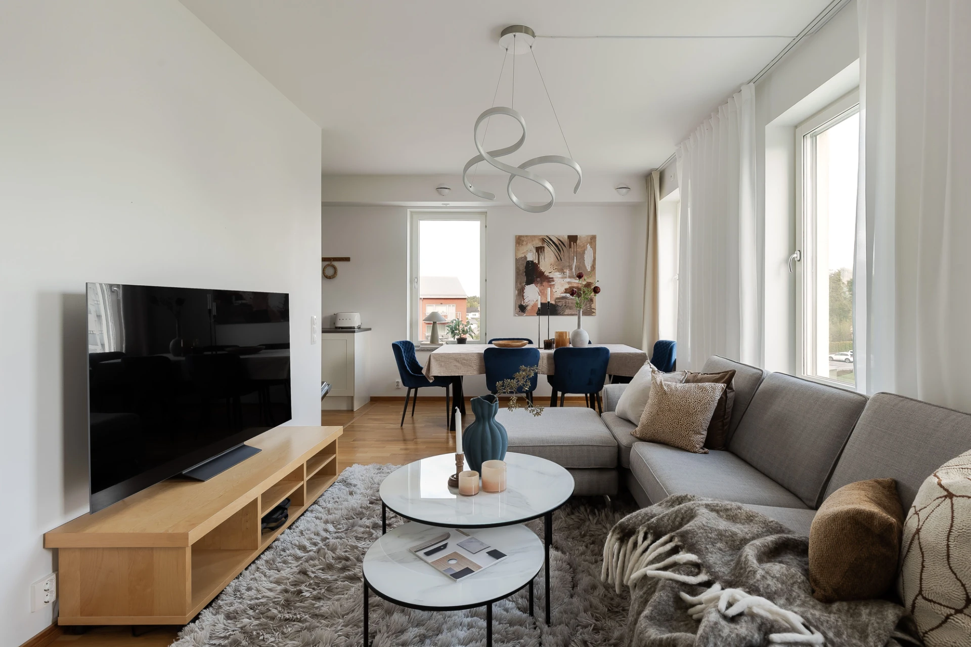 Ett ljust vardagsrum som smidigt integreras med köket, vilket skapar en öppen och luftig atmosfär i hemmet. Målade väggar och parkettgolv.