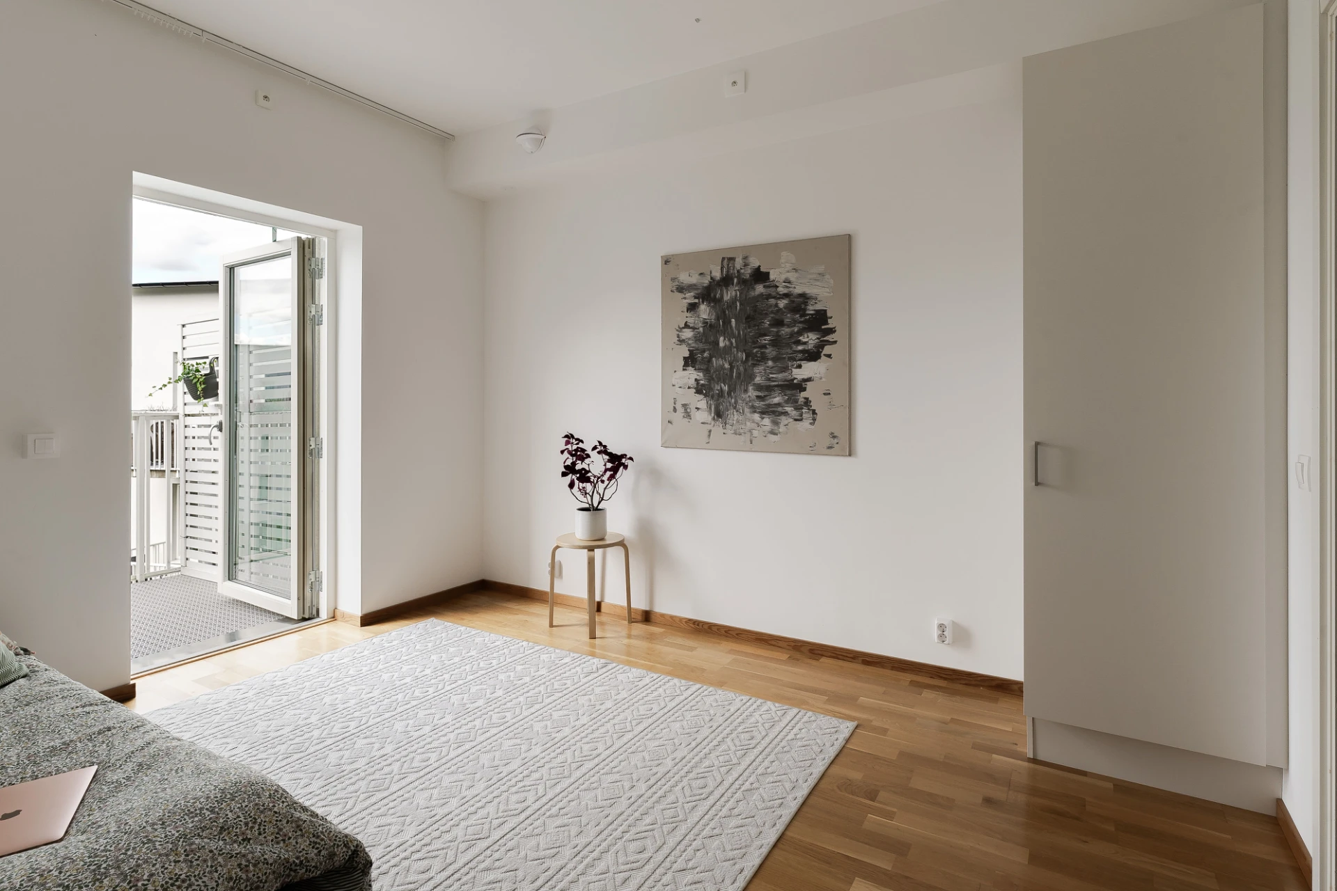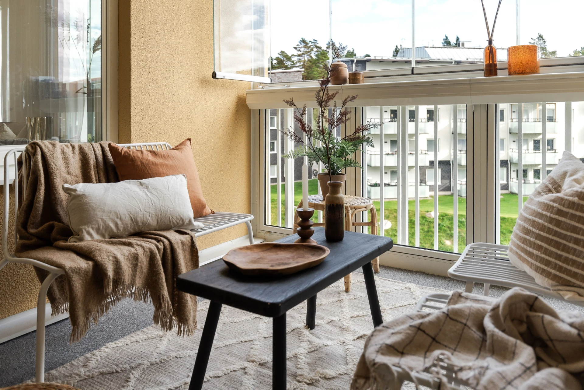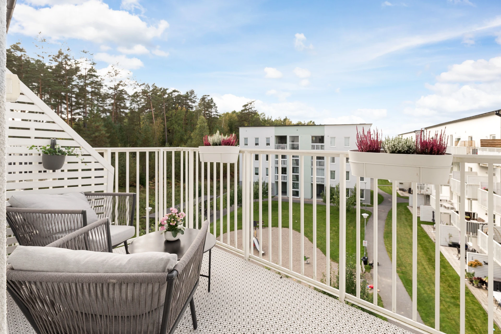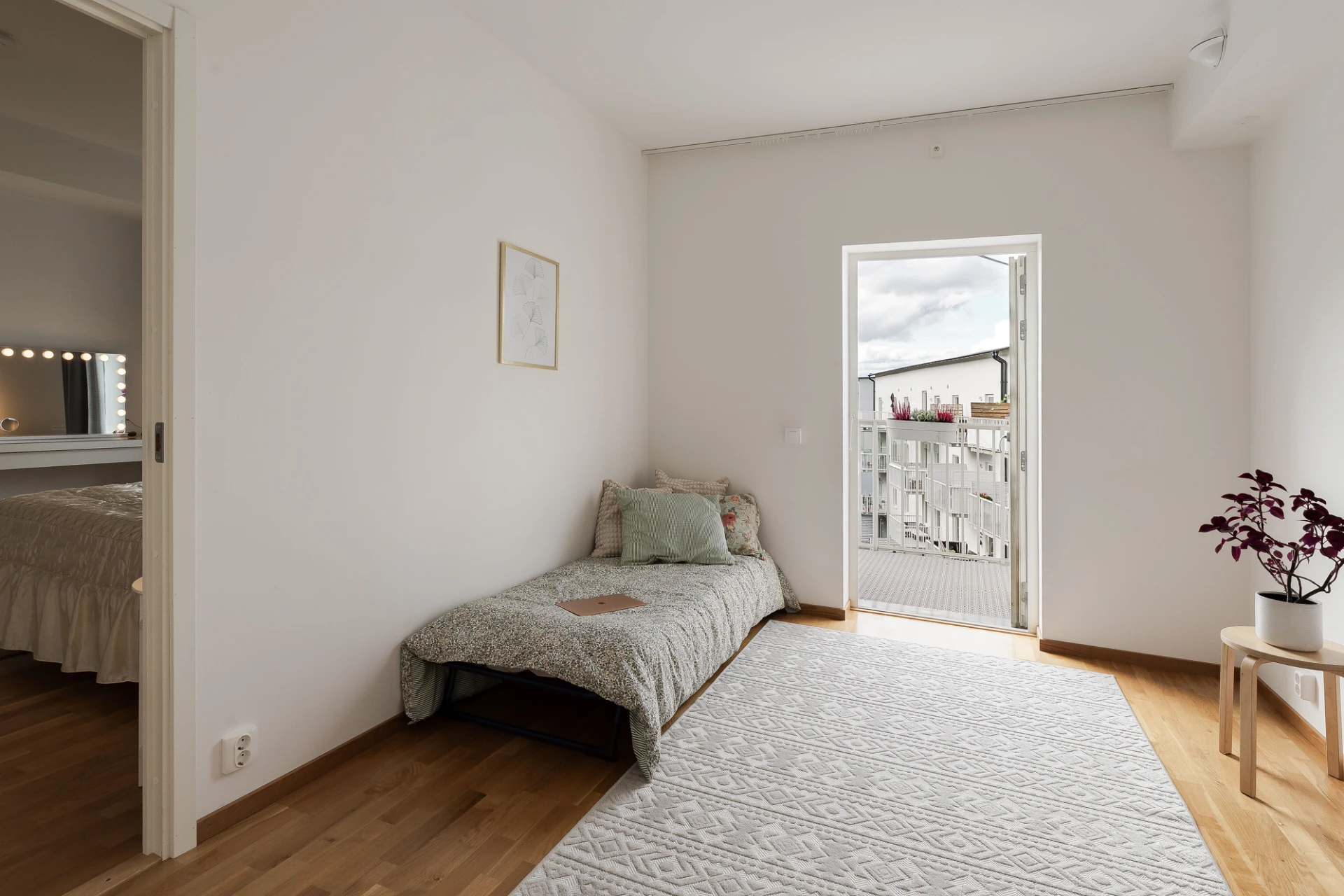 Lägenheten erbjuder två balkonger med olika karaktär: den inglasade blir som ett extra rum större delen av året, medan balkongen mot innergården ger en avskild plats för lugn och avkoppling. Tack vare läget flödar ljuset in från morgon till lunch i vardagsrum, hall och kök, medan sovrum och balkong badar i sol från tidig eftermiddag till sena kvällen under sommarmånaderna.