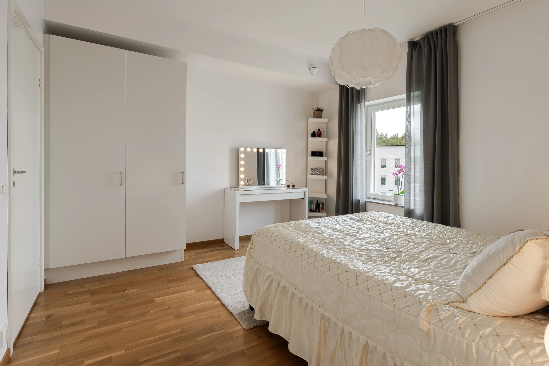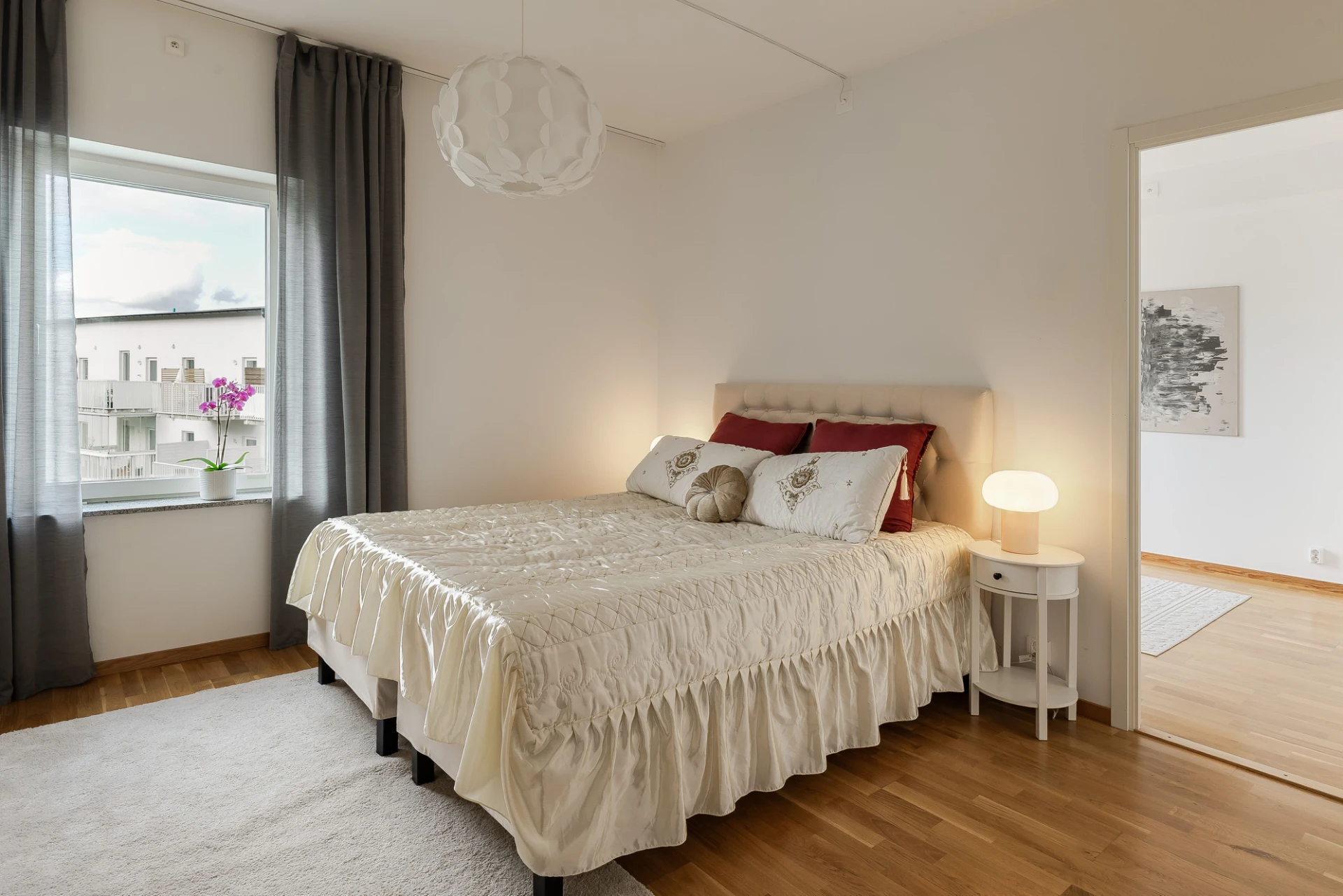 Ett mysigt sovrum med utrymme för en dubbelsäng och skrivbord. Förvaring i två garderober. Målade väggar och parkettgolv.