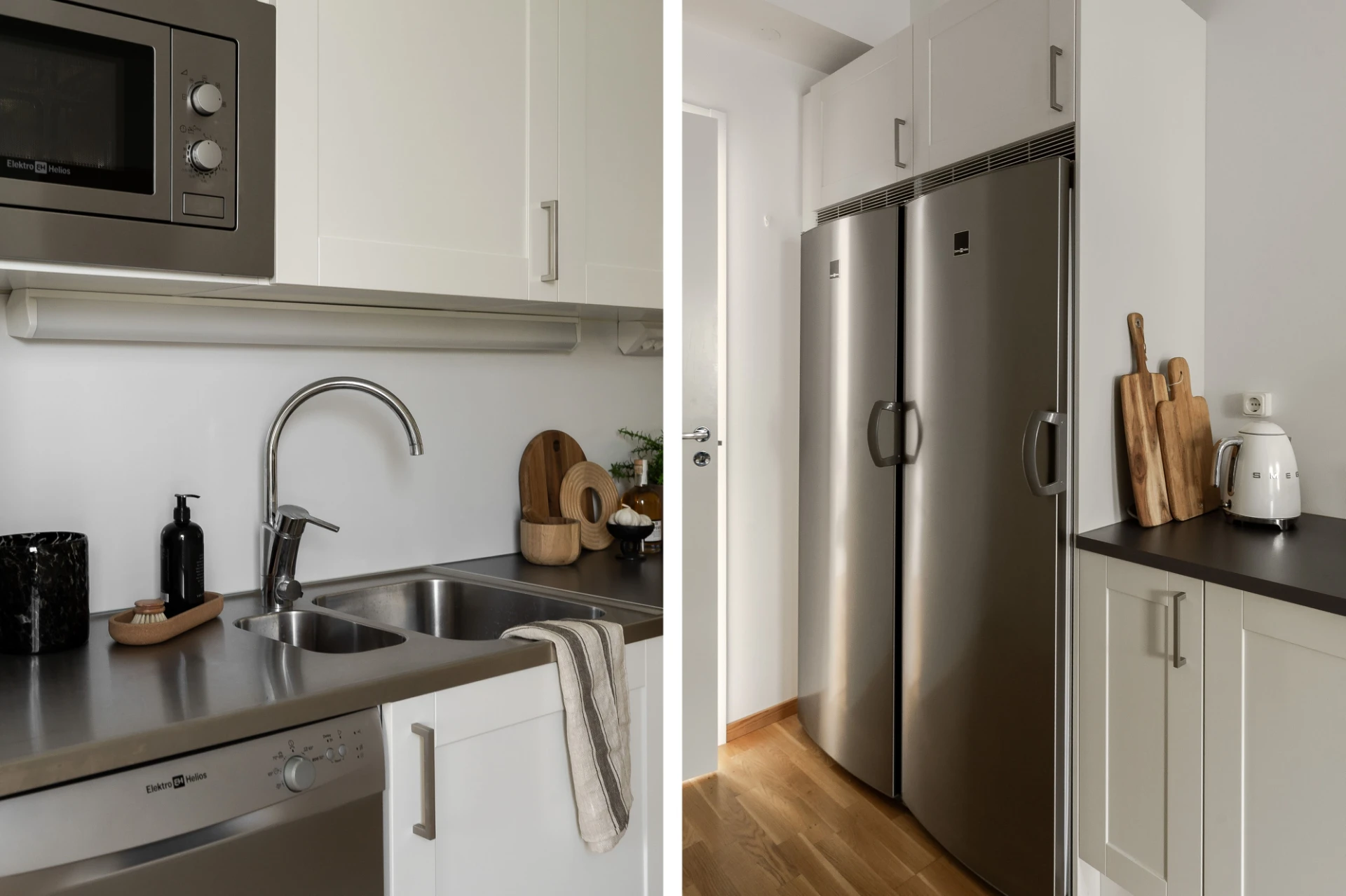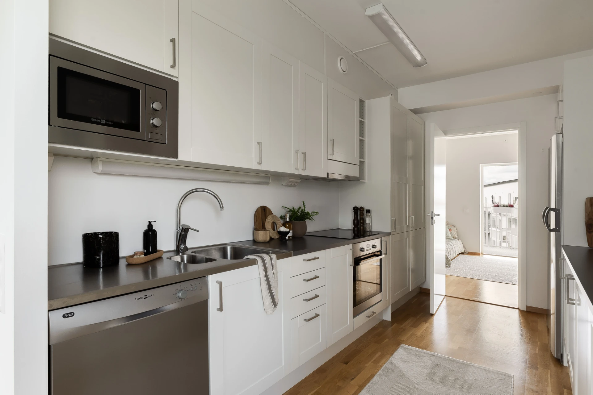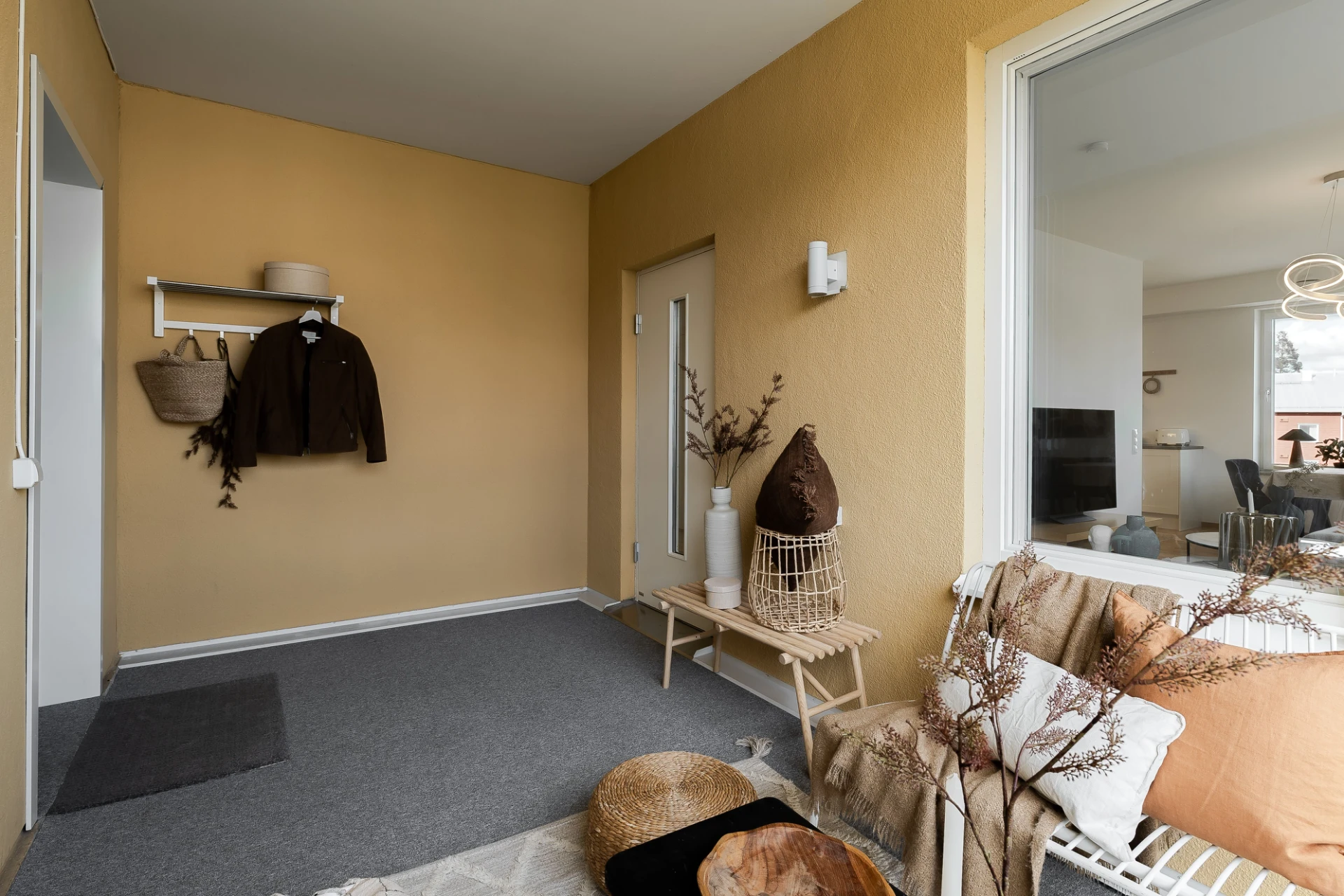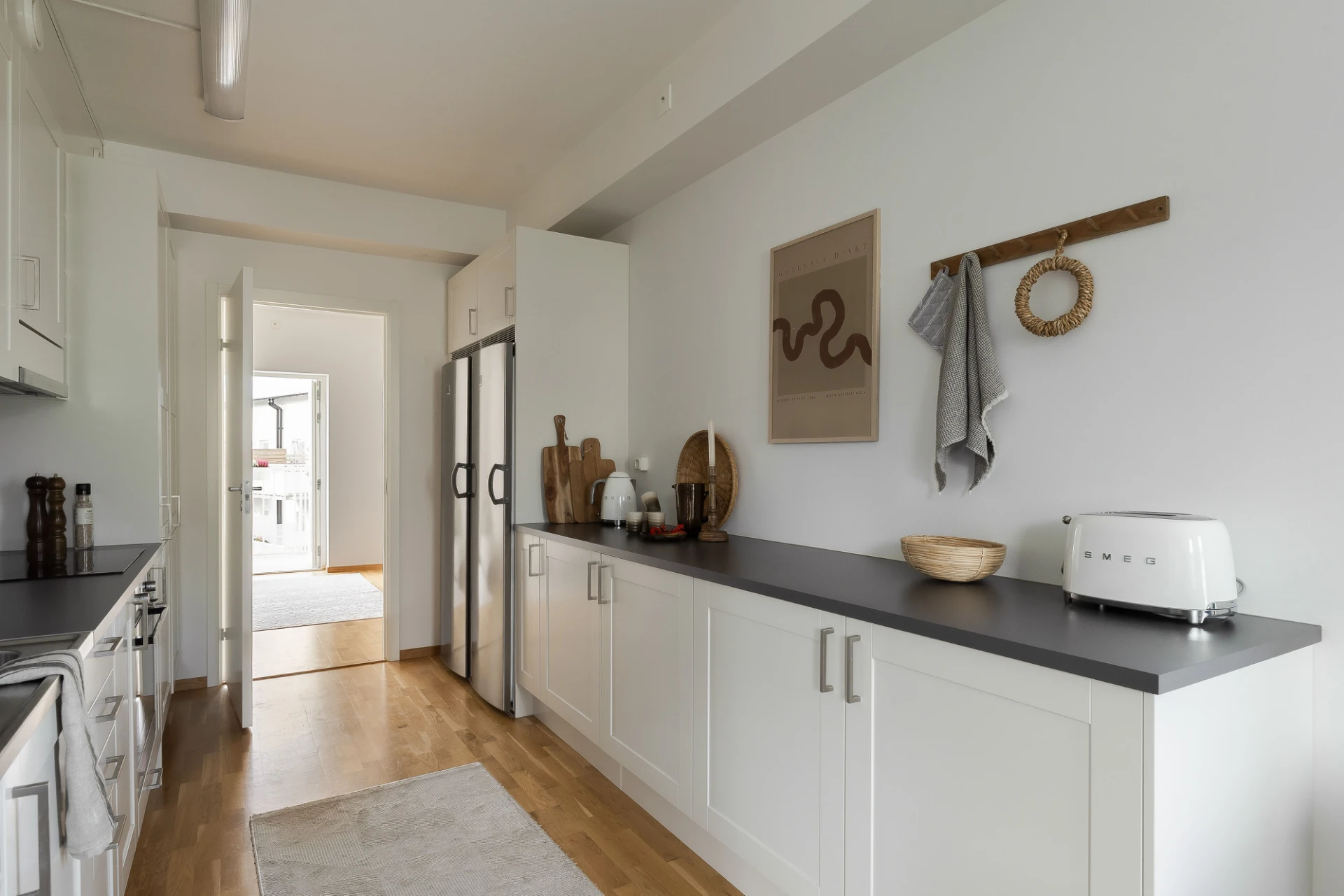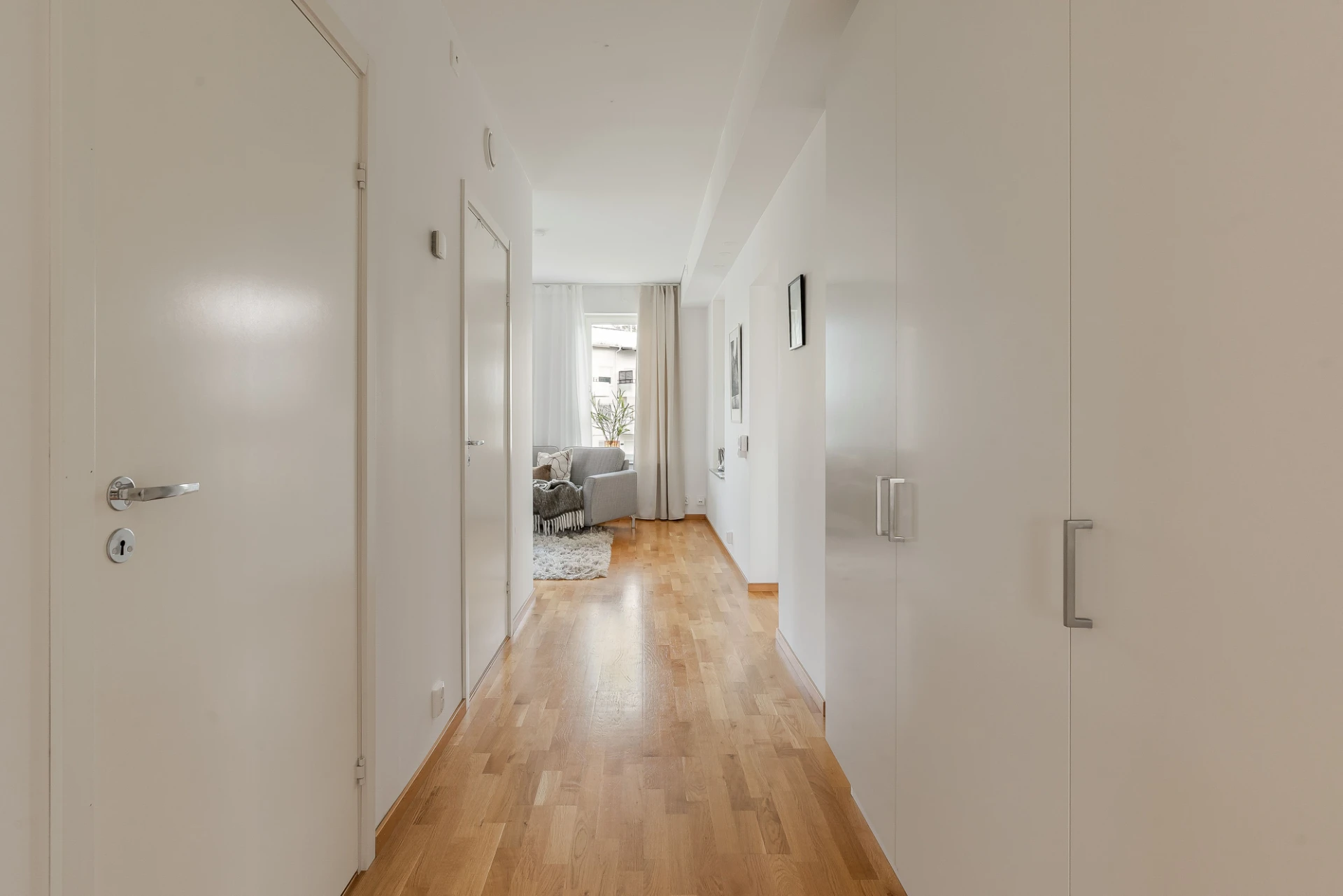 Hallen och resten av lägenheten har gott om förvaring vilket gör vardagen enkel, och köket är modernt utrustat med bra arbetsytor. Vardagsrummet är inbjudande och har plats för både soffhörna och matbord. Det större sovrummet rymmer generöst med förvaring, och badrummet är helkaklat och försett med både tvättmaskin och torktumlare.