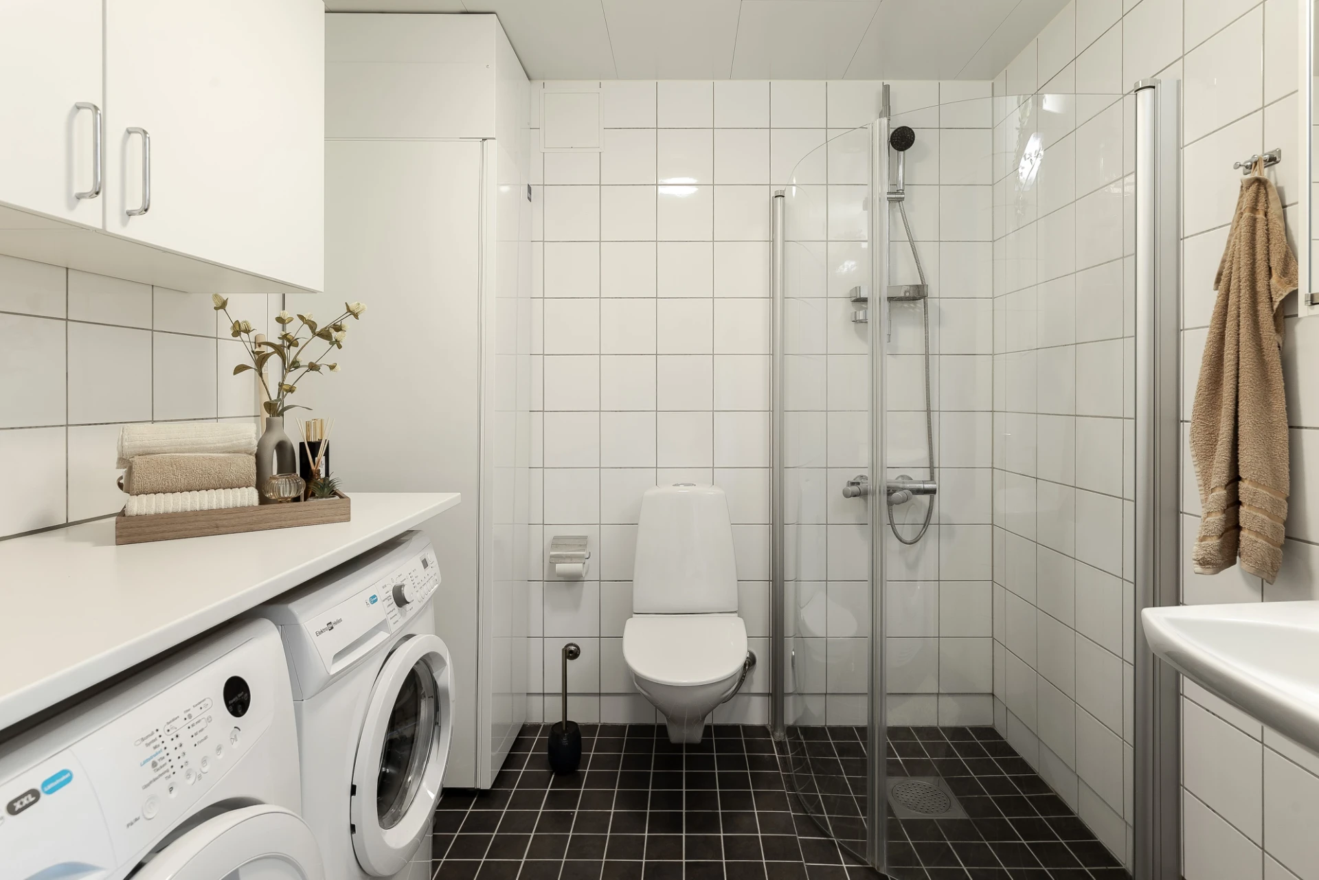 Ett komplett badrum med WC, dusch, handfat och spegelskåp. Dessutom finns en praktisk tvättavdelning med både tvättmaskin och torktumlare, arbetsbänk och förvaring i väggskåp. Väggarna är kaklade och golvet pryds av klinker, vilket ger en snygg och funktionell atmosfär.