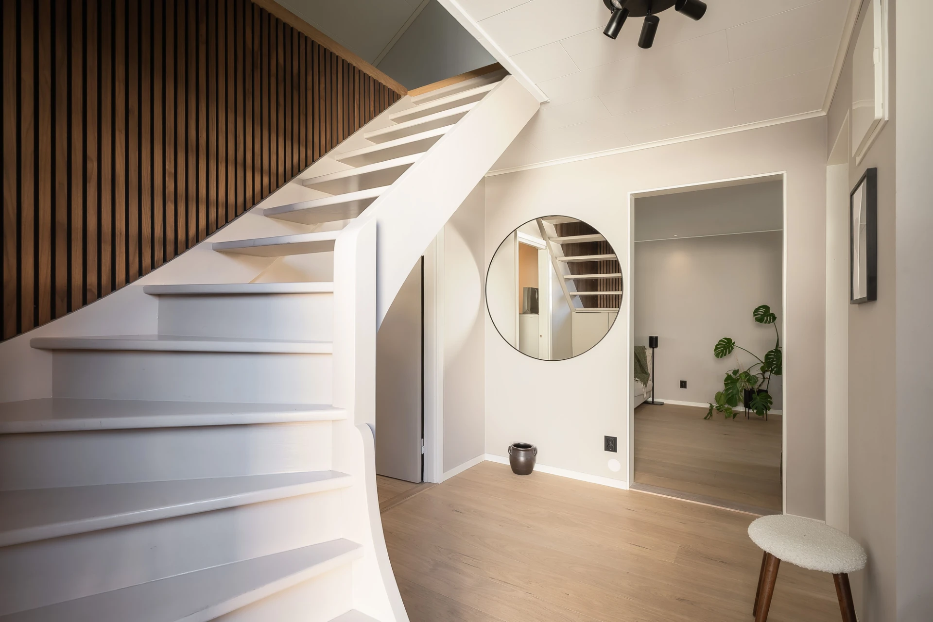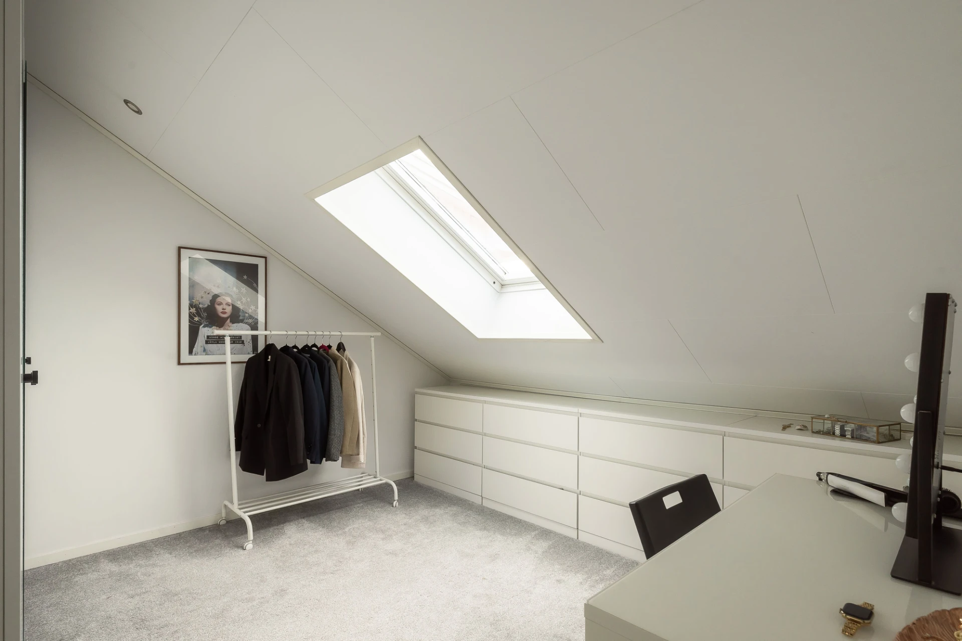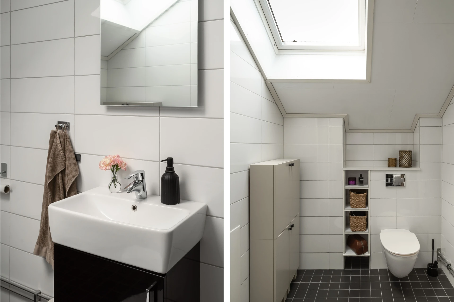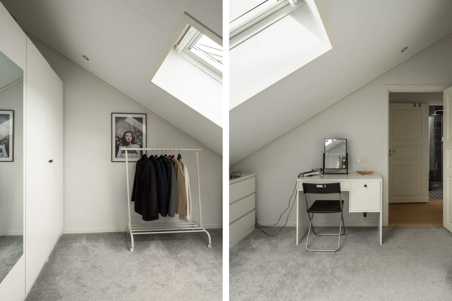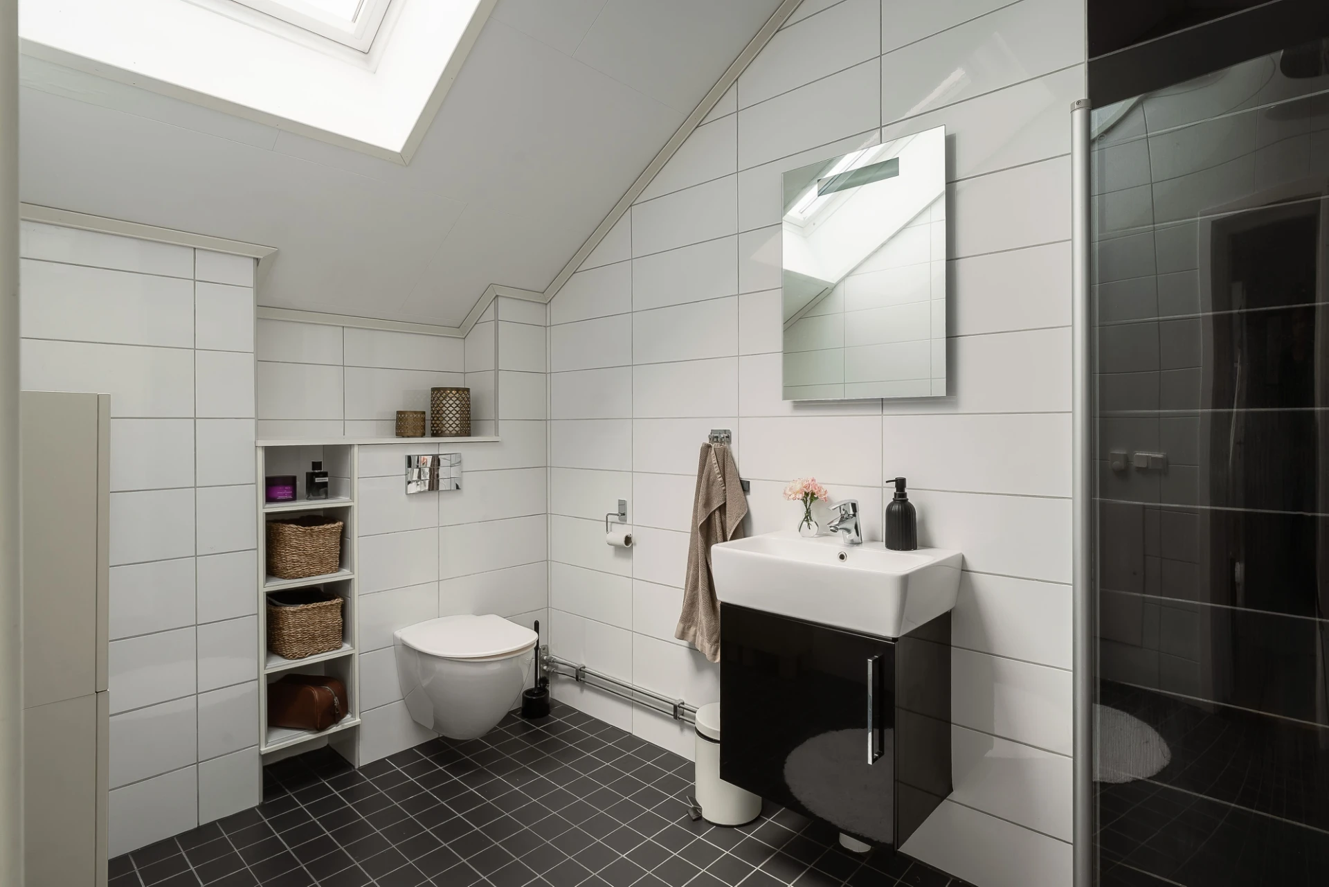 Vitmålade väggar samt heltäckningsmatta. Takfönster, spotlights samt golvvärme.