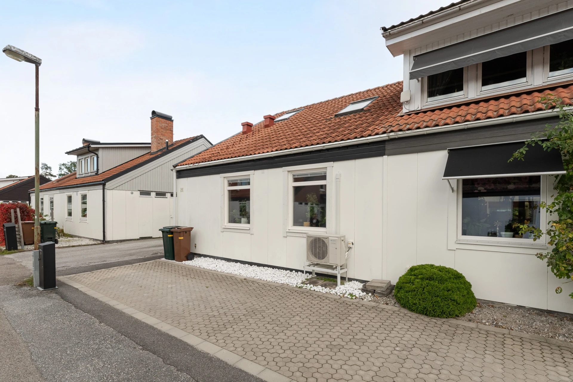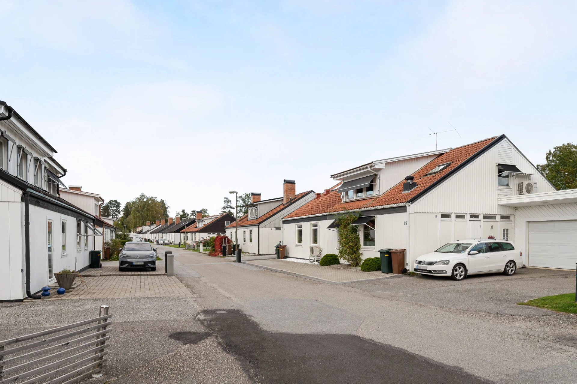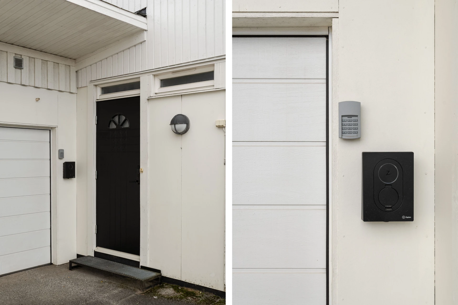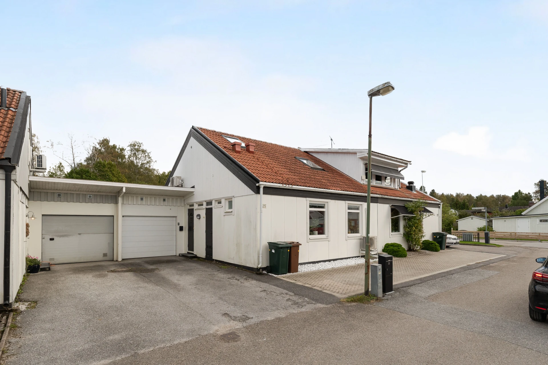 Garage med elstyrd port och ett stort förråd och parkering på uppfart. Här finns också en elbildsladdare. Ytan mellan huset och gatan är plattsatt, även här kan en bil parkeras.