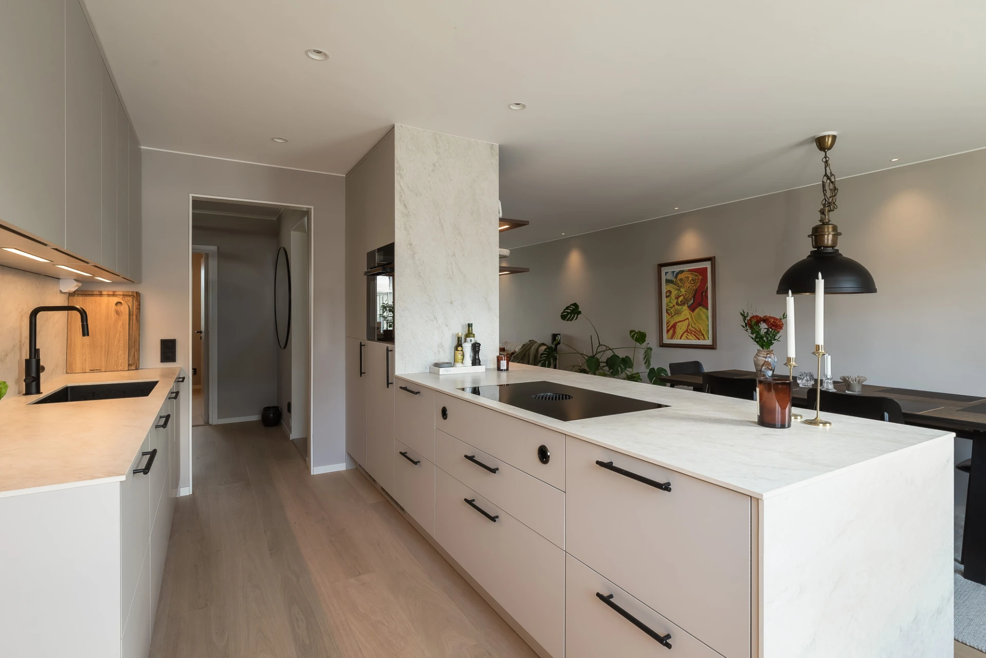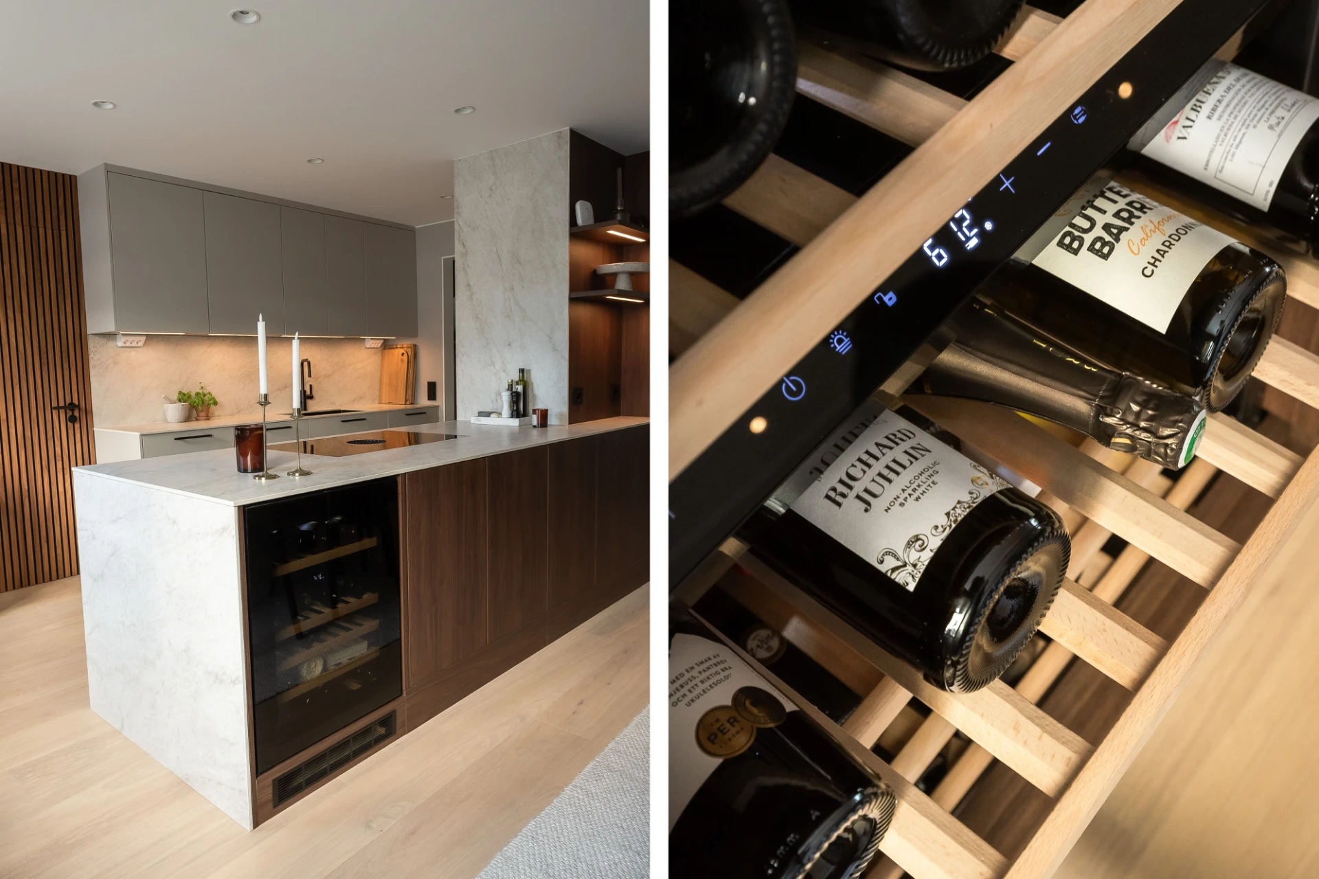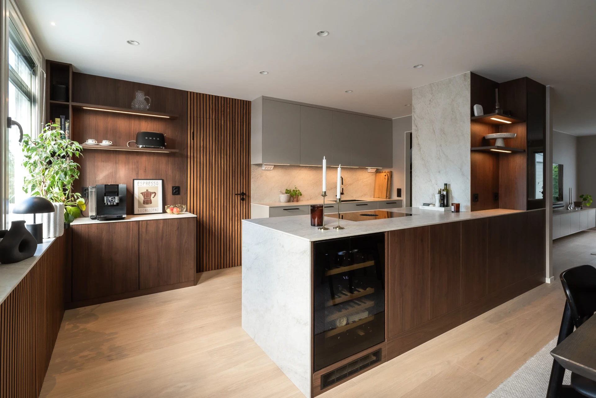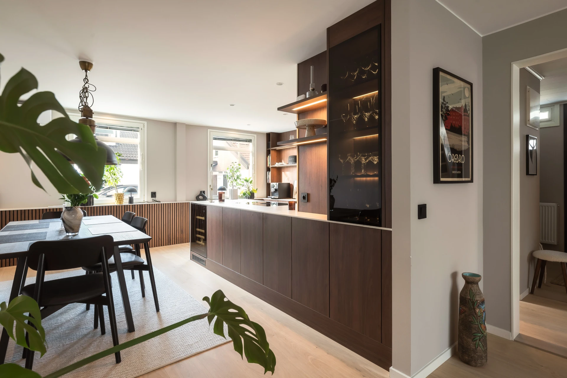 Mycket smakfullt renoverat kök med parkettgolv samt målade väggar. Köksluckor i valnöt/sand med köksbänkar och stänkskydd i granitkeramik (Bricmate). Köket är fullt utrustat med vitvaror från 2023 då köket renoverades. För en extra lyxig känsla finns vinkyl, spotlights infällda i tak och köksskåp och vitrinskåp. Köket har motorer till nedre delen av kökslådorna på ena sidan. Platsbyggda elementskydd och fönsterbräda som följer kökets utseende på ett fint sätt!