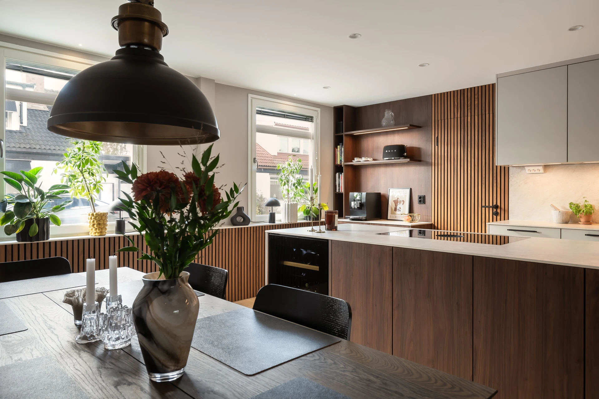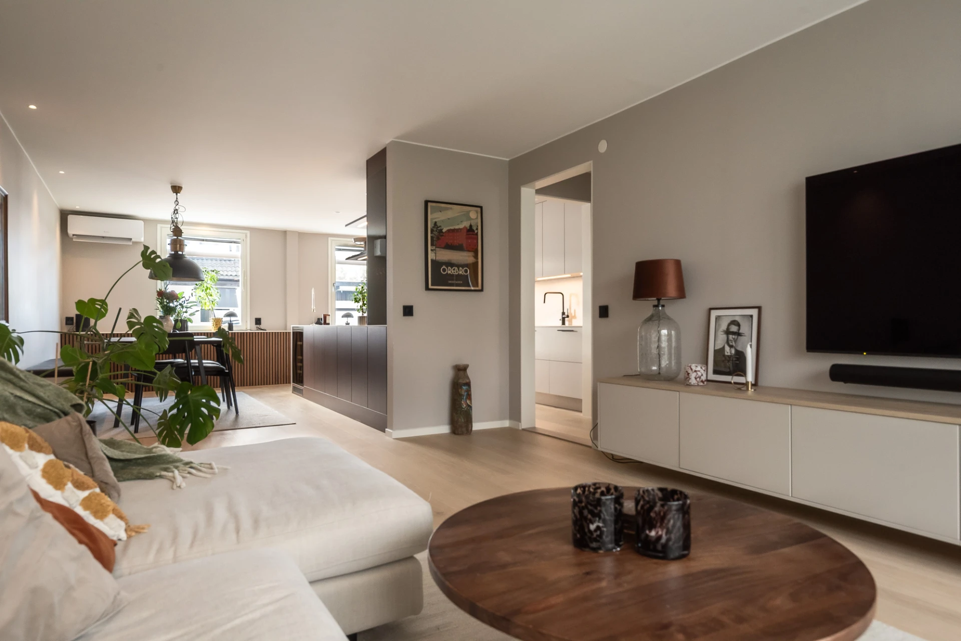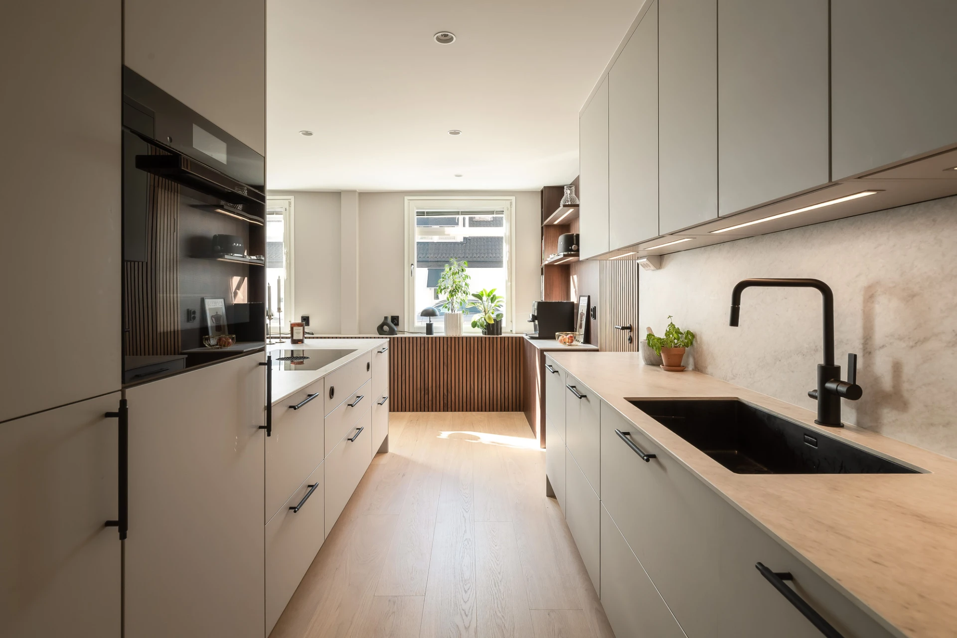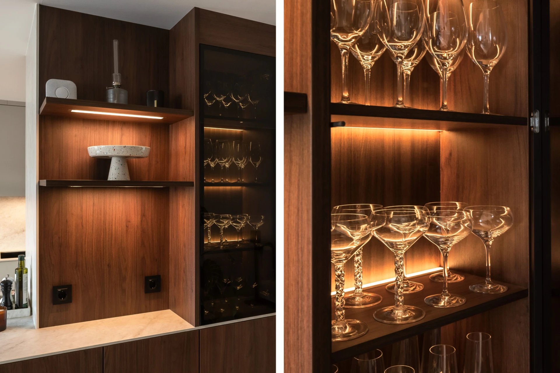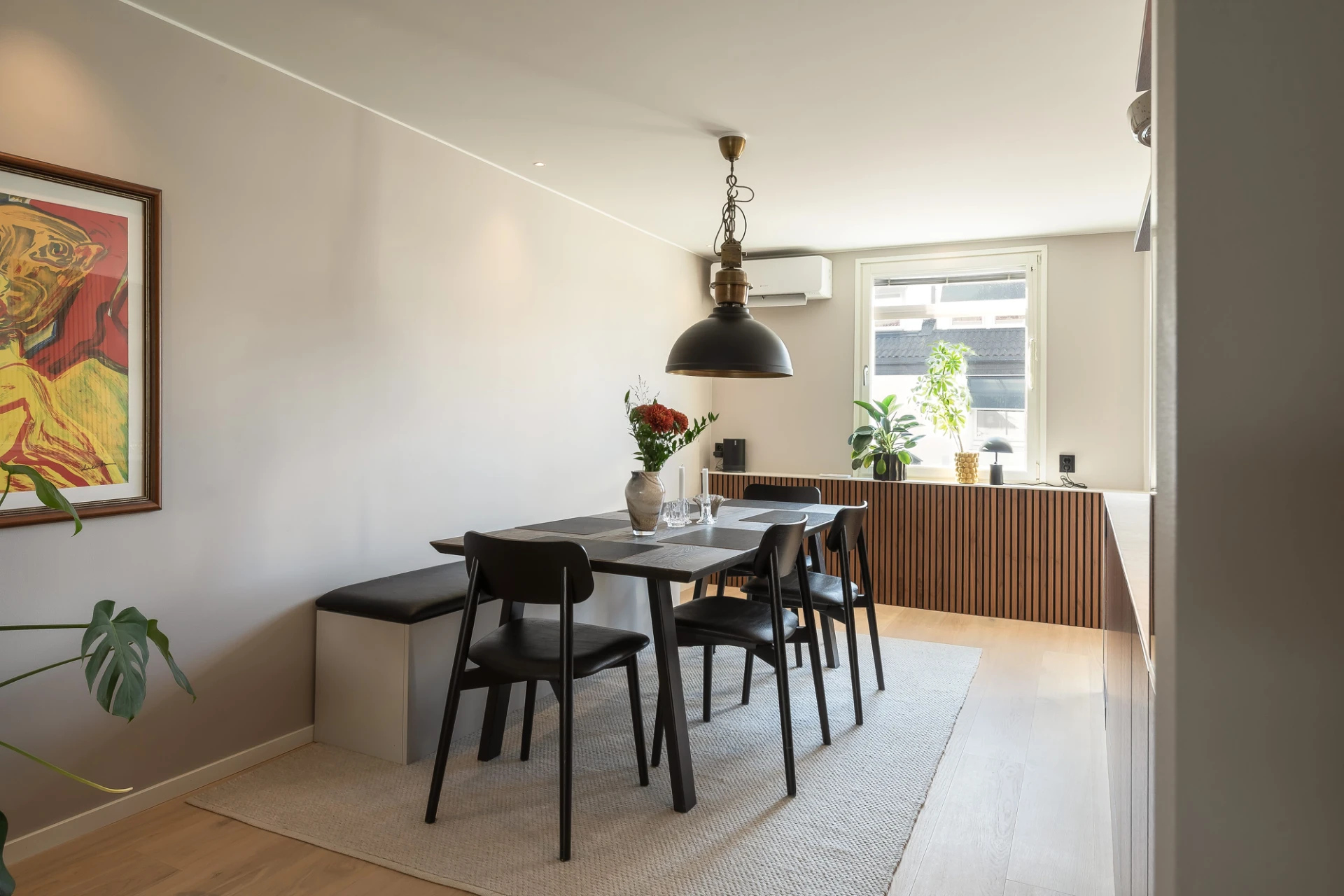 Mycket smakfullt renoverat kök med parkettgolv samt målade väggar. Köksluckor i valnöt/sand med köksbänkar och stänkskydd i granitkeramik (Bricmate). Köket är fullt utrustat med vitvaror från 2023 då köket renoverades. För en extra lyxig känsla finns vinkyl, spotlights infällda i tak och köksskåp och vitrinskåp. Köket har motorer till nedre delen av kökslådorna på ena sidan. Platsbyggda elementskydd och fönsterbräda som följer kökets utseende på ett fint sätt!