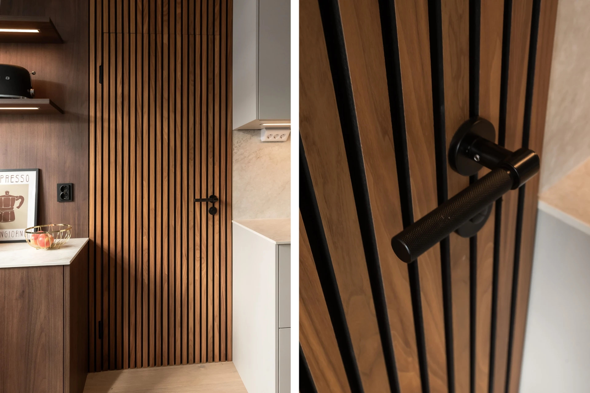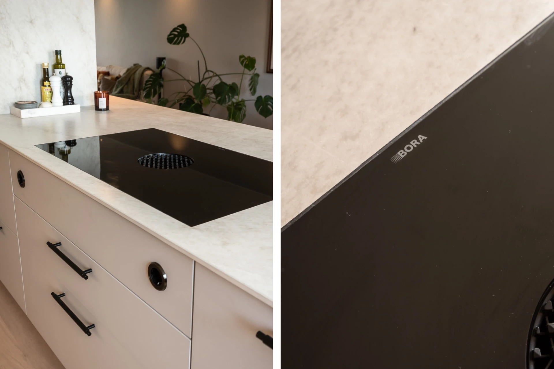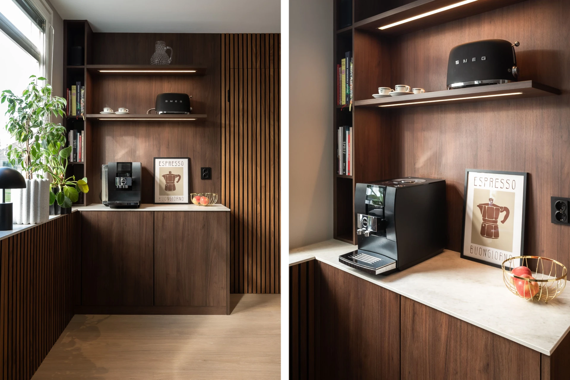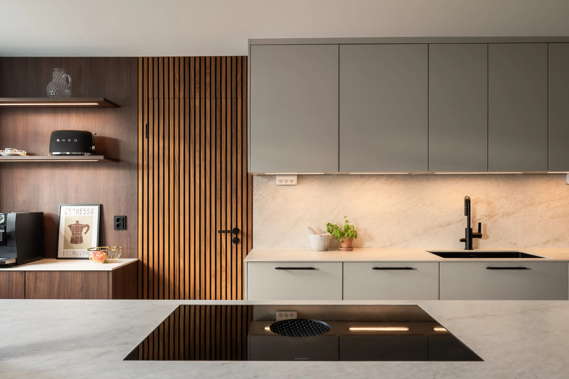 Mycket smakfullt renoverat kök med parkettgolv samt målade väggar. Köksluckor i valnöt/sand med köksbänkar och stänkskydd i granitkeramik (Bricmate). Köket är fullt utrustat med vitvaror från 2023 då köket renoverades. För en extra lyxig känsla finns vinkyl, spotlights infällda i tak och köksskåp och vitrinskåp. Köket har motorer till nedre delen av kökslådorna på ena sidan. Platsbyggda elementskydd och fönsterbräda som följer kökets utseende på ett fint sätt!