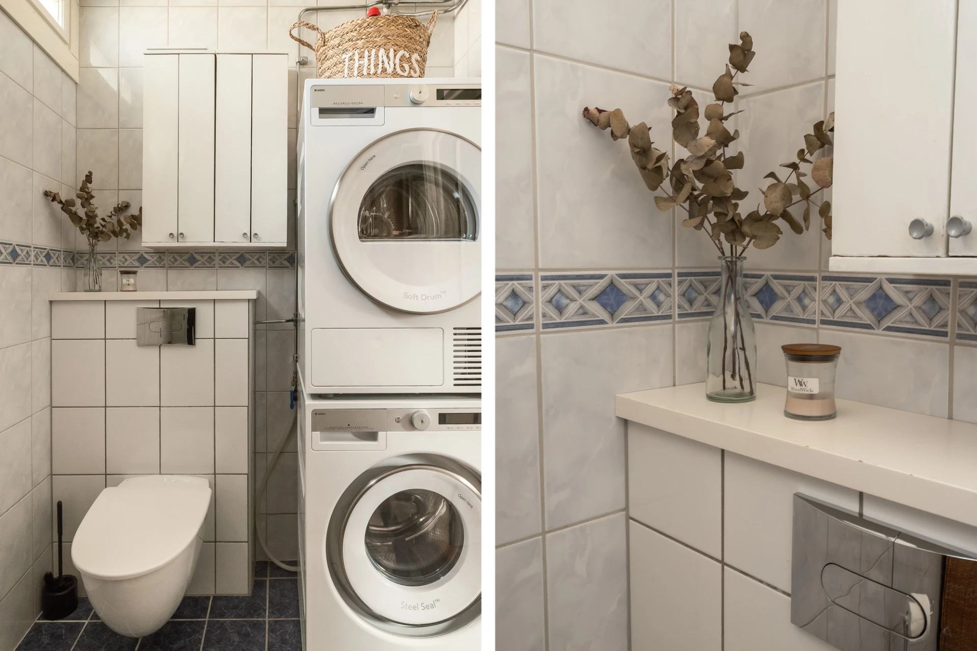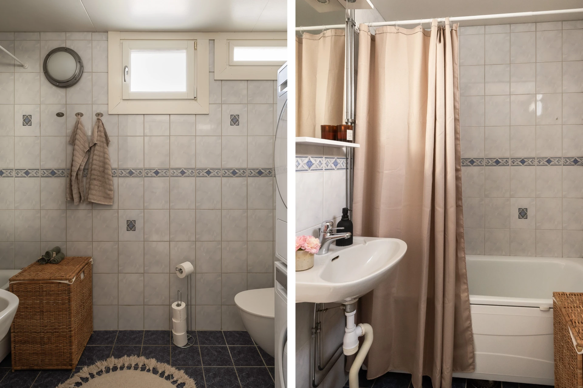 Kaklade väggar och klinkergolv med golvvärme (el). Vägghängd WC, handfat, spegel, handdukstork samt badkar. Tvättmaskin och torktumlare (2021).