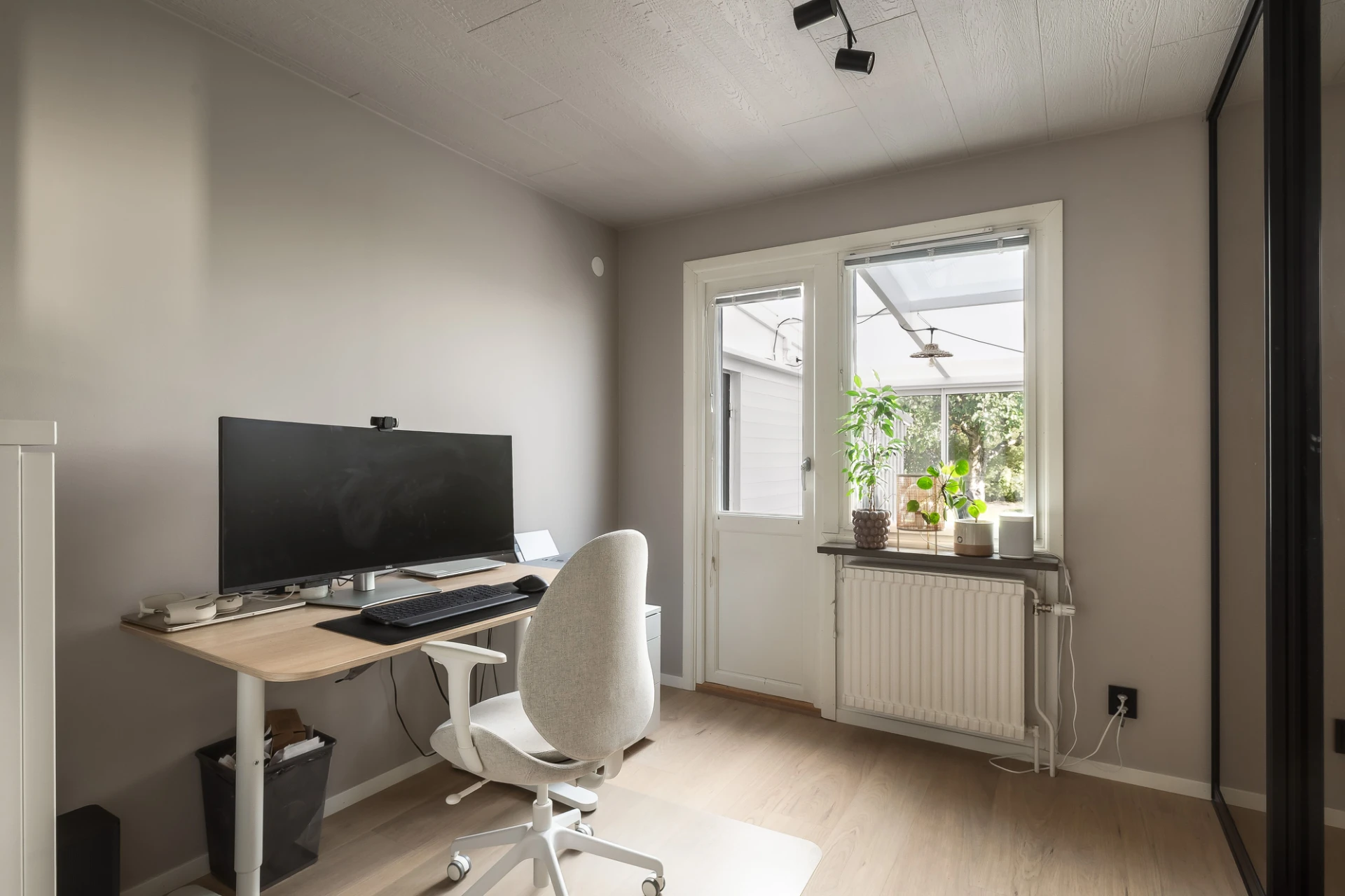 Målade väggar samt parkettgolv. Idag används rummet som kontor men här finns plats för dubbelsäng. Platsbyggda garderober med skjutdörr. Utgång till inglasad uteplats.