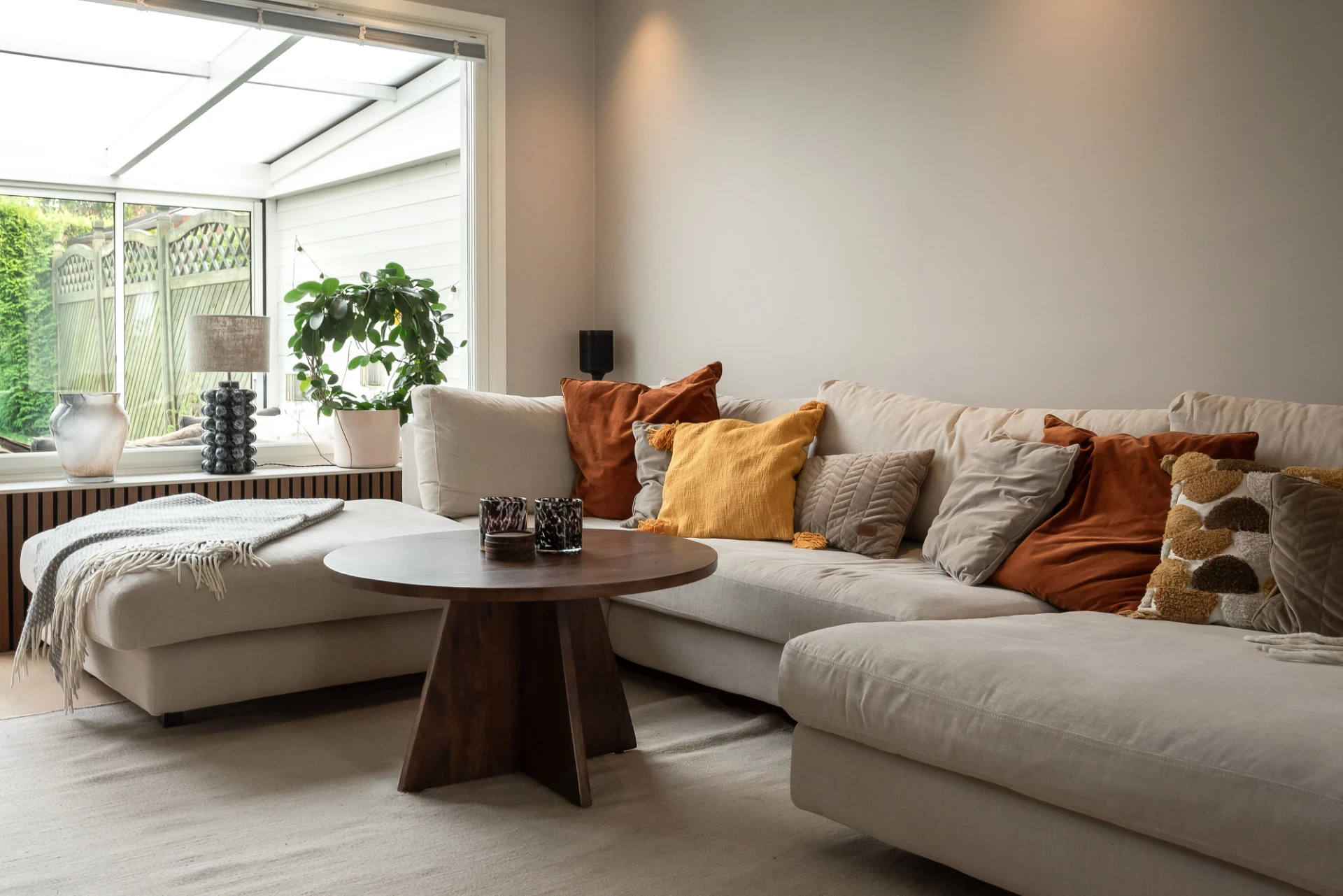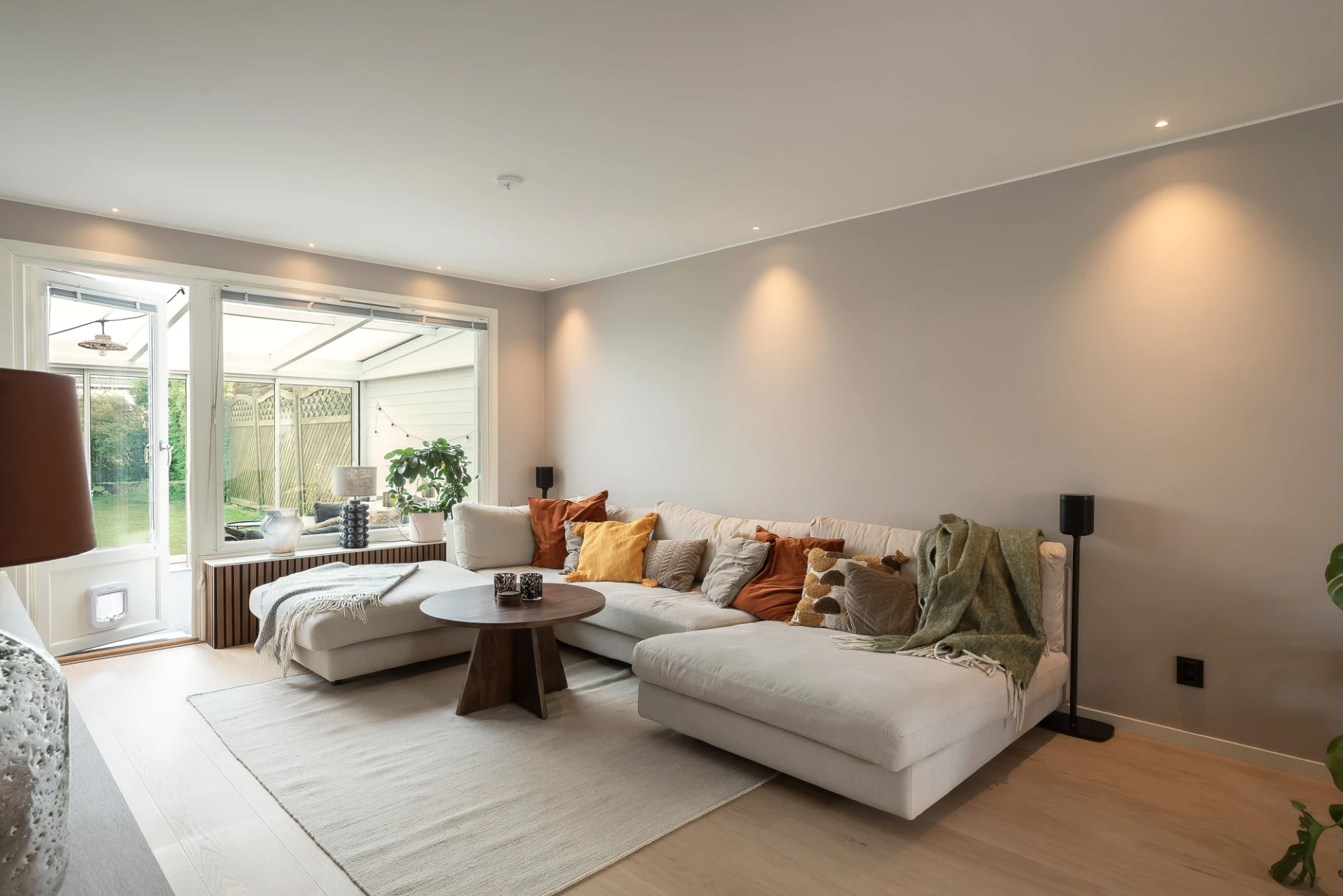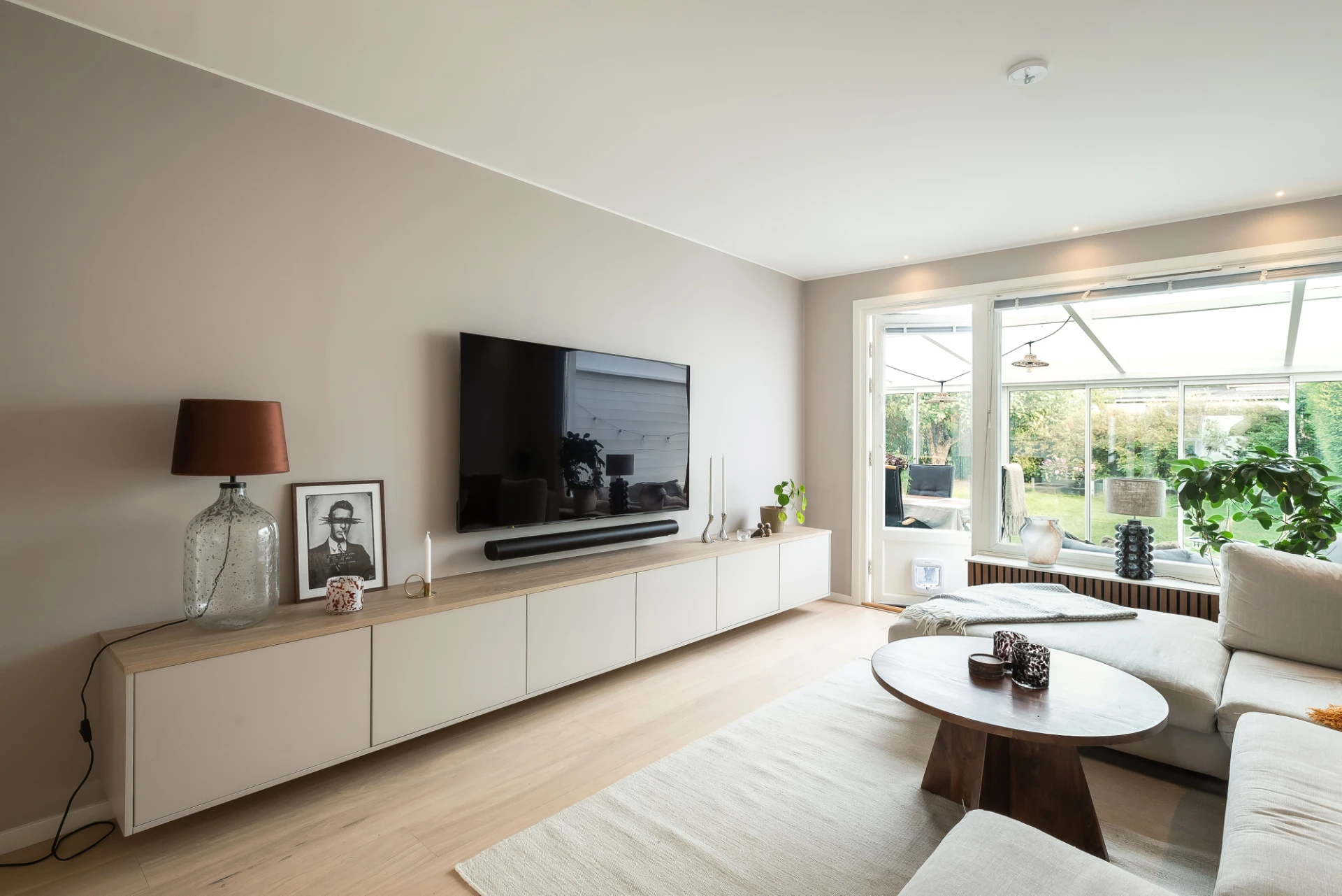 Målade väggar och parkettgolv. Utgång till inglasat uterum. Här finns också platsbyggda elementskydd, tv-möbel och fönsterbräda.