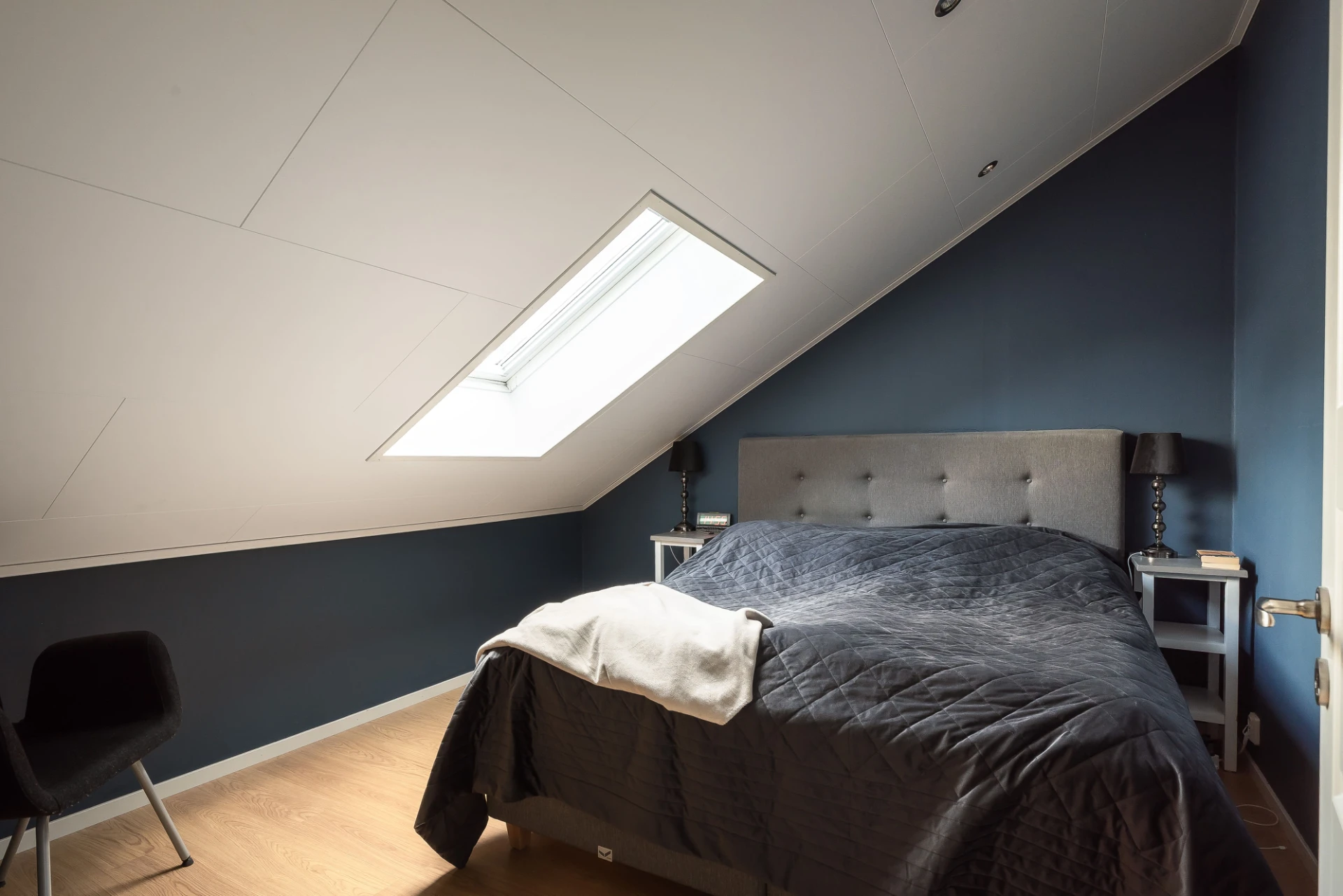 Målade väggar i en blå kulör och parkettgolv. Perfekt som barnrum. Takfönster, spotlights samt golvvärme.