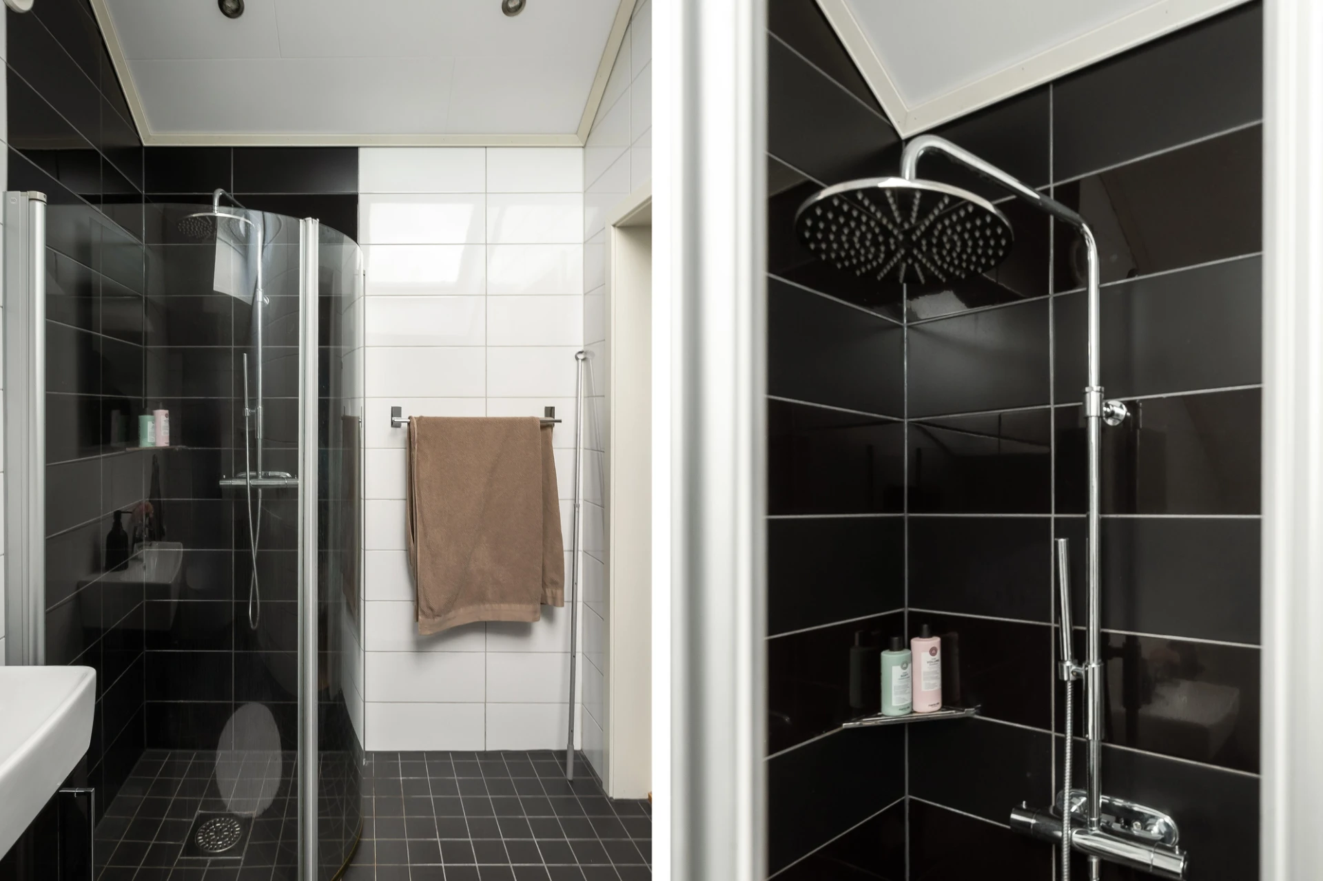 Kaklade väggar i vitt och klinkergolv i mörkgrått med golvvärme (vattenburen). Vägghängd WC, handfat med kommod, spegel, handdukstork. Dusch med vikdörrar i glas.