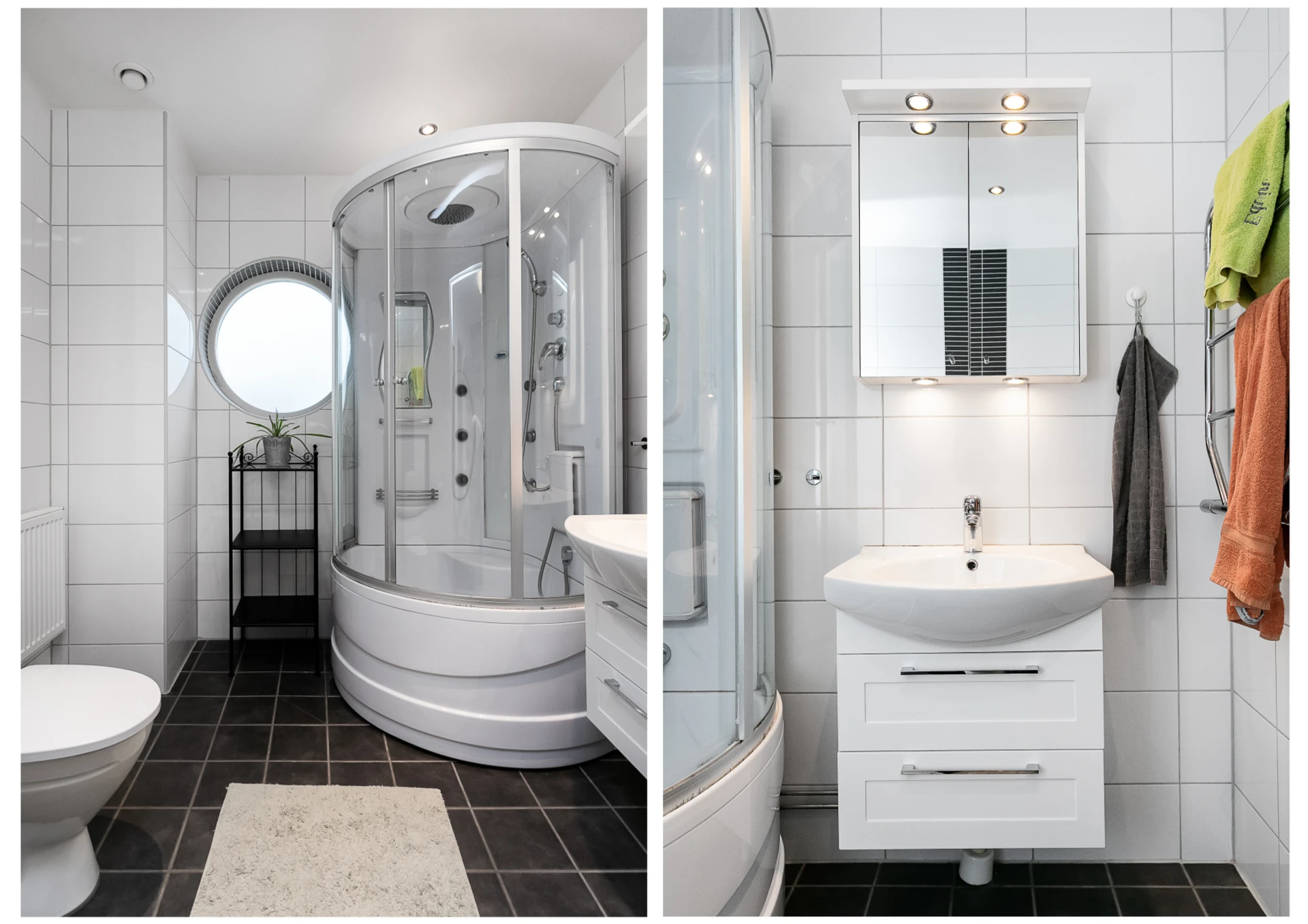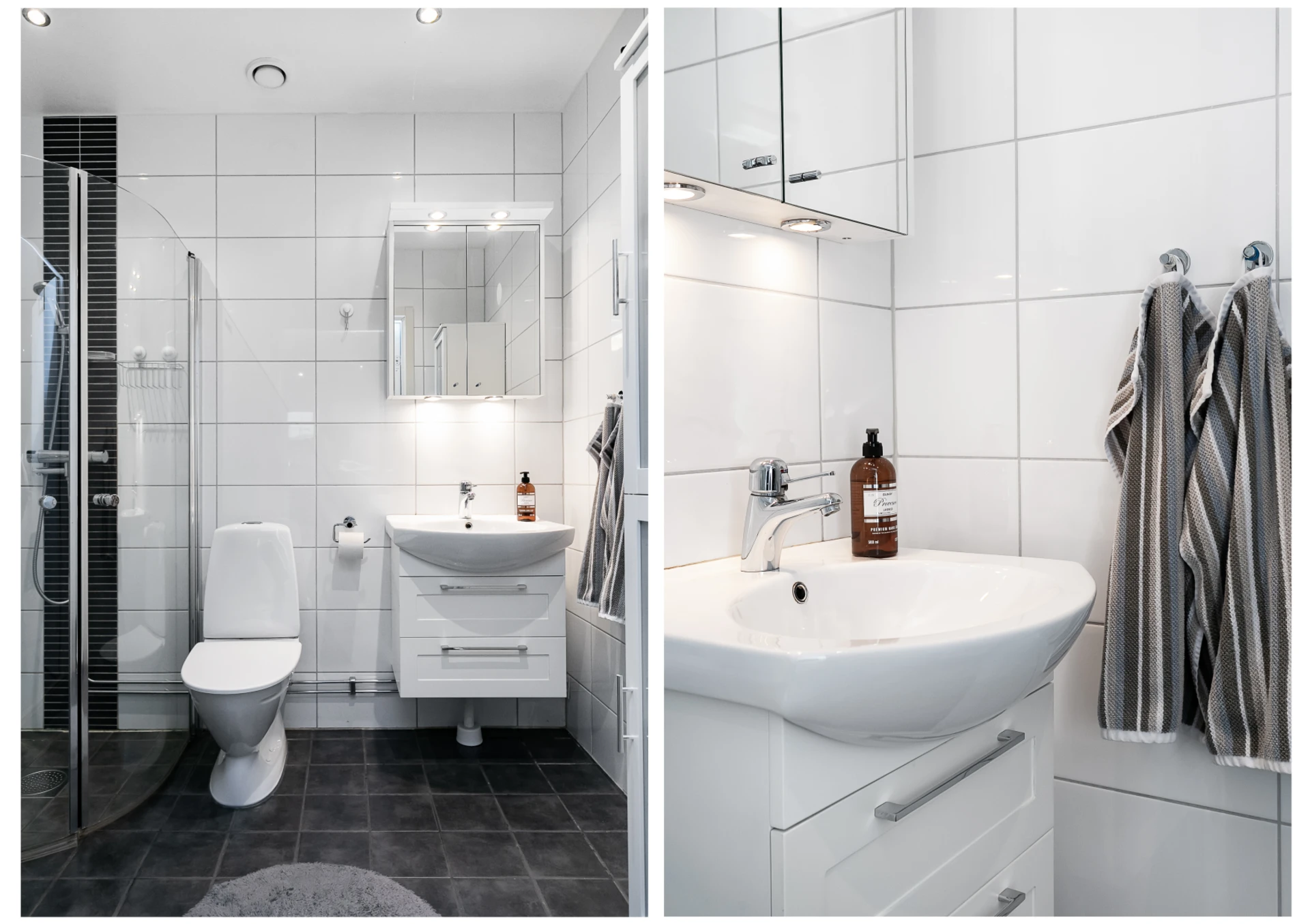 Handfat med kommod, spegelskåp, wc, handukstork samt dusch. Kaklade väggar och klinkergolv.