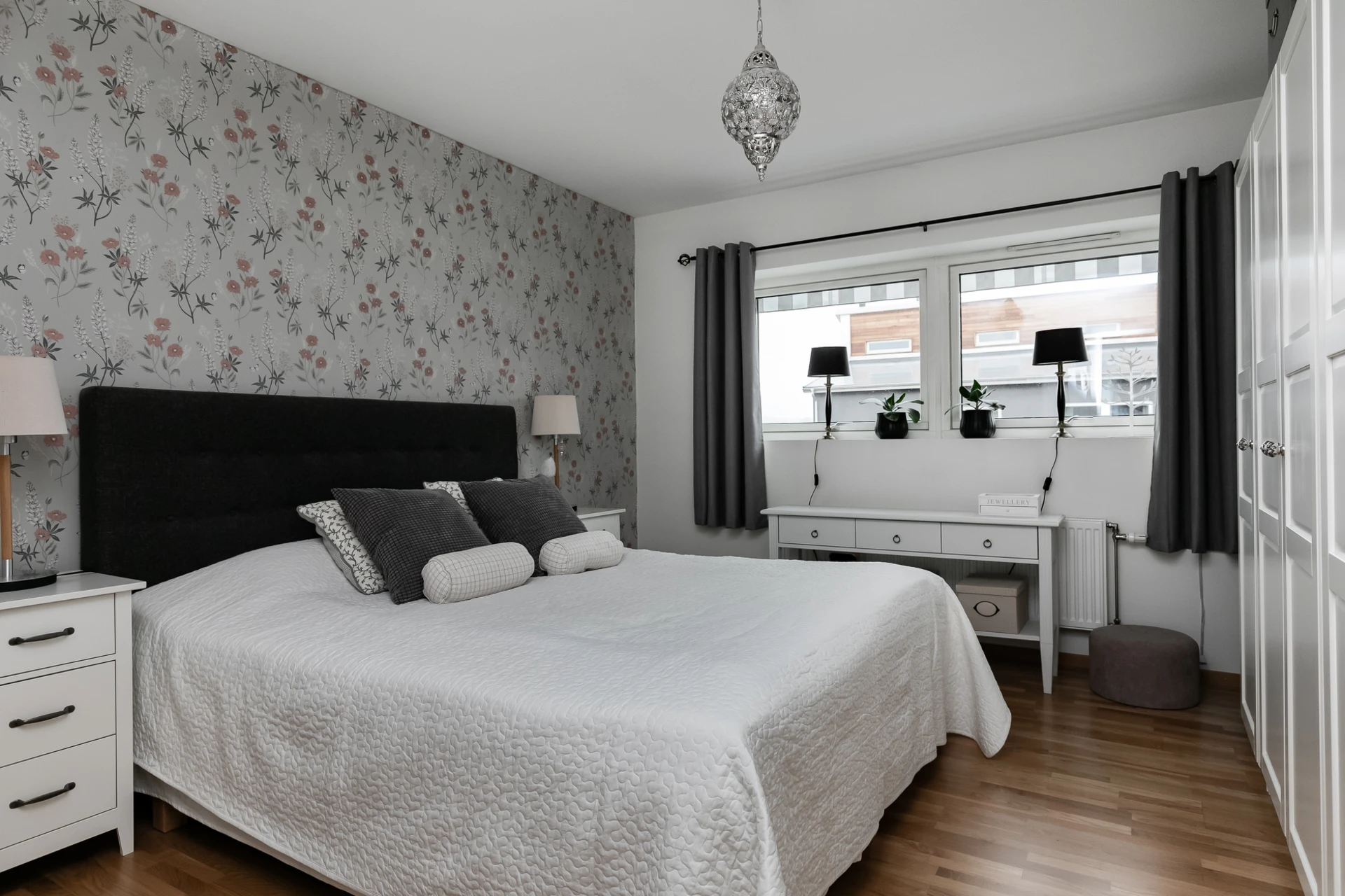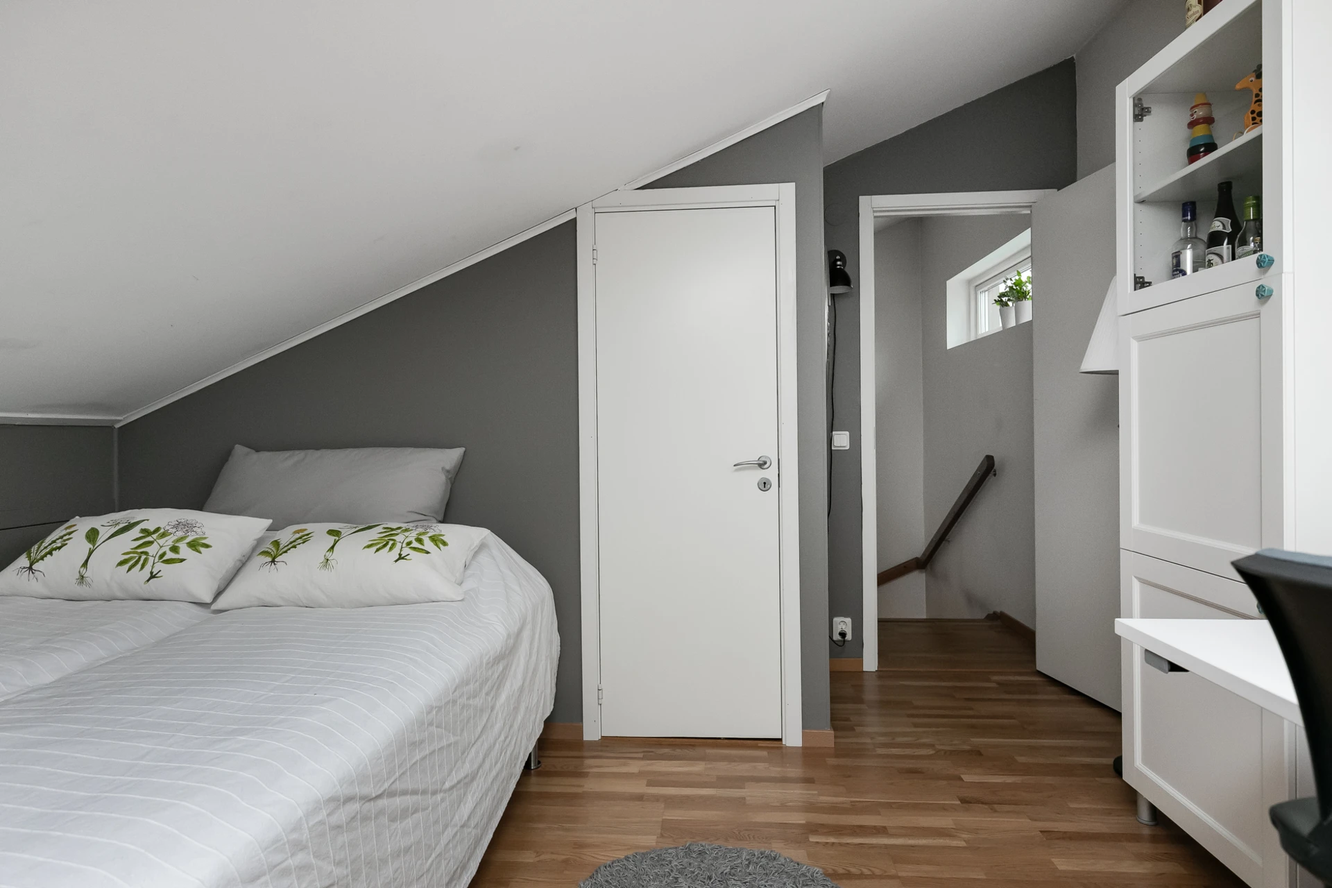 Master bedroom högst upp i huset, här finns plats för både dubbelsäng och arbetshörna. Målade väggar och parkettgolv.