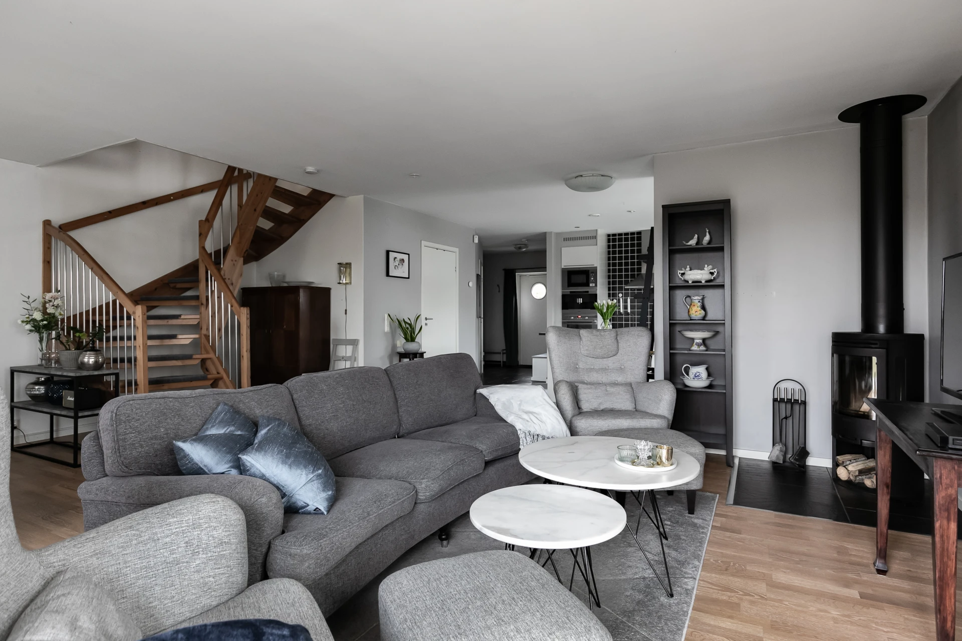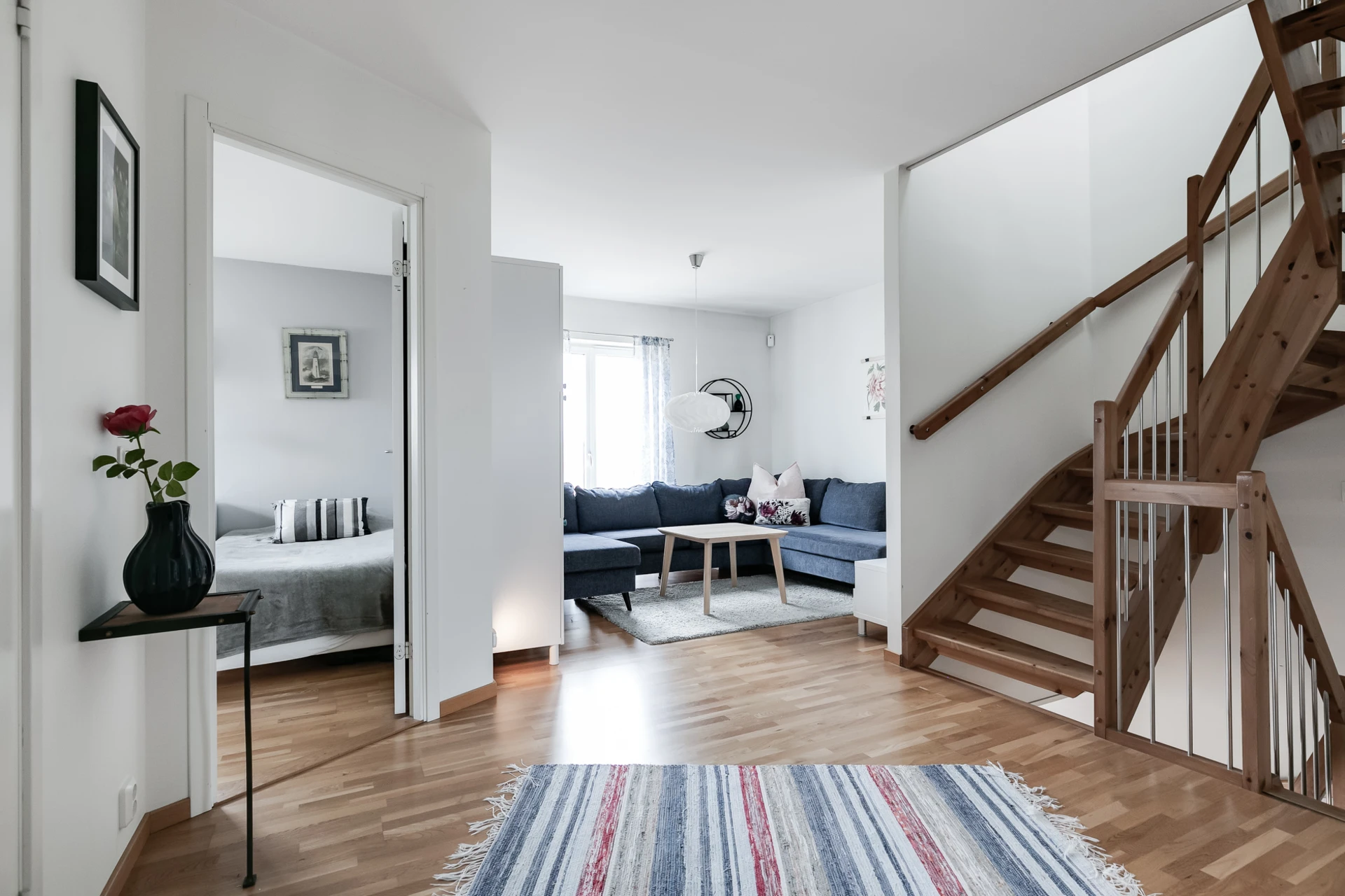 Allrum med plats för soffgrupp och Tv-möbel. Målade väggar och parkettgolv.