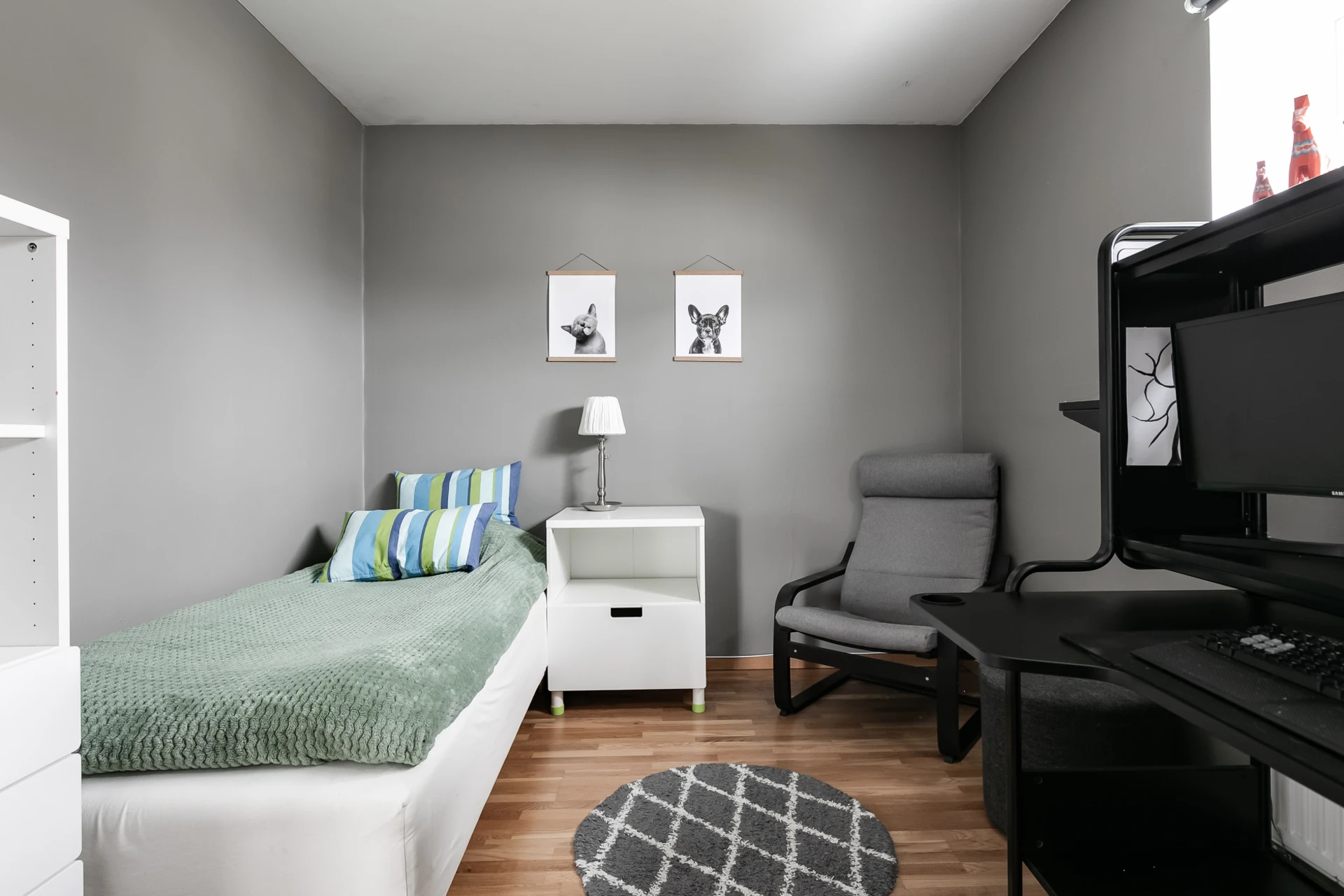 Ett funktionellt sovrum med utrymme för en enkelsäng och skrivbord. Målade väggar och parkettgolv.