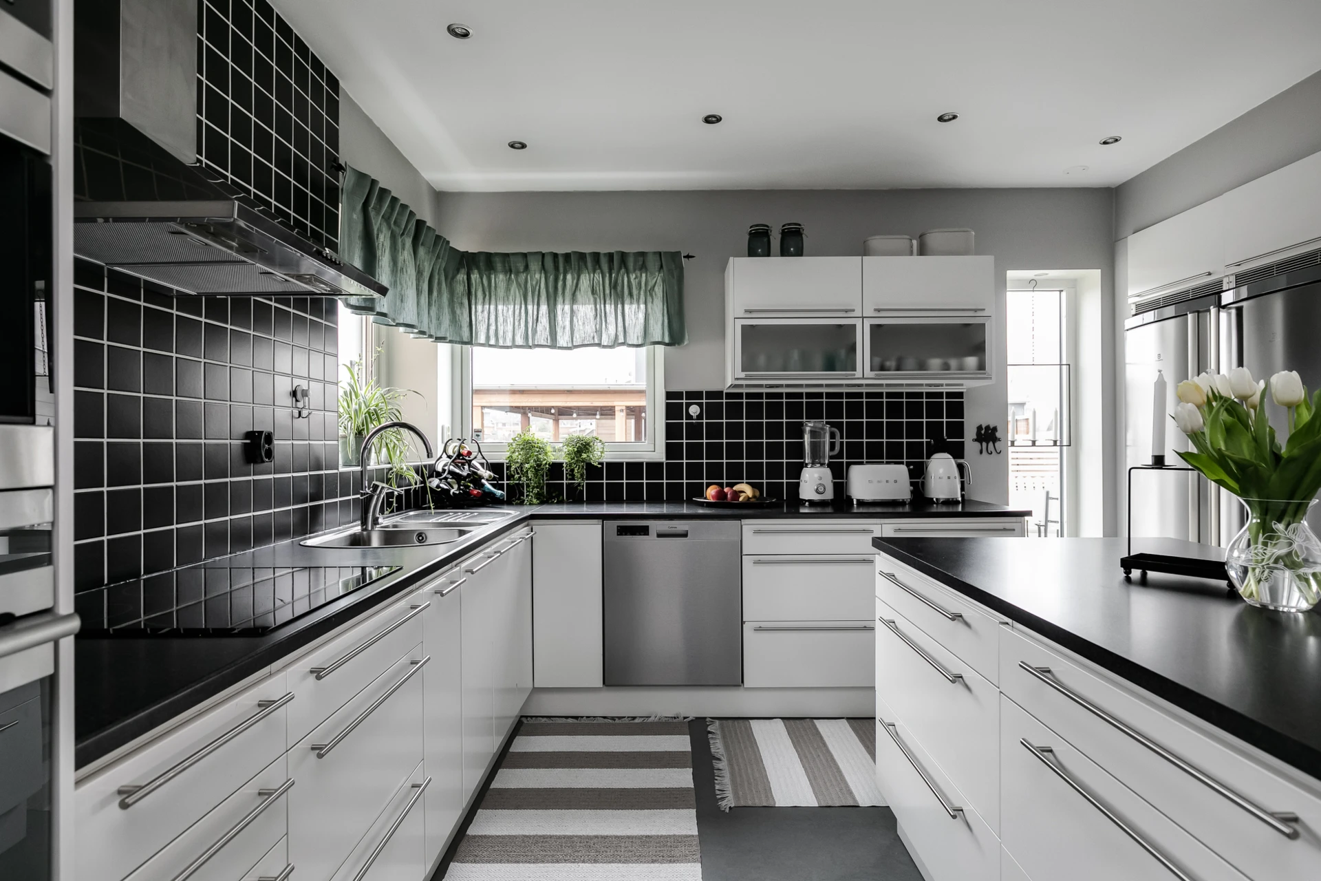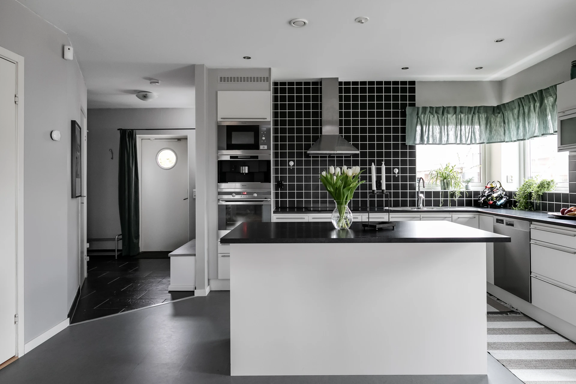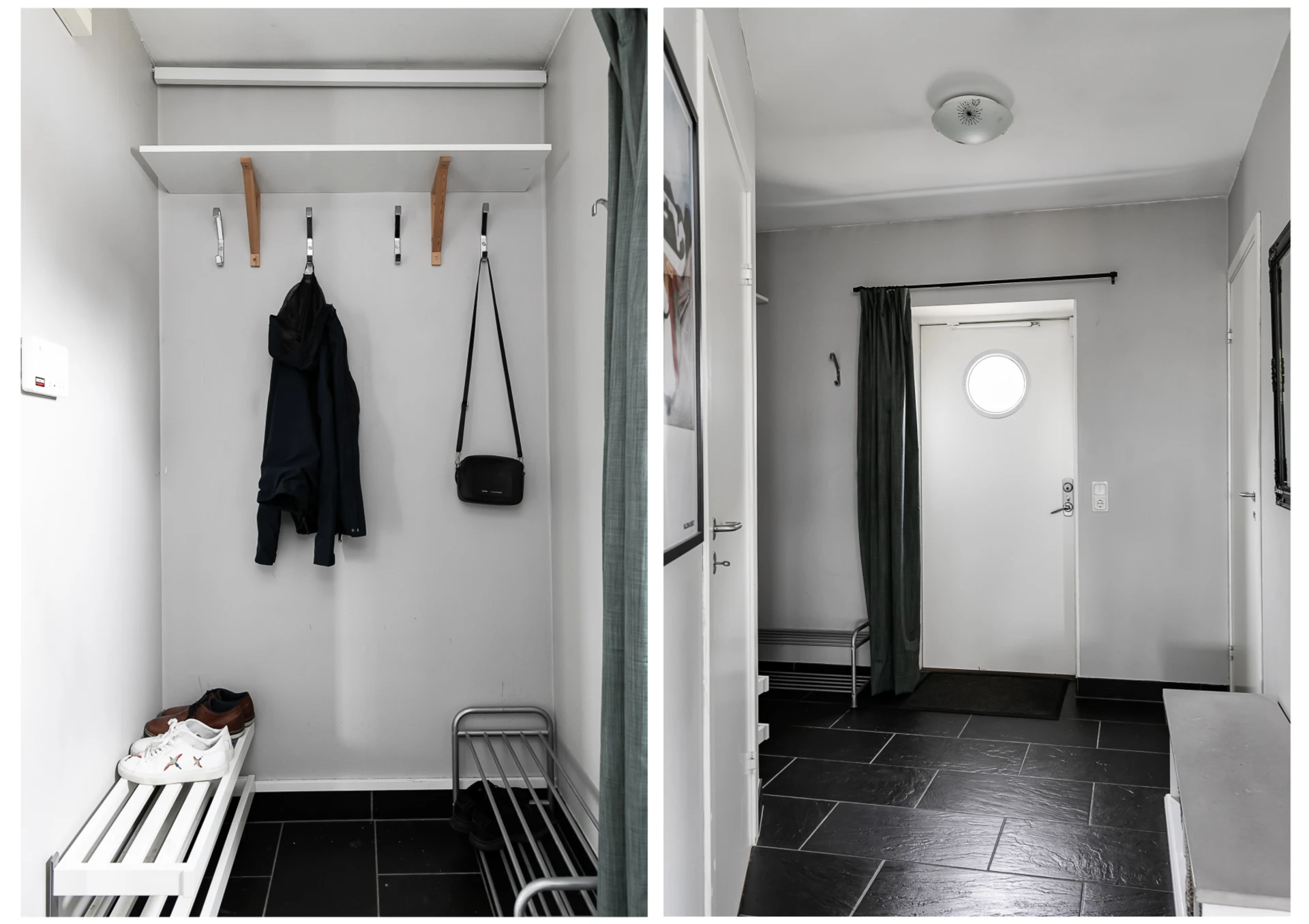 Målade väggar och klinkergolv.