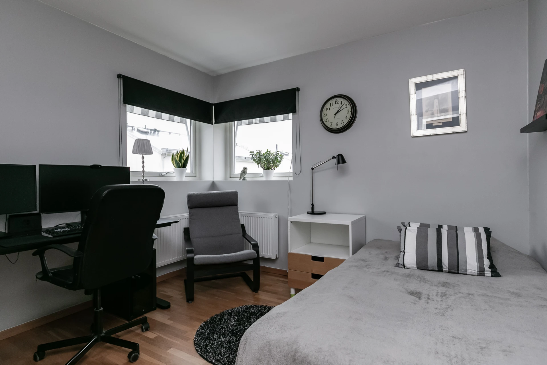 Ett mångsidigt sovrum med utrymme för en enkelsäng och en praktisk arbetshörna. Perfekt som barnrum eller hemmakontor. Målade väggar och parkettgolv.