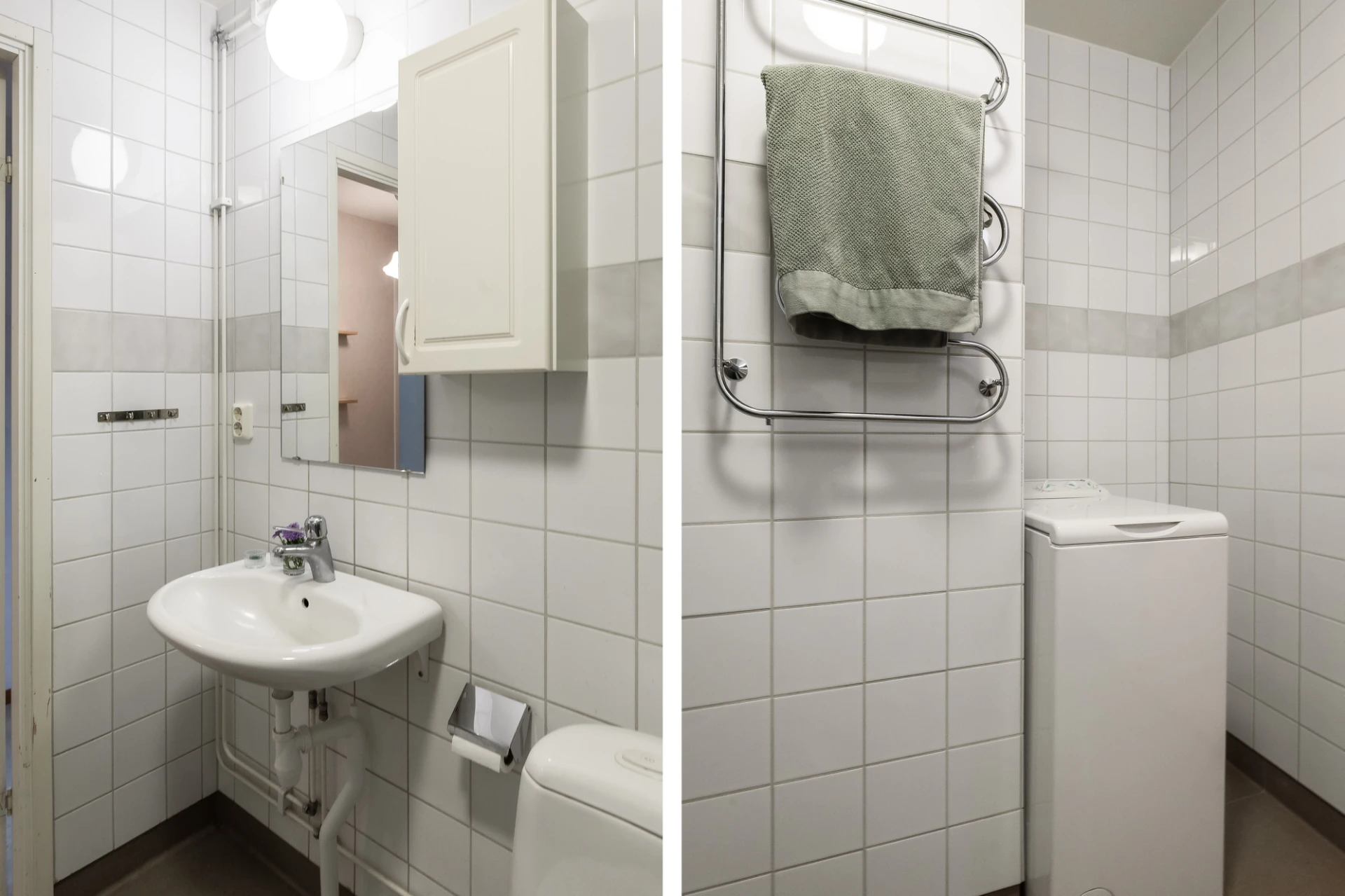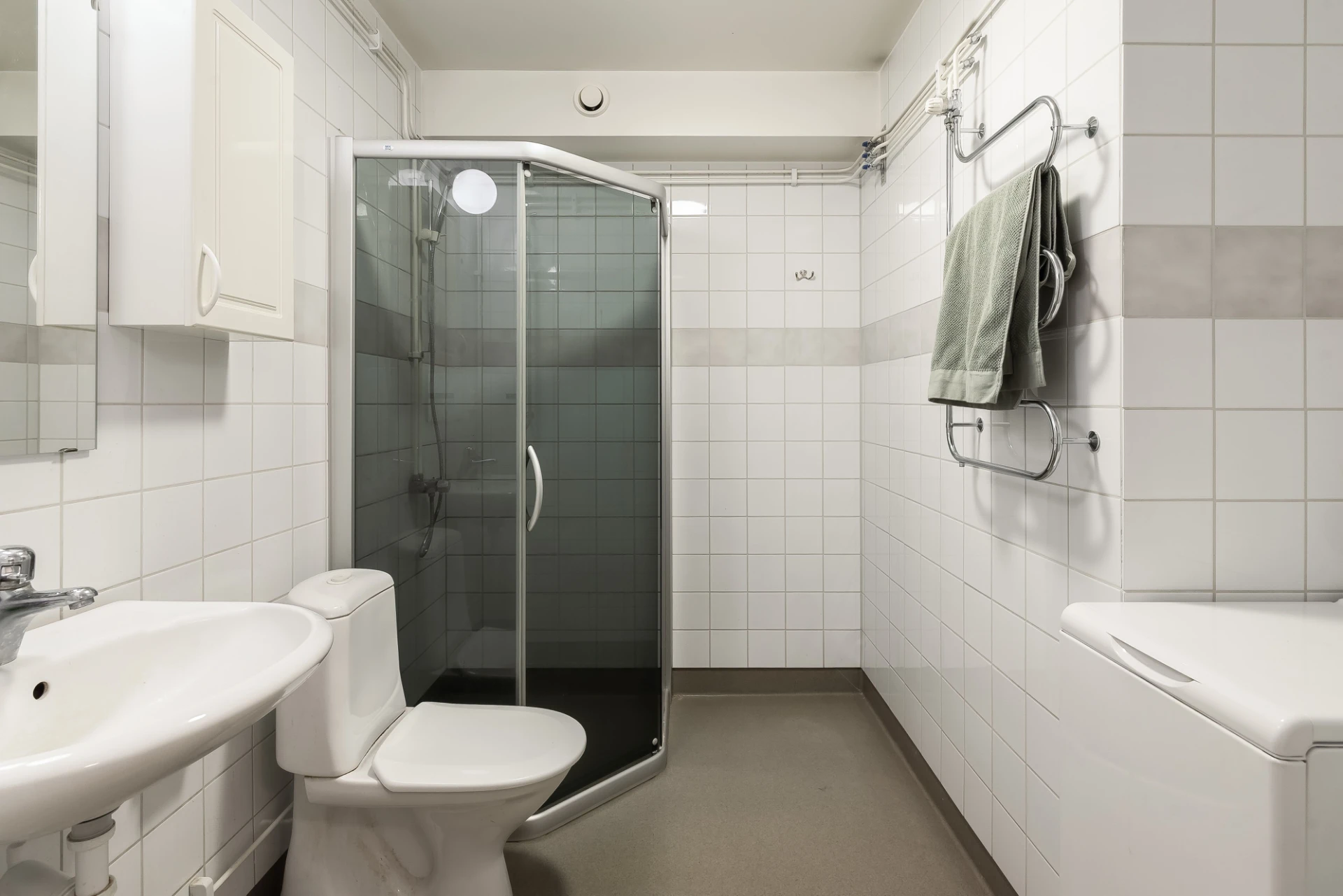 Badrummet har kaklade väggar i moderna kulörer vitt och grått, samt en våtrumsmatta i matchande färg. Dusch, wc, handdukstork, handfat och toppmatad tvättmaskin.