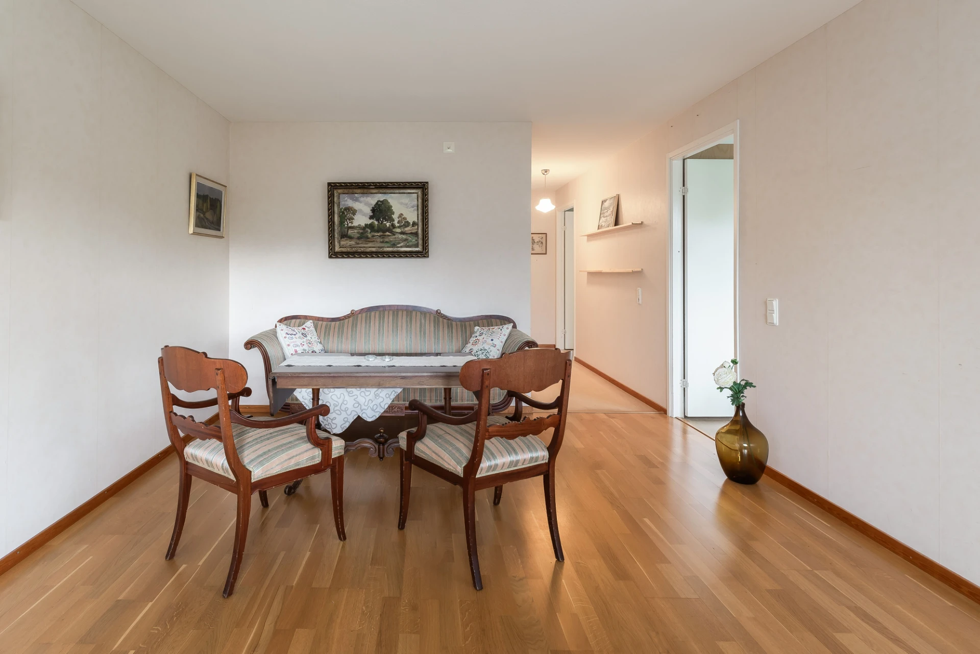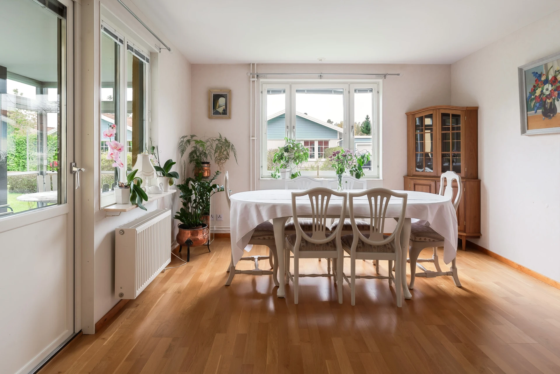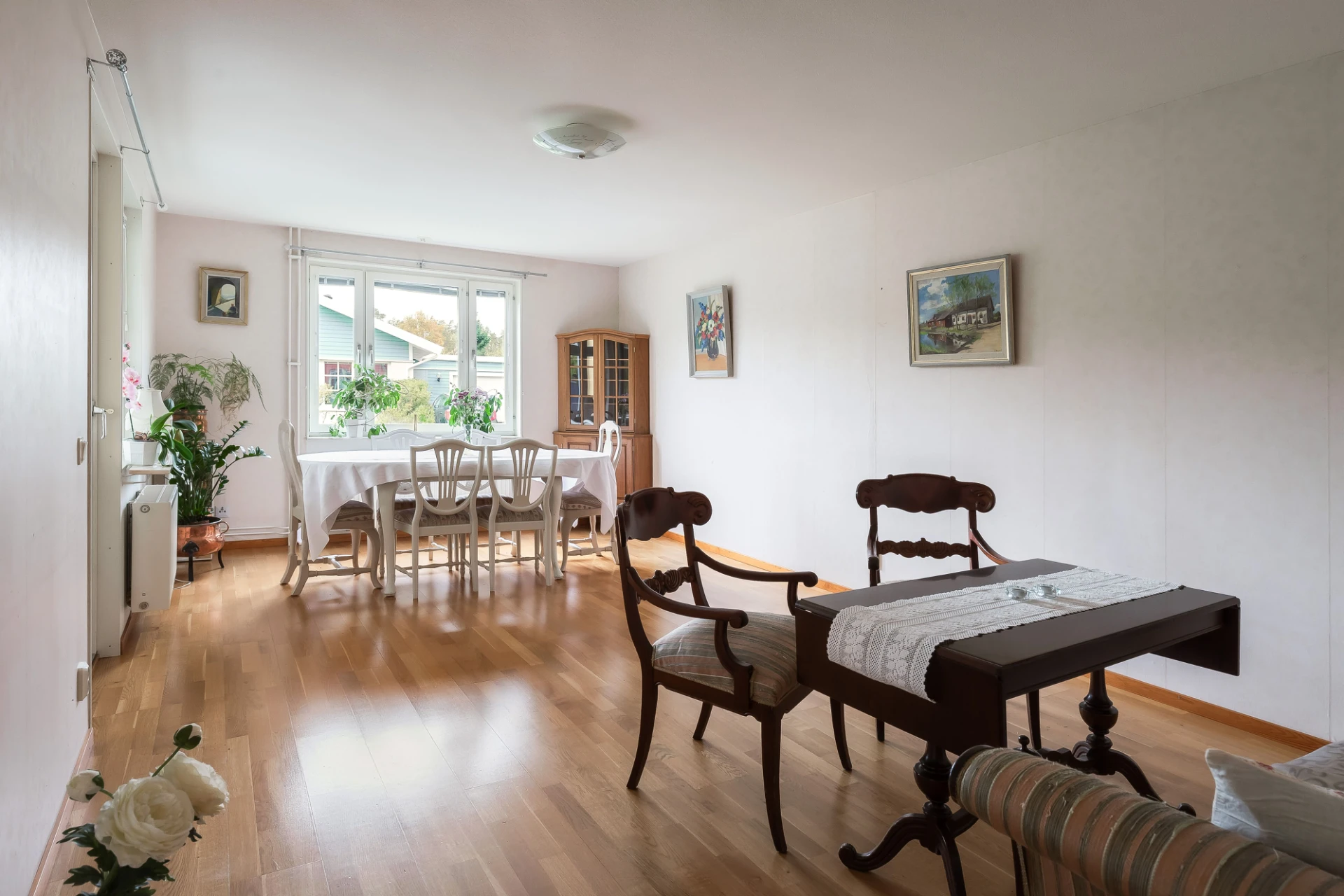 Vardagsrummet är bostadens hjärta och plats finns för både matsalsbord och soffgrupp. Här ryms många personer och rummet är optimalt för mysiga tillställningar och bjudningar.