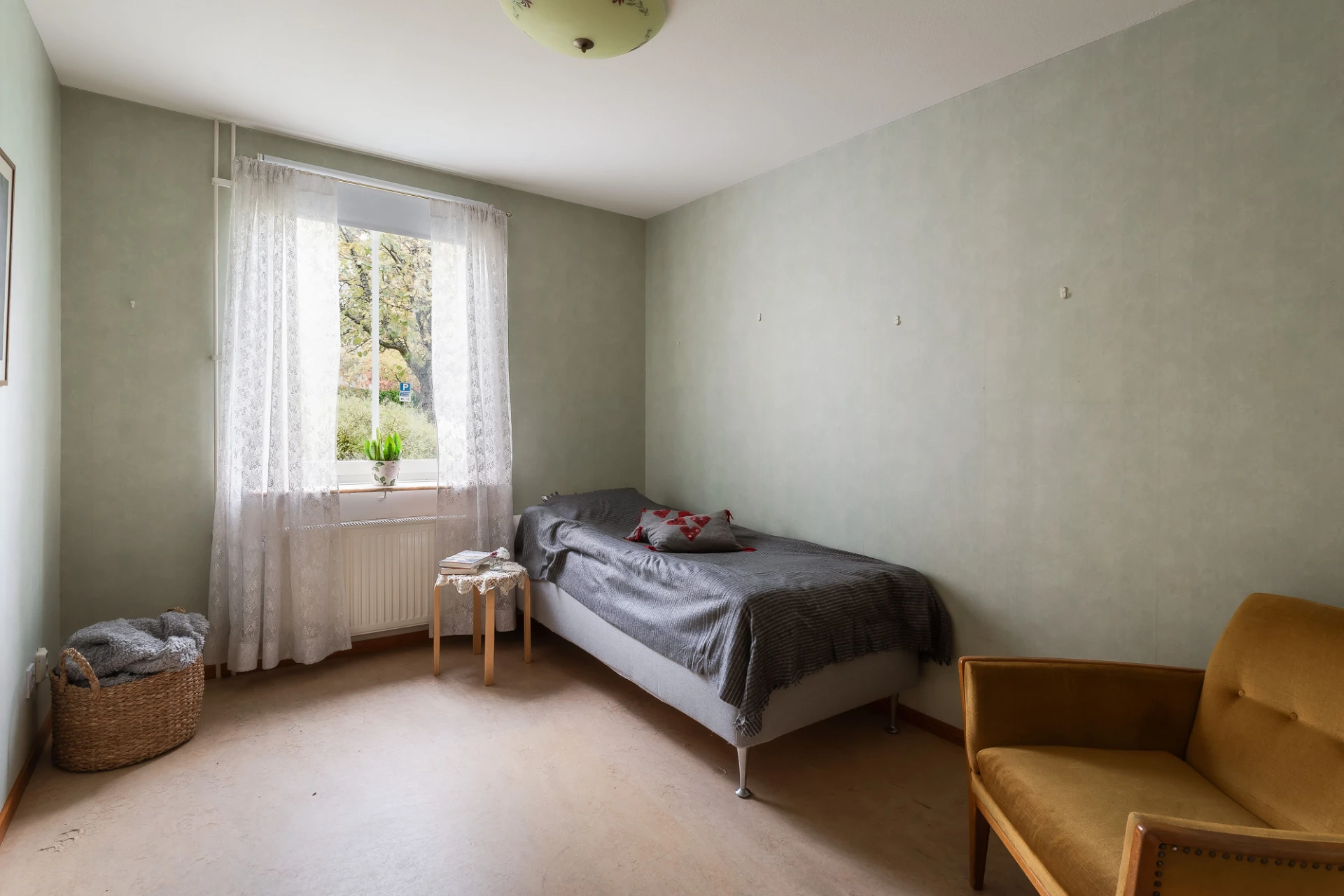 Sovrum med plastmatta och tapetserade väggar. Här ryms en dubbelsäng. Garderoben som är märkt i planritningen står idag i förrådet.
