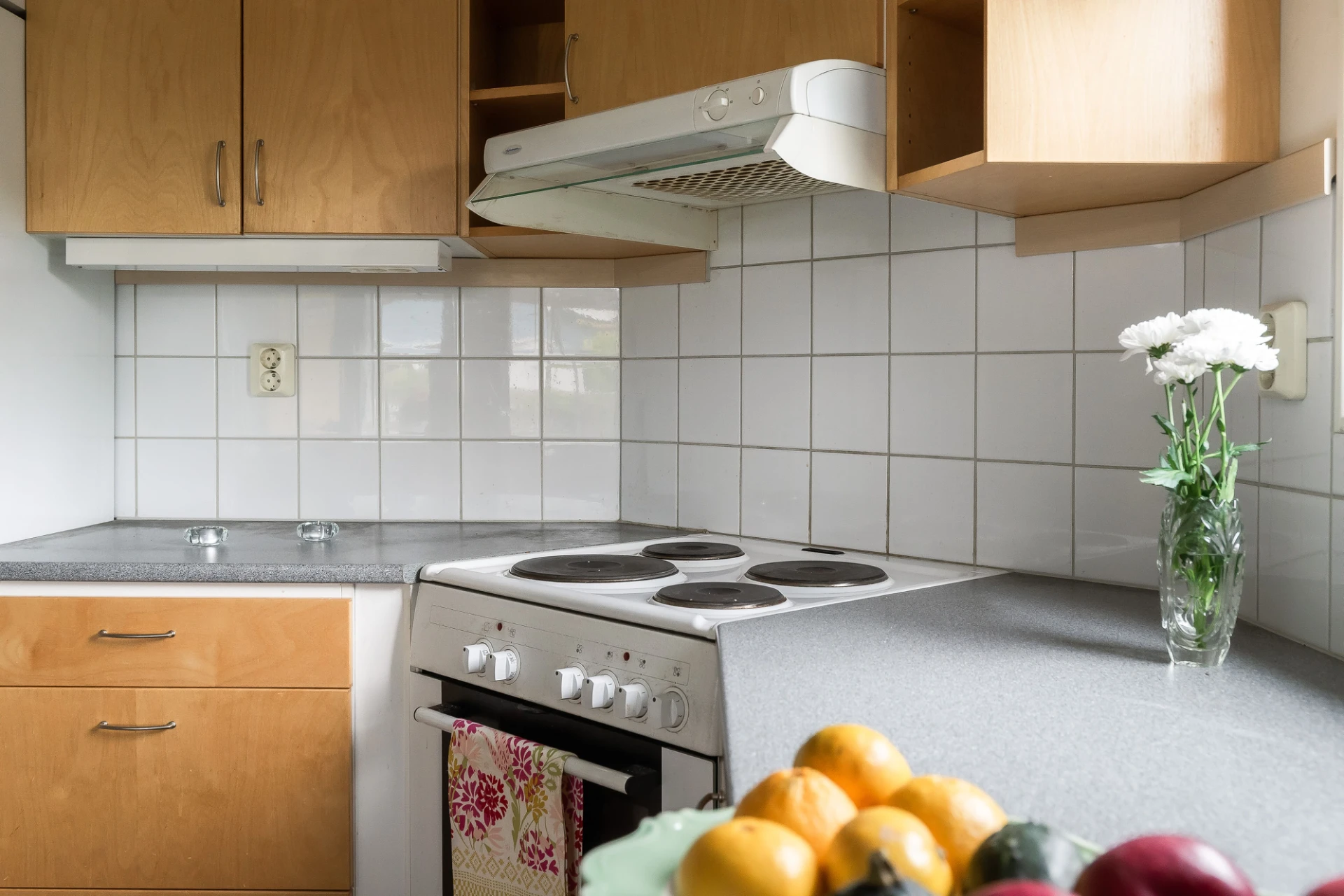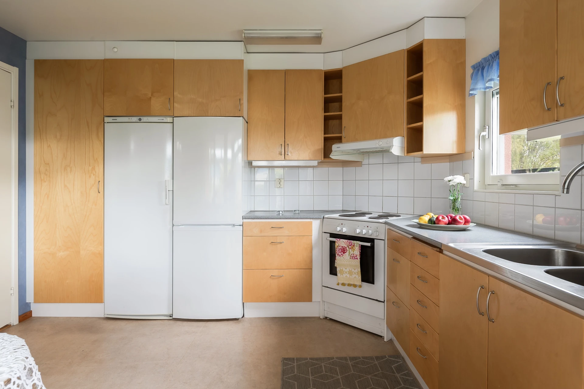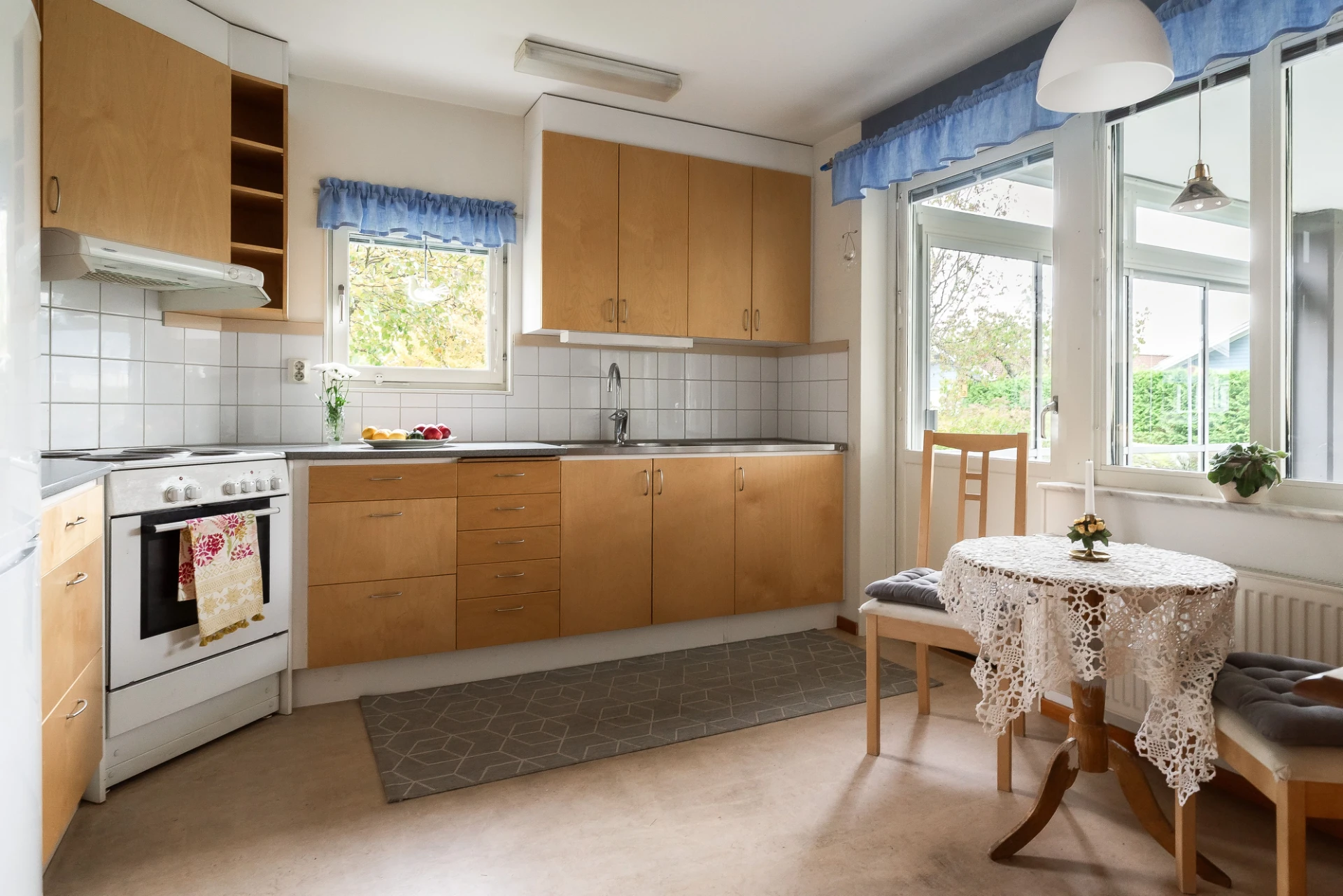 Trivsamt kök med plastmatta och tapetserade väggar. Här finns utgång till uterummet och plats för ett normalstort matbord. Köket är utrustat med kyl, frys, spis. Fönster i olika väderstreck skapar ett trevligt ljus.