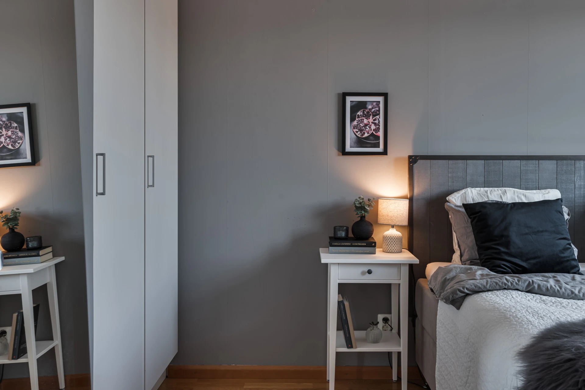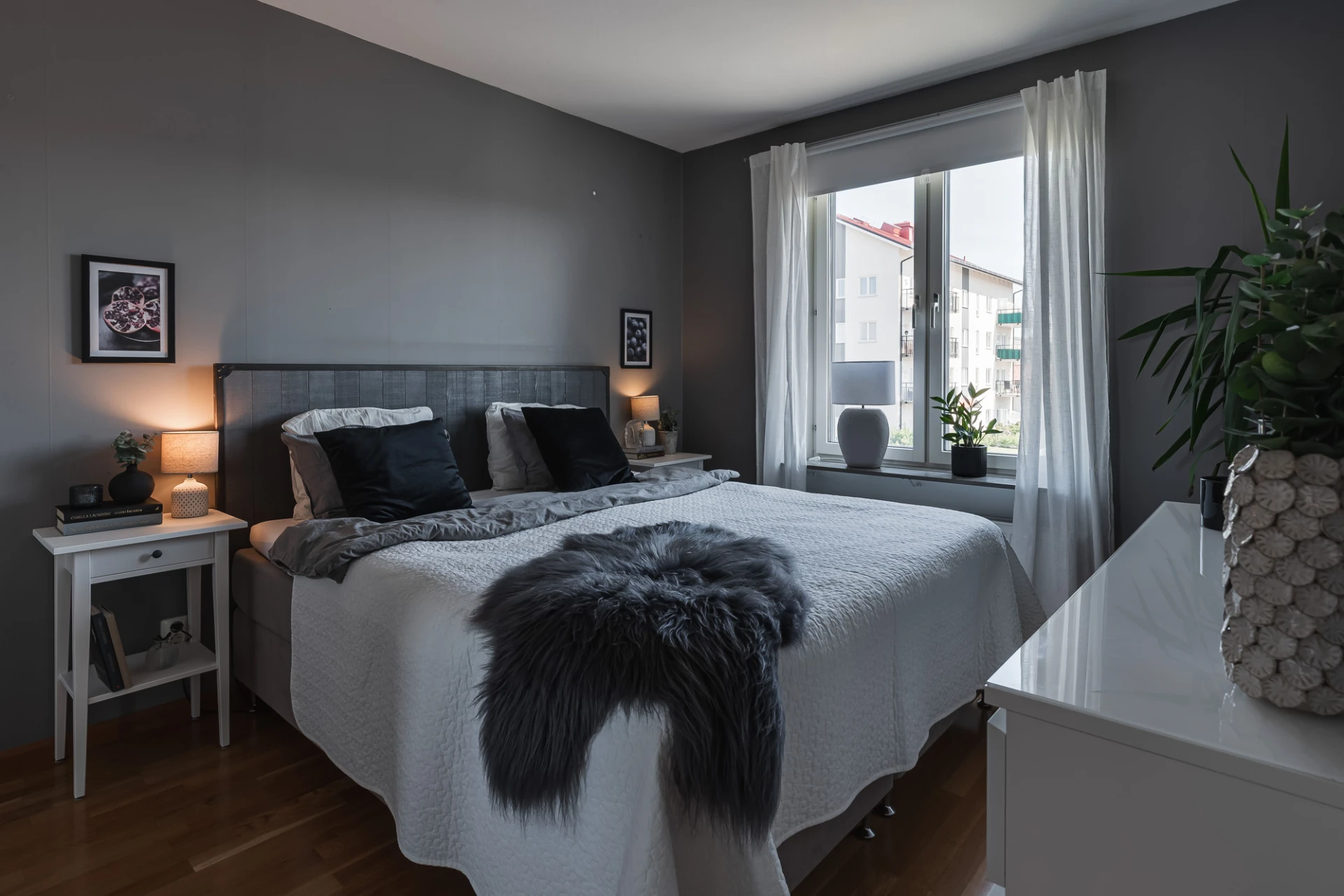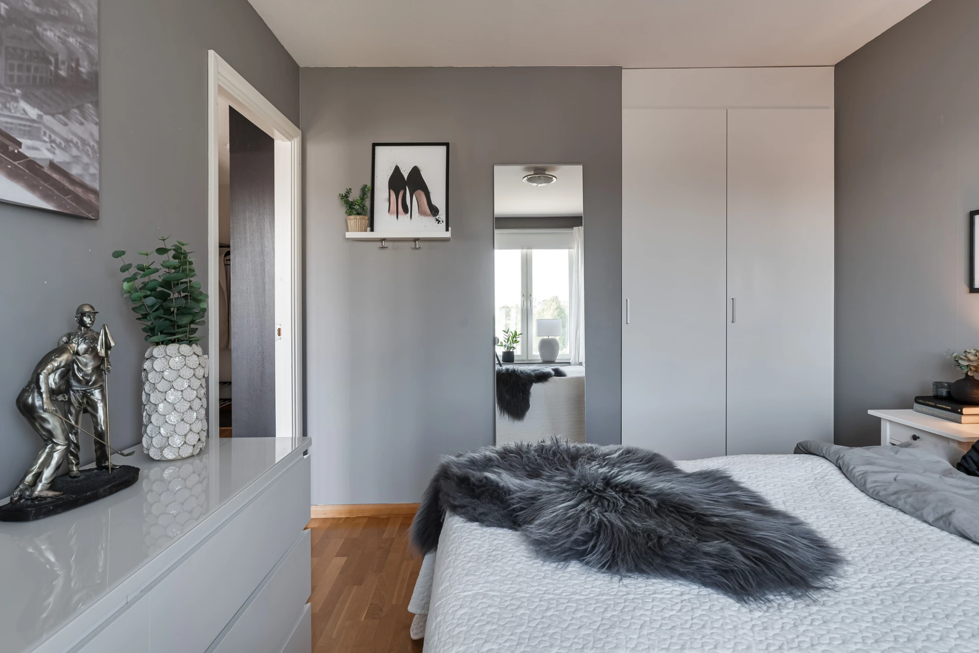 Rofyllt sovrum med väggar målade i grått och parkettgolv. Här finns plats för dubbelsäng. Garderober som ger gott om förvaringsutrymme.
