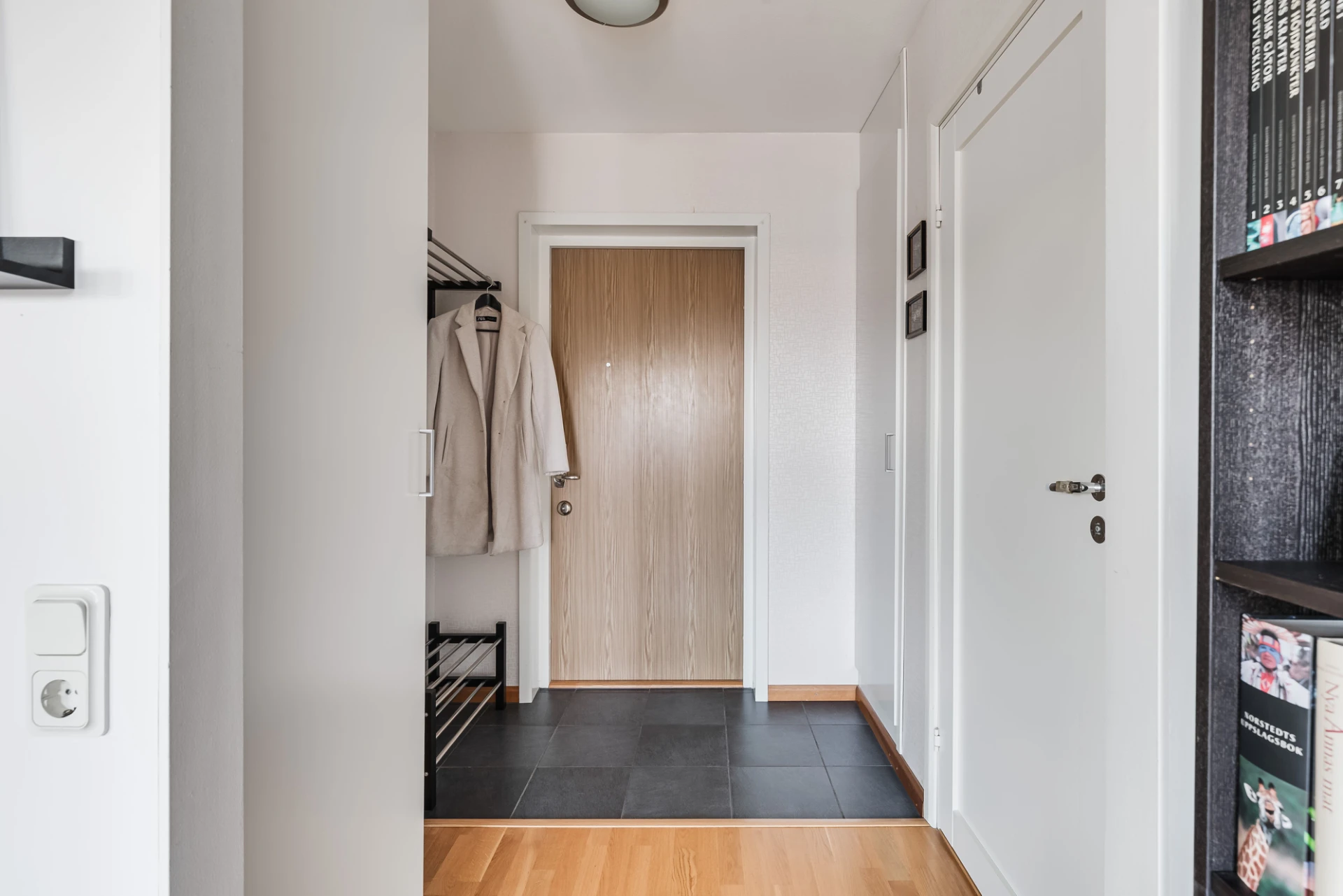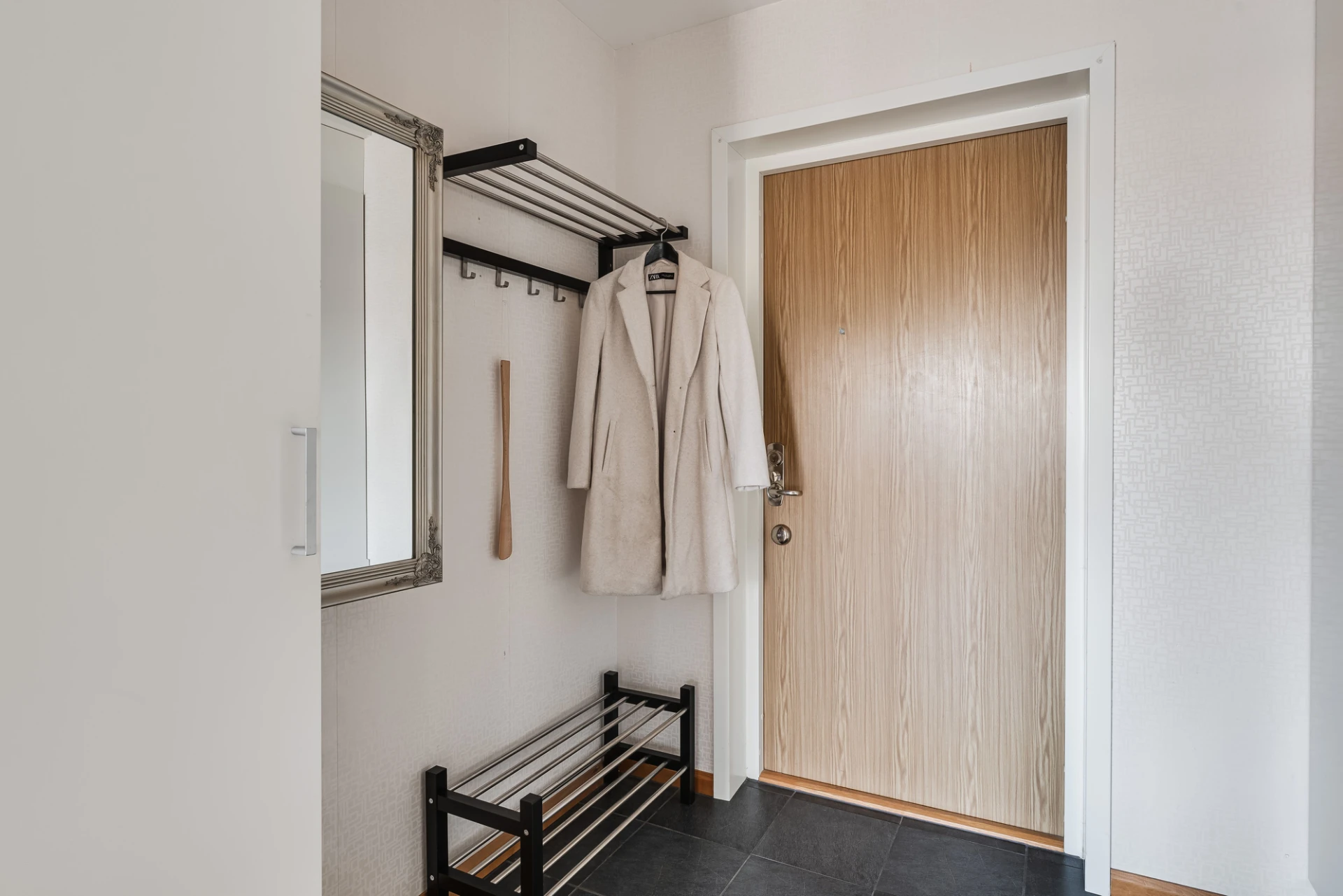 Välkomnande hall med praktiskt klinker på golv och ljus tapet på vägg. Här finns plats för avhängning samt gott om förvaring i garderober.