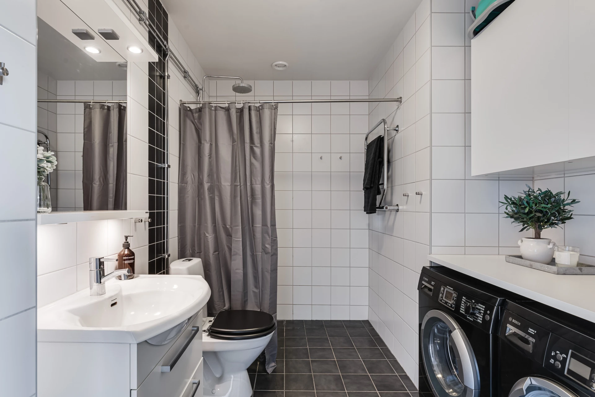 Rymligt badrum med vitt kakel på vägg och svart klinker på golv. Här finns en tvättavdelning med tvättmaskin och torktumlare samt en praktiskt bänk över. Badrummet är utrustat med kommod, spegel, dusch, handdukstork, toalett, tvättmaskin, torktumlare samt förvaringsskåp. Golvvärme.